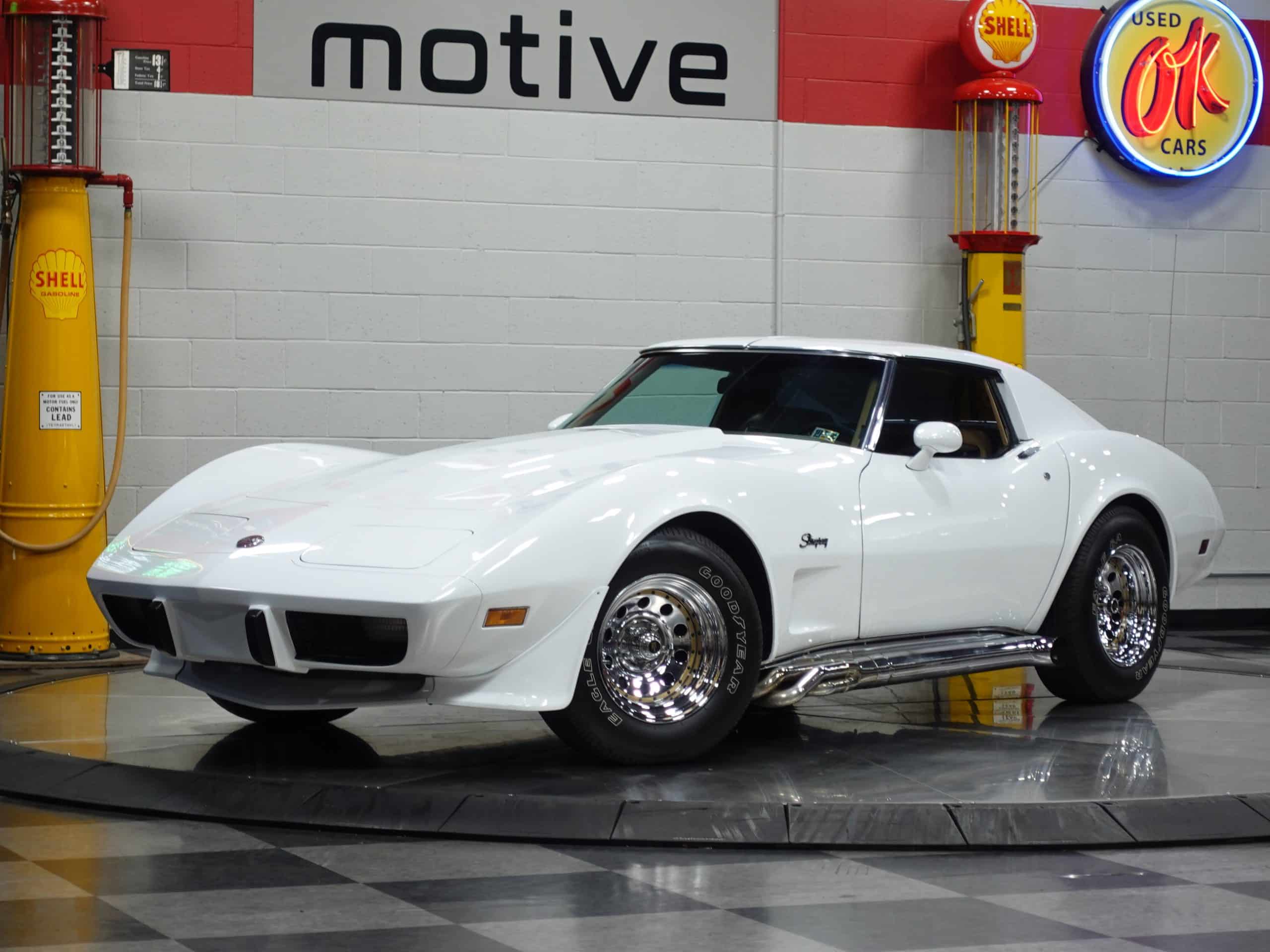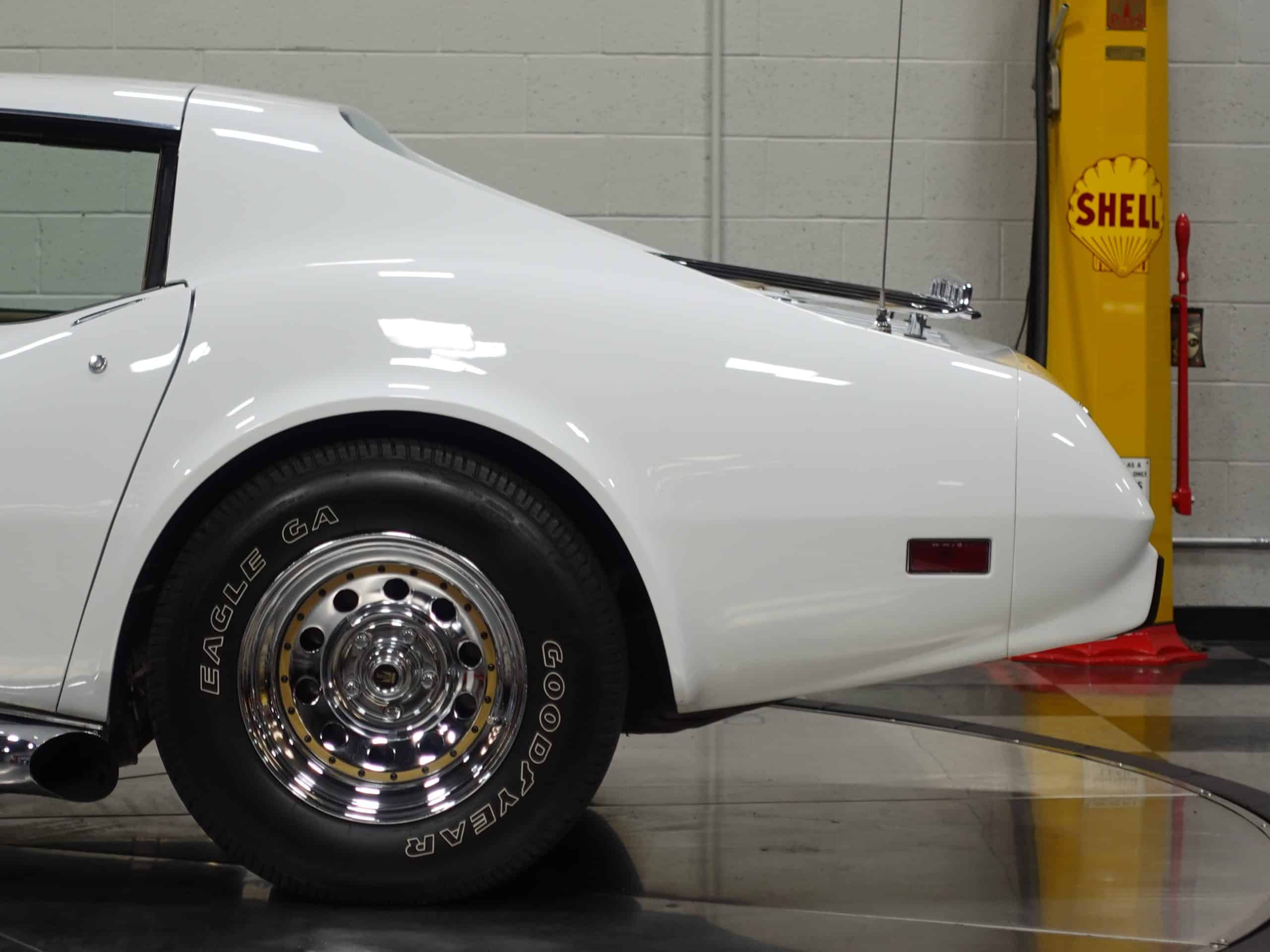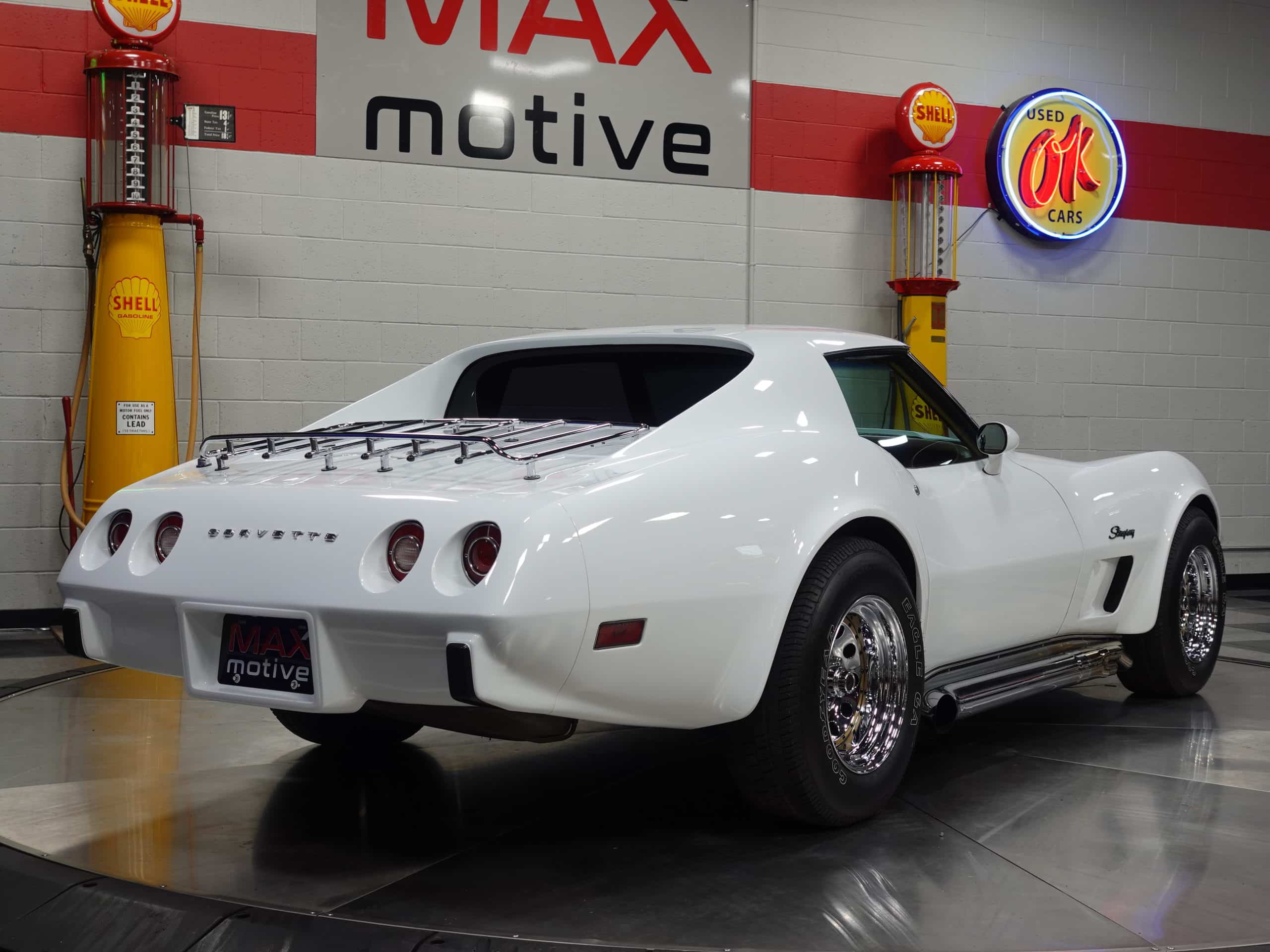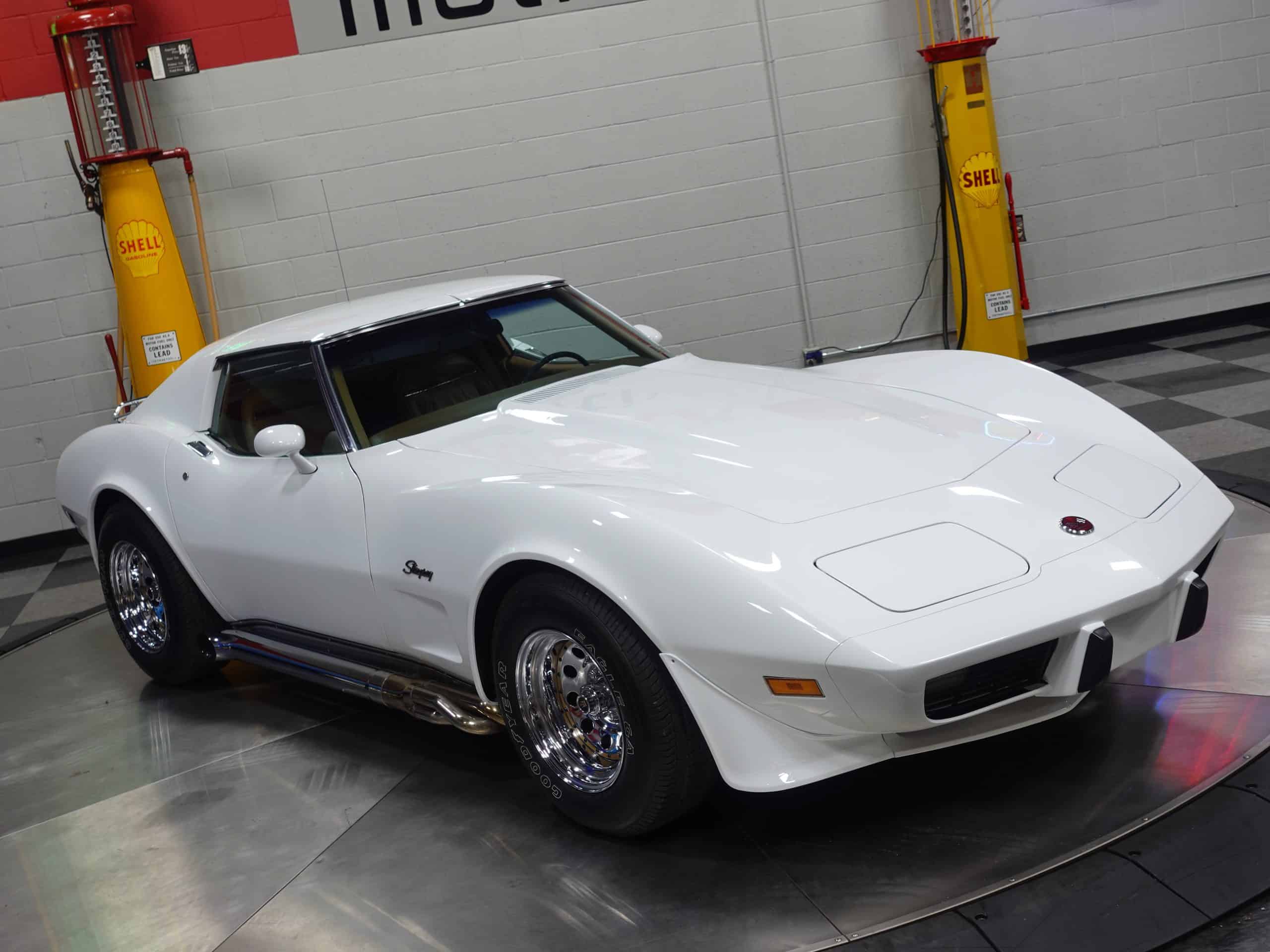 Here’s a classic hot rod in Classic White, a 1975 Chevrolet Corvette Stingray Coupe available from the MaxMotive Pittsburgh Showroom. It has the classic drivetrain consisting of a 350ci small block with a Holley 4-barrel and chrome Hooker Super Competition headers dumping into chrome side pipes, and a four-speed manual transmission with Hurst T-handle shifter. Chrome Keystone wheels are wrapped in outline white letter Goodyear Eagle radials. The Medium Saddle interior shows that this is an original air conditioned car, and a Sun Super Tach II and a SoundStream stereo with cassette have been added. It comes with the vinyl bags for the T-roofs for sunny-day cruising. This 1975 Chevrolet Corvette Stingray Coupe is ready for miles of cruising enjoyment. Be sure to check out the detailed photos at www.maxmotive.com.