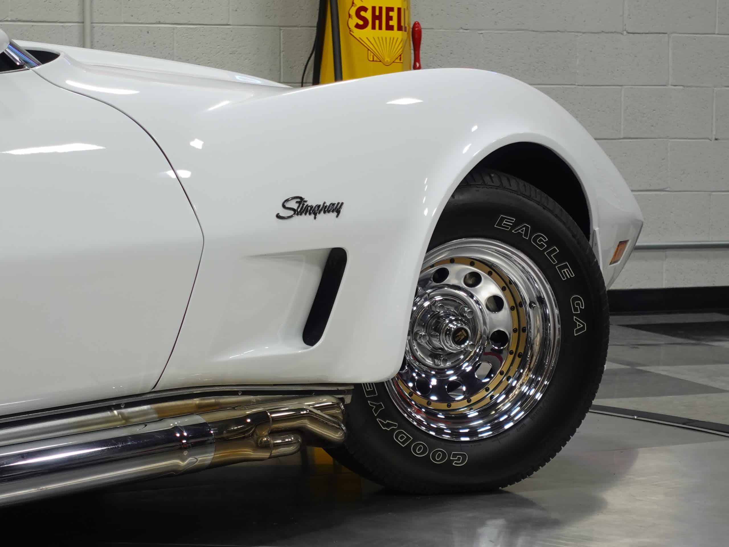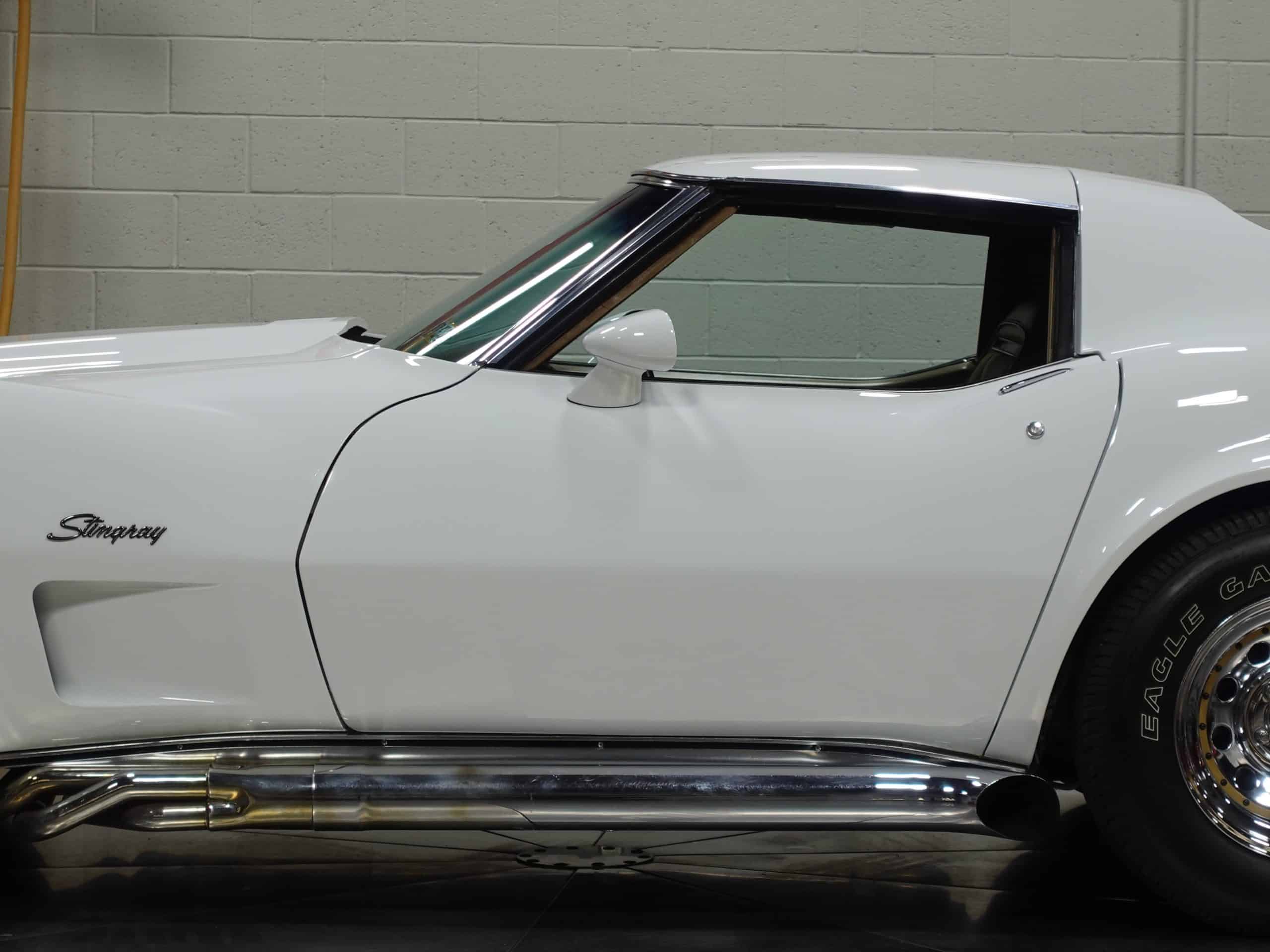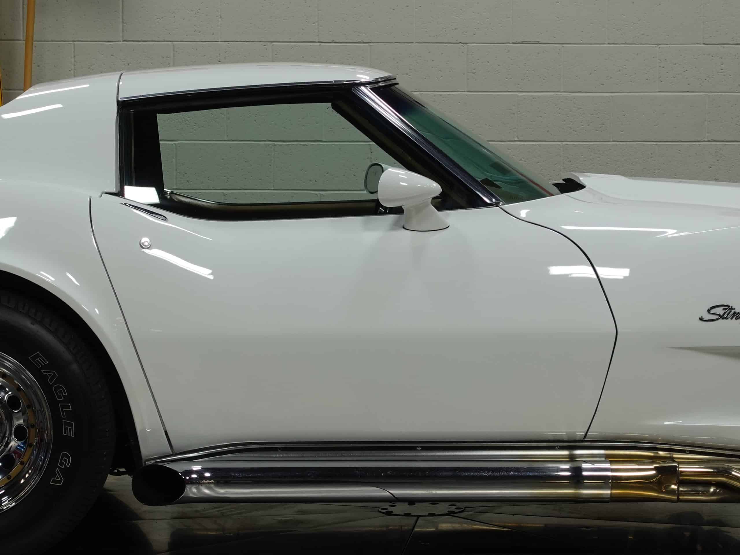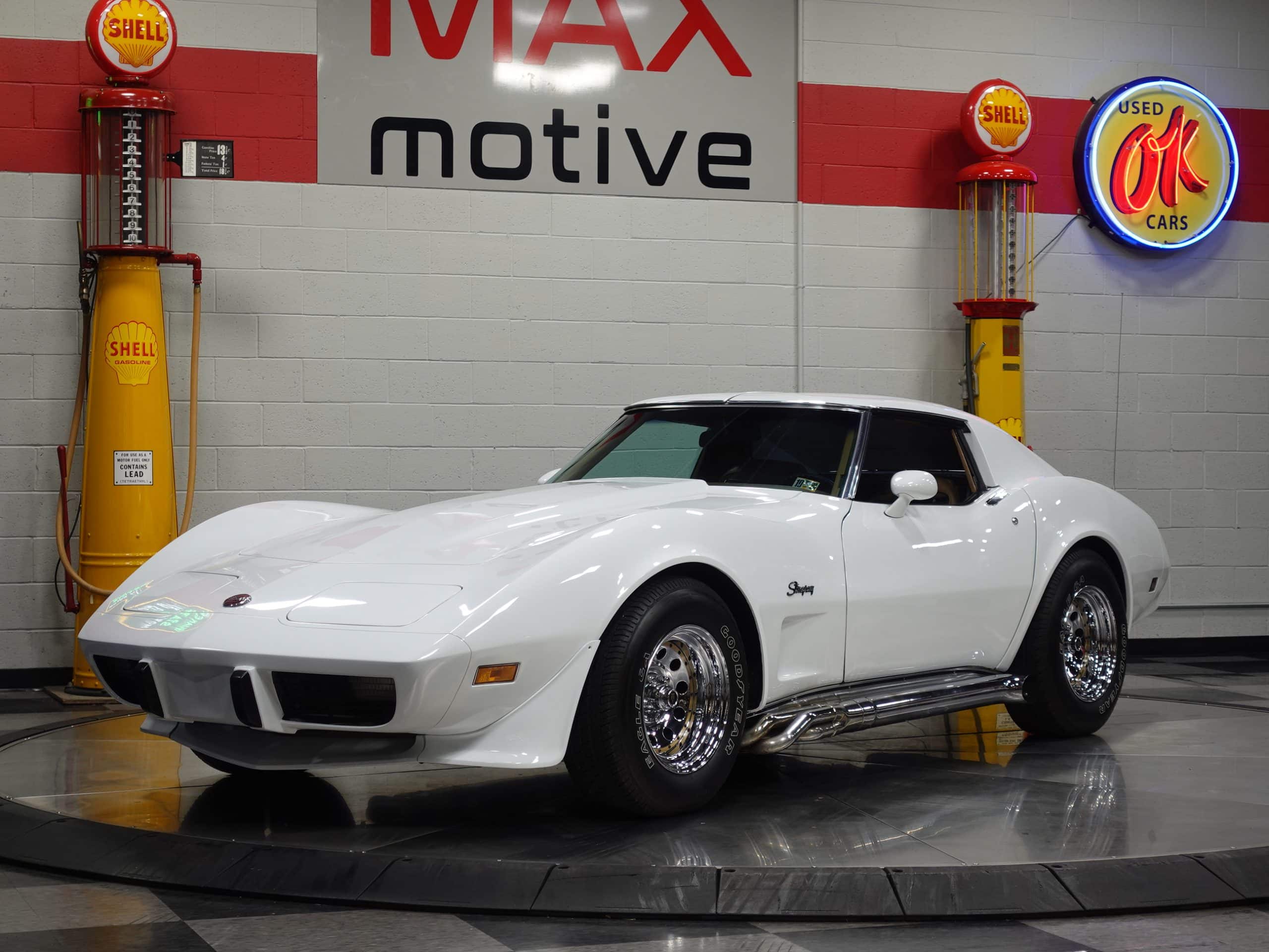 Here’s a classic hot rod in Classic White, a 1975 Chevrolet Corvette Stingray Coupe available from the MaxMotive Pittsburgh Showroom. It has the classic drivetrain consisting of a 350ci small block with a Holley 4-barrel and chrome Hooker Super Competition headers dumping into chrome side pipes, and a four-speed manual transmission with Hurst T-handle shifter. Chrome Keystone wheels are wrapped in outline white letter Goodyear Eagle radials. The Medium Saddle interior shows that this is an original air conditioned car, and a Sun Super Tach II and a SoundStream stereo with cassette have been added. It comes with the vinyl bags for the T-roofs for sunny-day cruising. This 1975 Chevrolet Corvette Stingray Coupe is ready for miles of cruising enjoyment. Be sure to check out the detailed photos at www.maxmotive.com.