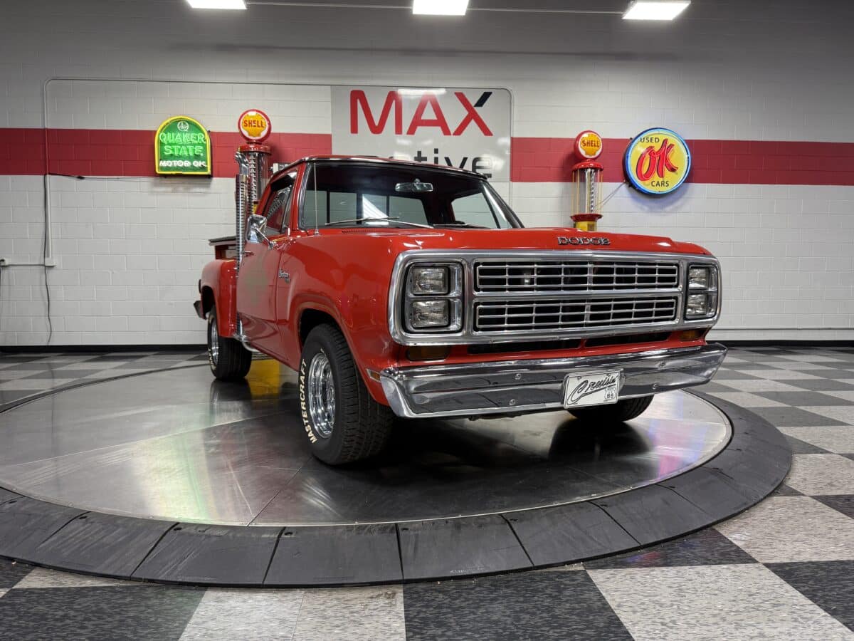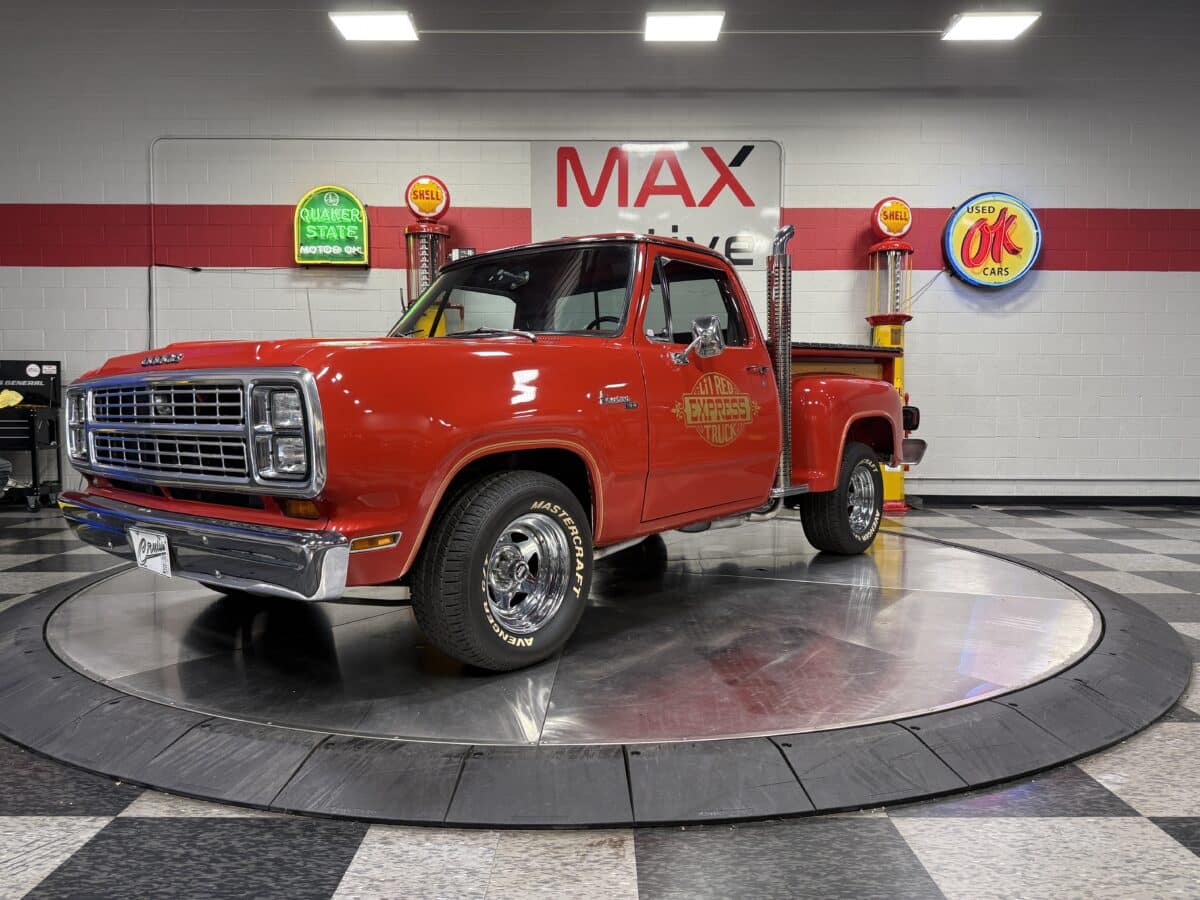 Maxmotive is proud to offer this rare, limited edition run 1979 Dodge D150 Lil Red Express truck.  These awesome trucks were manufactured for two years, 1978 and 1979.  This 1979 version is one of 5,118 made in 1979.  In 1979 there were some appearance upgrades compared to the 1978 models.  This 1979 Lil Red Express has the flat hood and dual square headlights versus the 1978 models.  The D150 is powered by a 5.9L 360 V-8 engine, paired to a 727 3 speed automatic transmission. The exterior of the truck is distinctly set off by the gold lettering, wood paneling on the bed side and tail gate, and the iconic vertical exhaust stacks.  Chrome front and rear bumpers match the side stack exhaust. The inside cabin has the 85 MPH speedometer that debuted in 1979.  A red bench seat, paired to red door panels completes the trucks beautifully appointed age appropriate interior.  A class three trailer hitch means, this truck is not only a showstopper, but ready to tow that trailer for you as well.  For more pictures and information please visit our website at www.maxmotive.com
