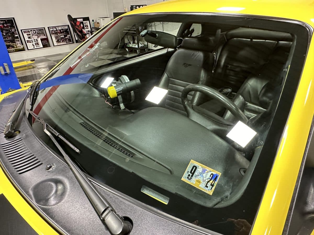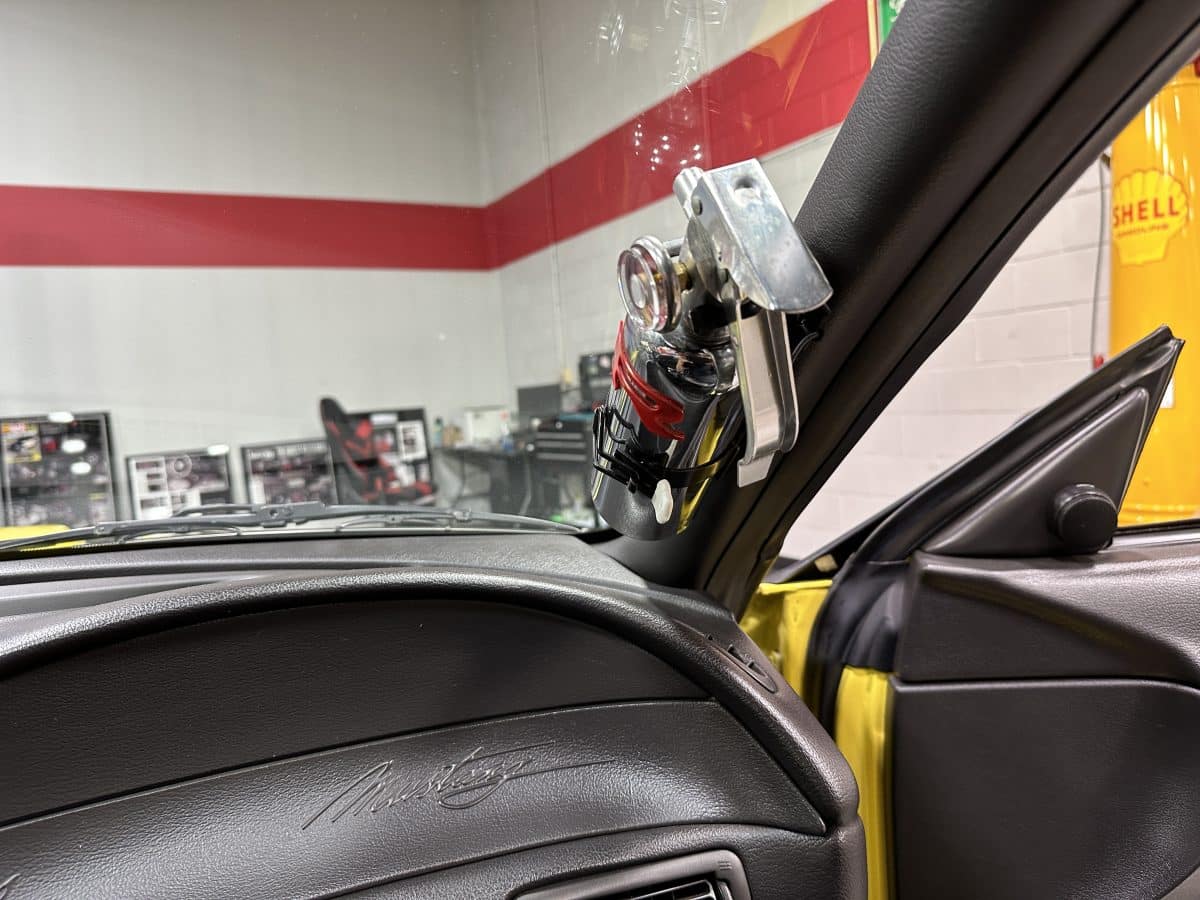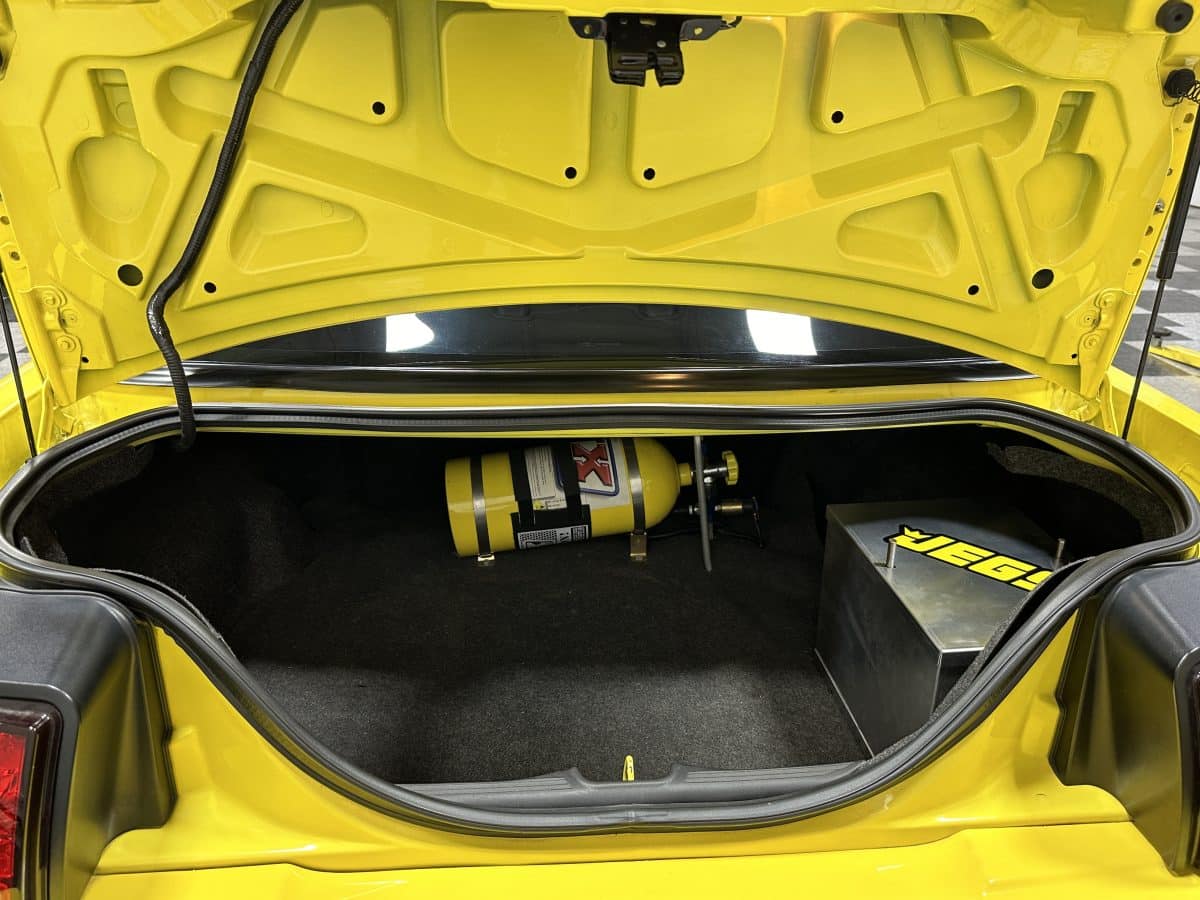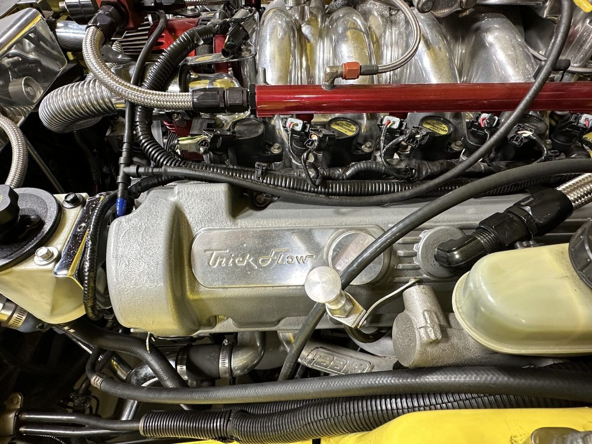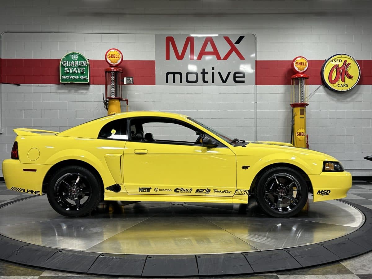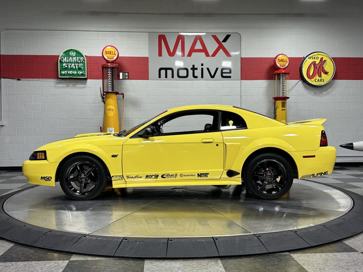 This thoroughly tricked out 2000 Ford Mustang GT Coupe is now available at MaxMotive. With special equipment ranging from NX nitrous oxide to a tubular front suspension, the car is sorted out and ready for action. A fully forged shortblock from Modular Motorsports Racing with an upgrade to ARP main studs provides a solid foundation. It’s the MMR Street Mod 900 SE 4.75 L Stroker. Also on board is a Stage 3X MMR S/C cam plus an MMR stainless SOHC valve kit. Chassis mods include tubular a-arms and Lakewood coilovers. Rolling stock consists of Continental ExtremeContact DW ultra performance 3-season tires in the rear, size 285/40ZR17 and trick M&H Racemaster fronts, 185/55R17, on staggered blacked-out Race Star five-spoke alloy wheels. It comes with an SCT tuner, a pillar mounted fire bottle, plus an AutoMeter Carbon Fiber Monster Tach with shift light and AutoMeter auxiliary gauges.