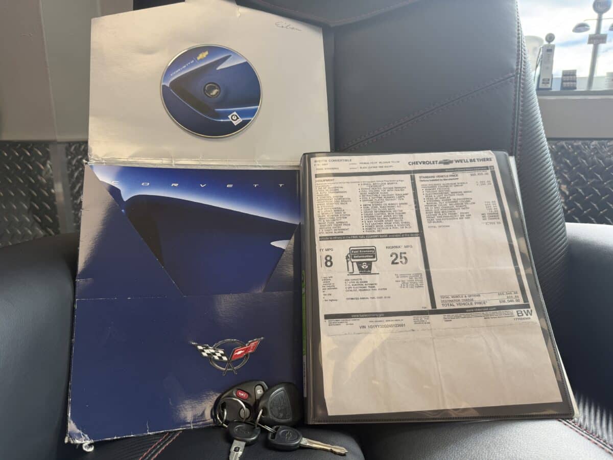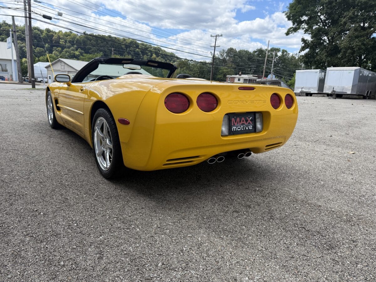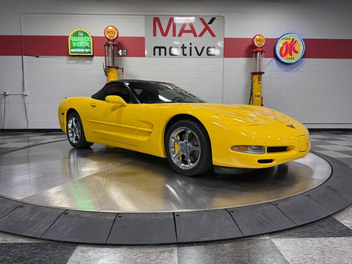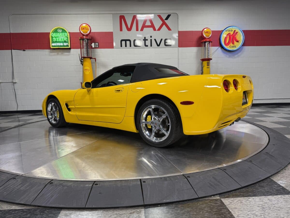 Maxmotive is proud to offer this 2004 Corvette C5 convertible. Finished in beautiful millennium yellow, this Corvette is powered by the revered LS1 V-8 engine producing 350 horsepower. The rear mounted transmission is a 4 speed 4L60E paired to a 3.15 rear differential. The Corvette stance is set off by OEM 5 spoke Corvette rims, 17” wheels up front, and 18” wheels in the rear. The convertible top is in great condition. The inside cabin greets the driver with creature comforts such Bose speakers, in dash CD player, a trunk mounted OEM CD stacker, all paired with a power antenna. Memory functions for the seats and mirrors nicely compliment the dual power Corvette sports seats. Heads up display, power telescoping steering column, and Weathertech floor mats add to the creature comforts for the driver. Window sticker, owners manual, and maintenance records along with 2 sets of keys show the care this Corvette has been under. Only 2 owners since new. For more pictures and information please check our website at www.maxmotive.com