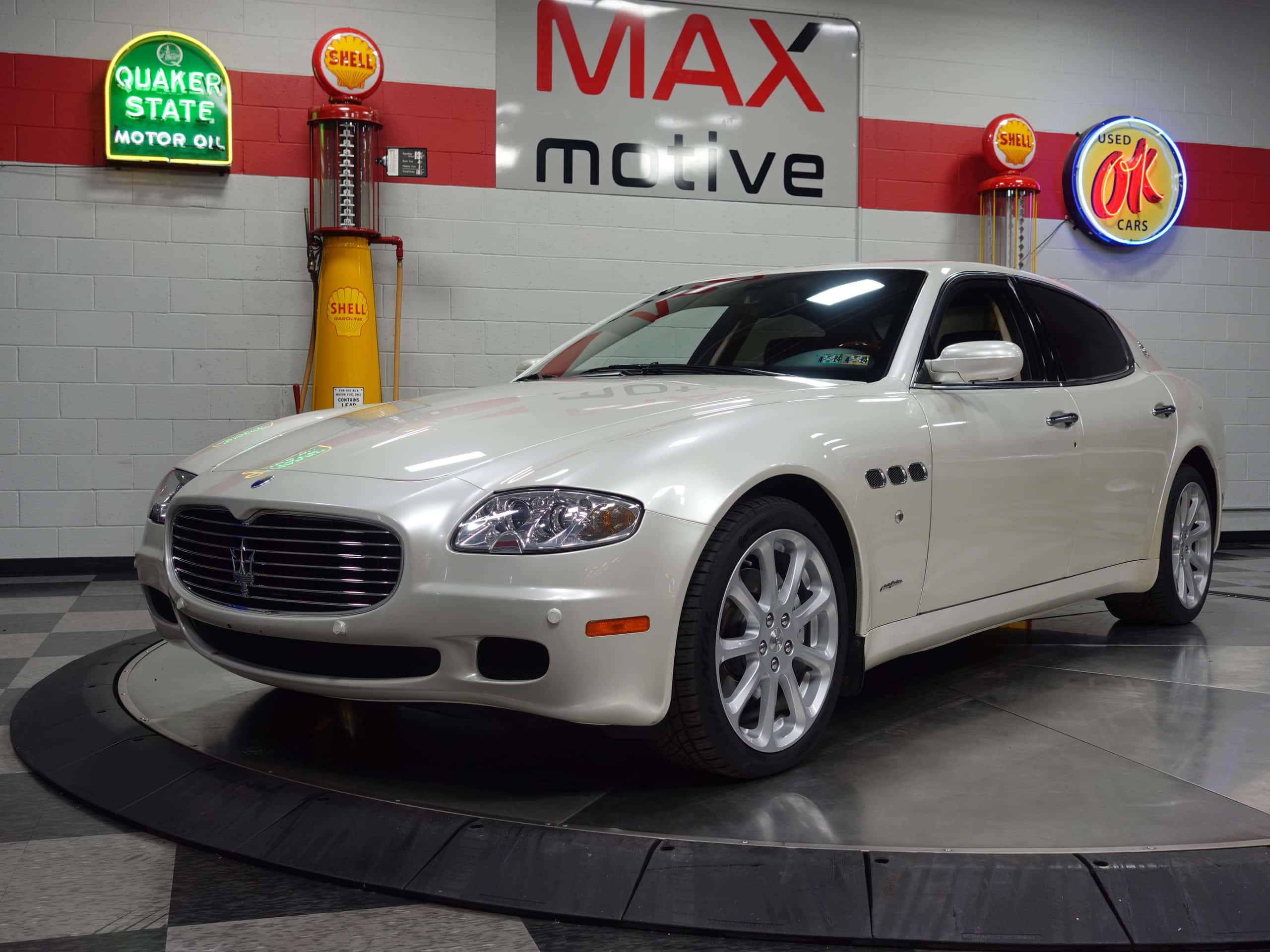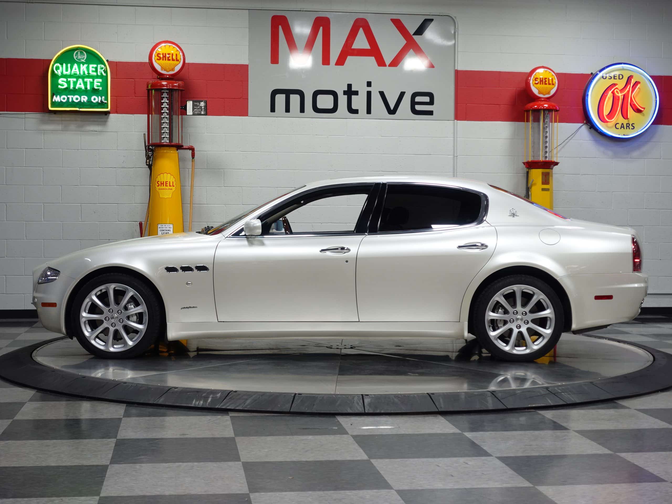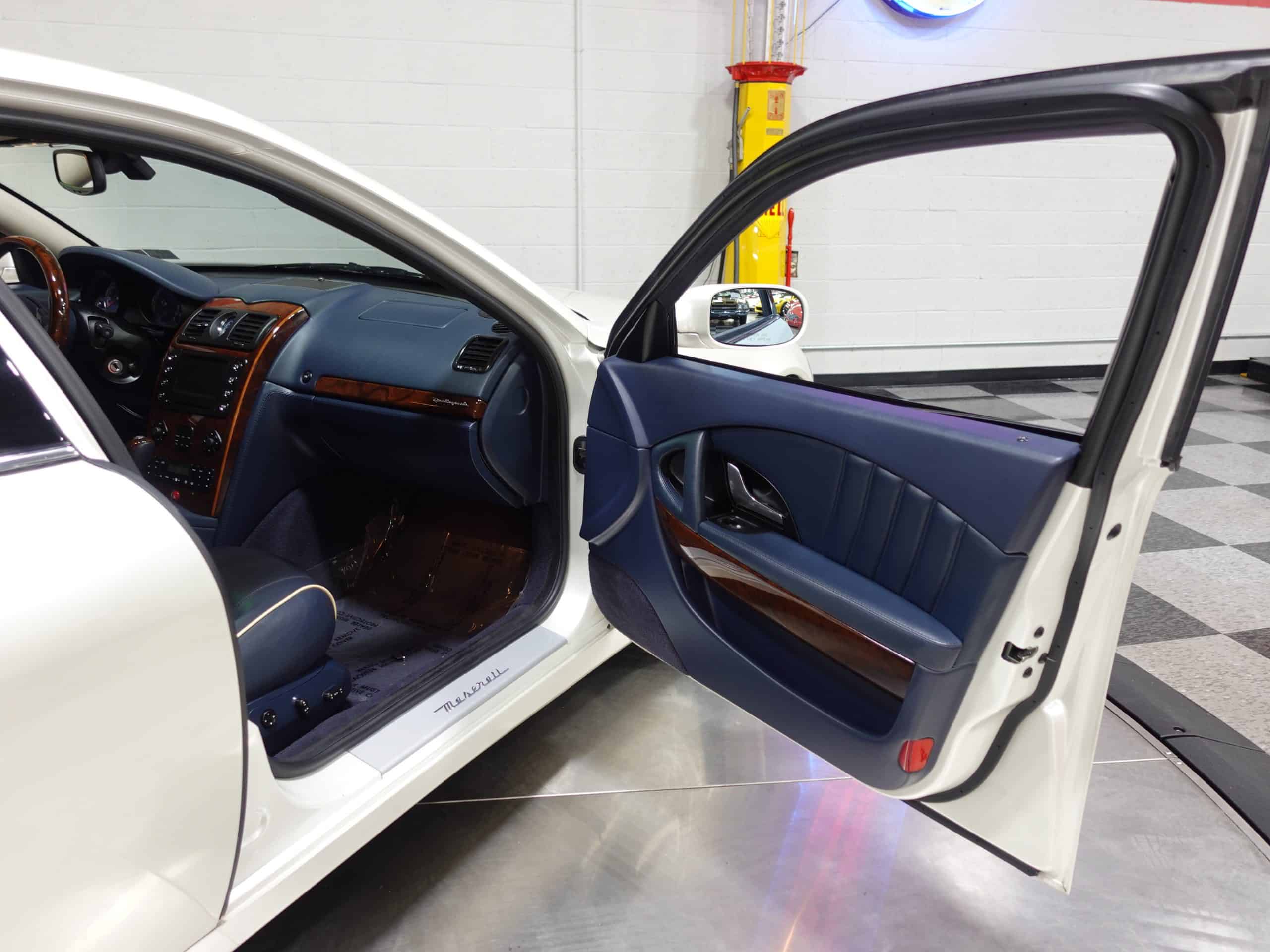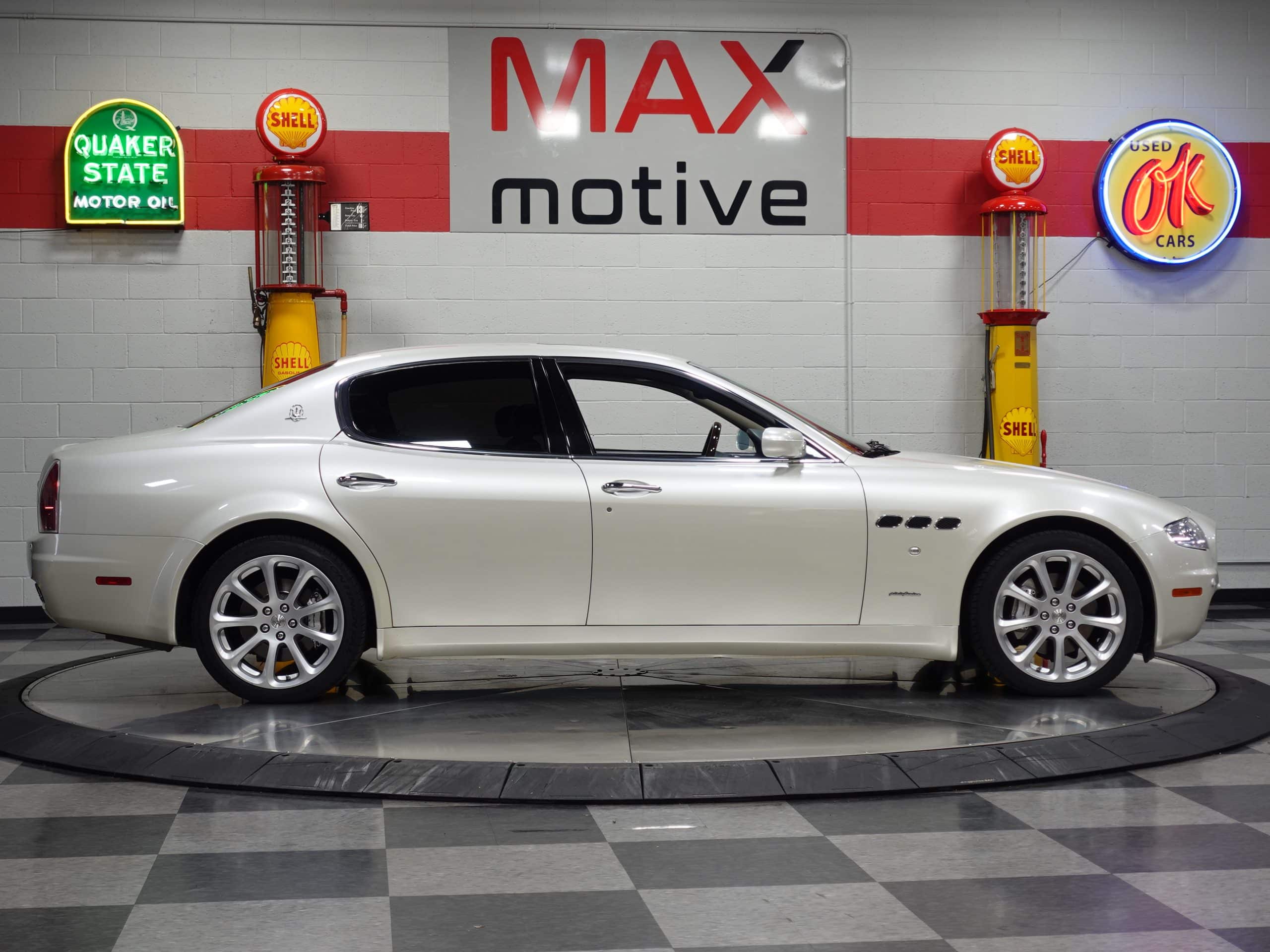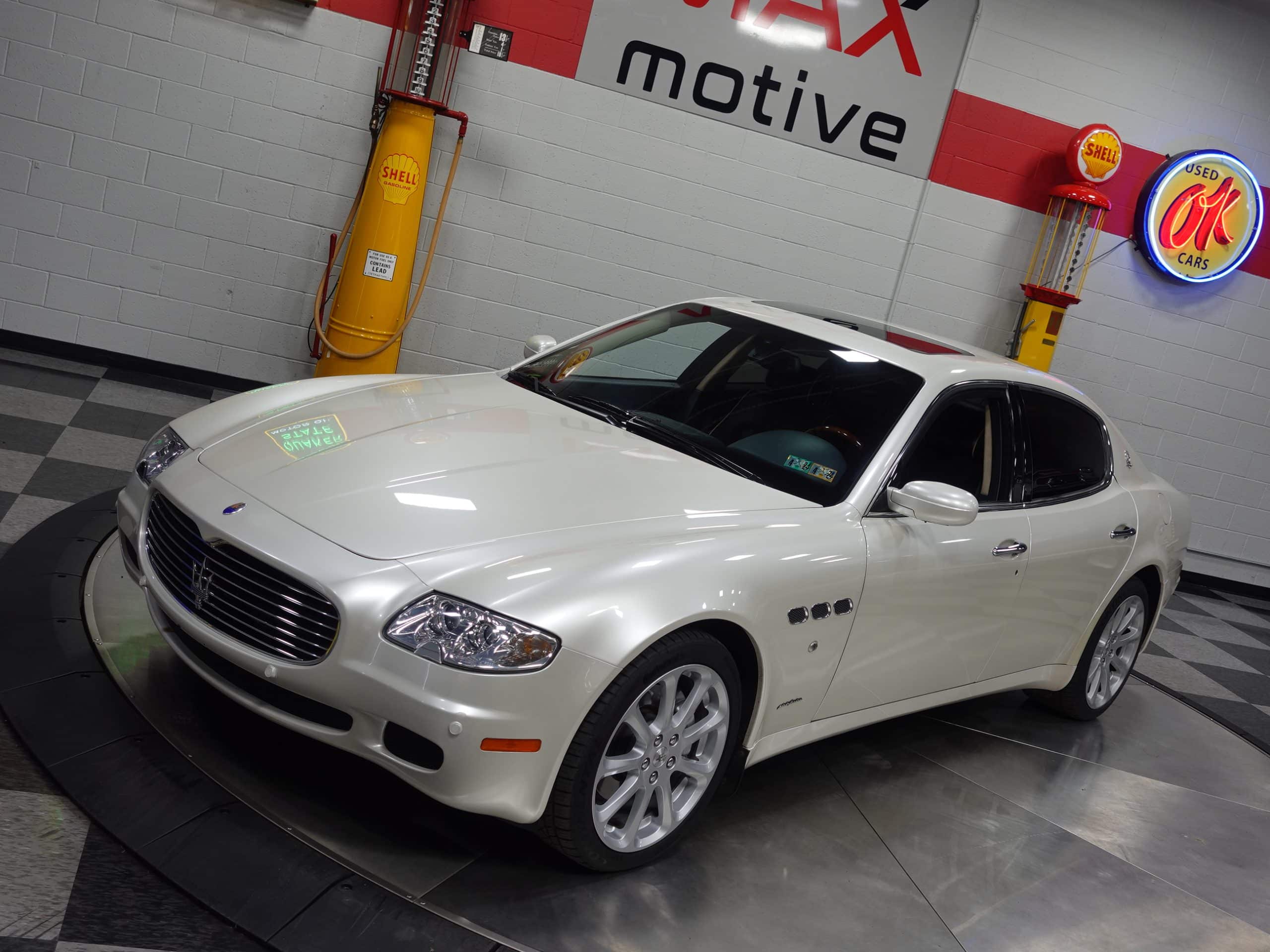 This is a 2008 Maserati Quattroporte Executive GT Sedan, which is now available from the MaxMotive Pittsburgh Showroom. Smooth power delivery comes courtesy of 2008’s newly developed 4.7L 4-valve V8 generating 439 horsepower. A ZF sourced electronic automatic gearbox features 6 speeds, sport mode, Ice (low grip) mode, and manual mode. The car shows off the unique Bianco Fuji Pearlescent exterior paint in combination with the Blu Navy leather interior. Special features include power seats front AND rear, navigation, electronic climate control front and rear, and a Bose digital sound system with automatic equalization that will also compensate for ambient noise reaching the cabin. The rear seat passengers can also regulate the climate in the rear of the cabin. Rich wood trim highlights the interior as well. 19-inch aluminum wheels are wrapped in staggered Continental Extreme Contact tires with massive 285/35ZR19s in the rear. Included is the Original Owner’s Package, the original tire inflator kit, and the original tool kit. A true Gran Turismo, this 2008 Maserati Quattroporte Executive GT Sedan represents a formidable combination of high-end luxury and sports car performance. Please be sure to see the detailed photos and videos at www.maxmotive.com.