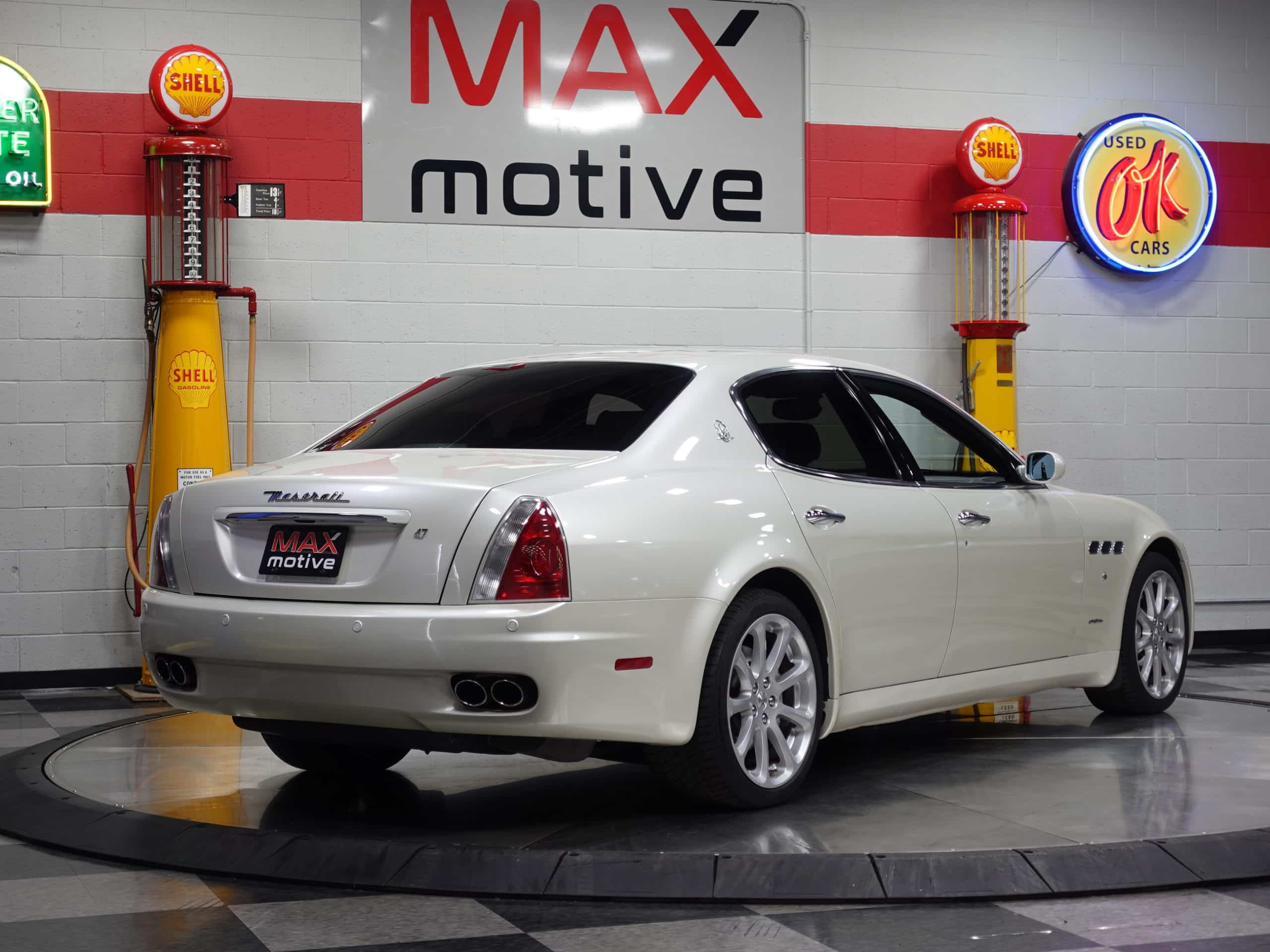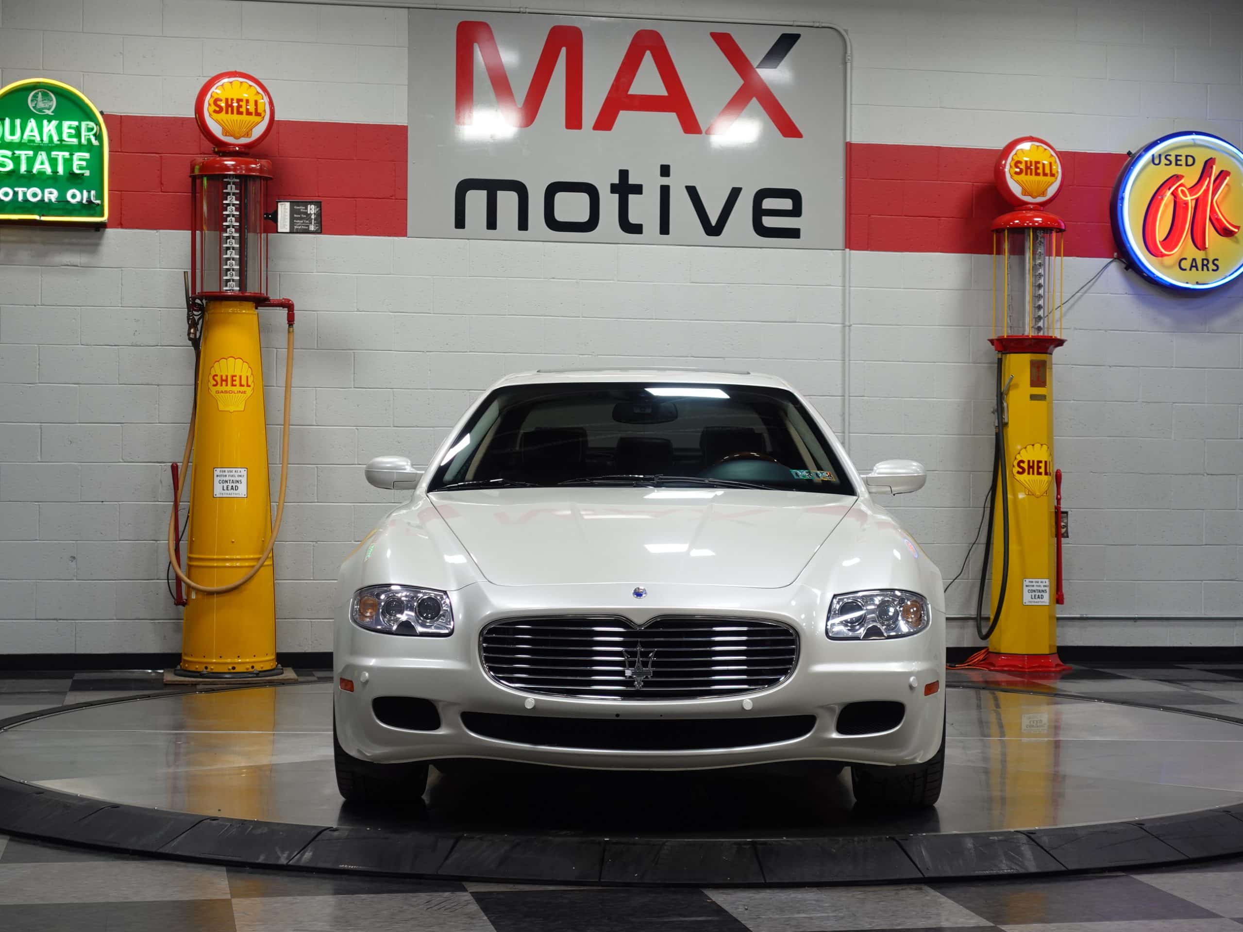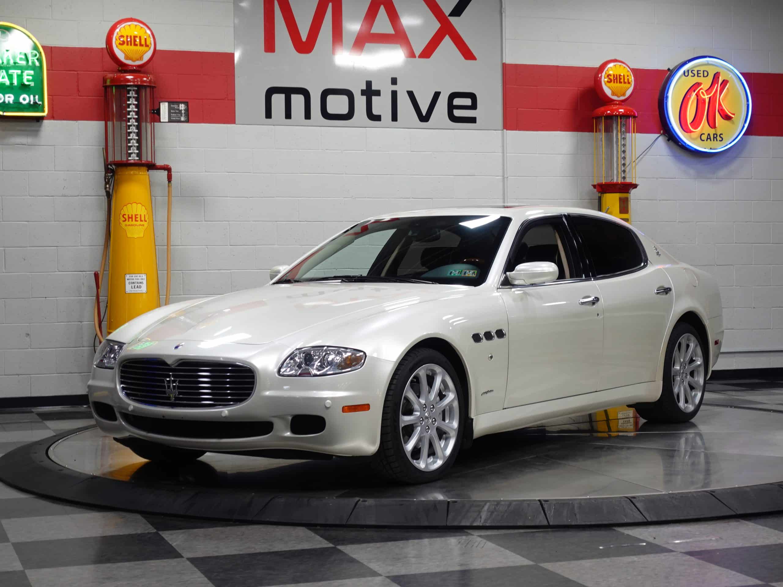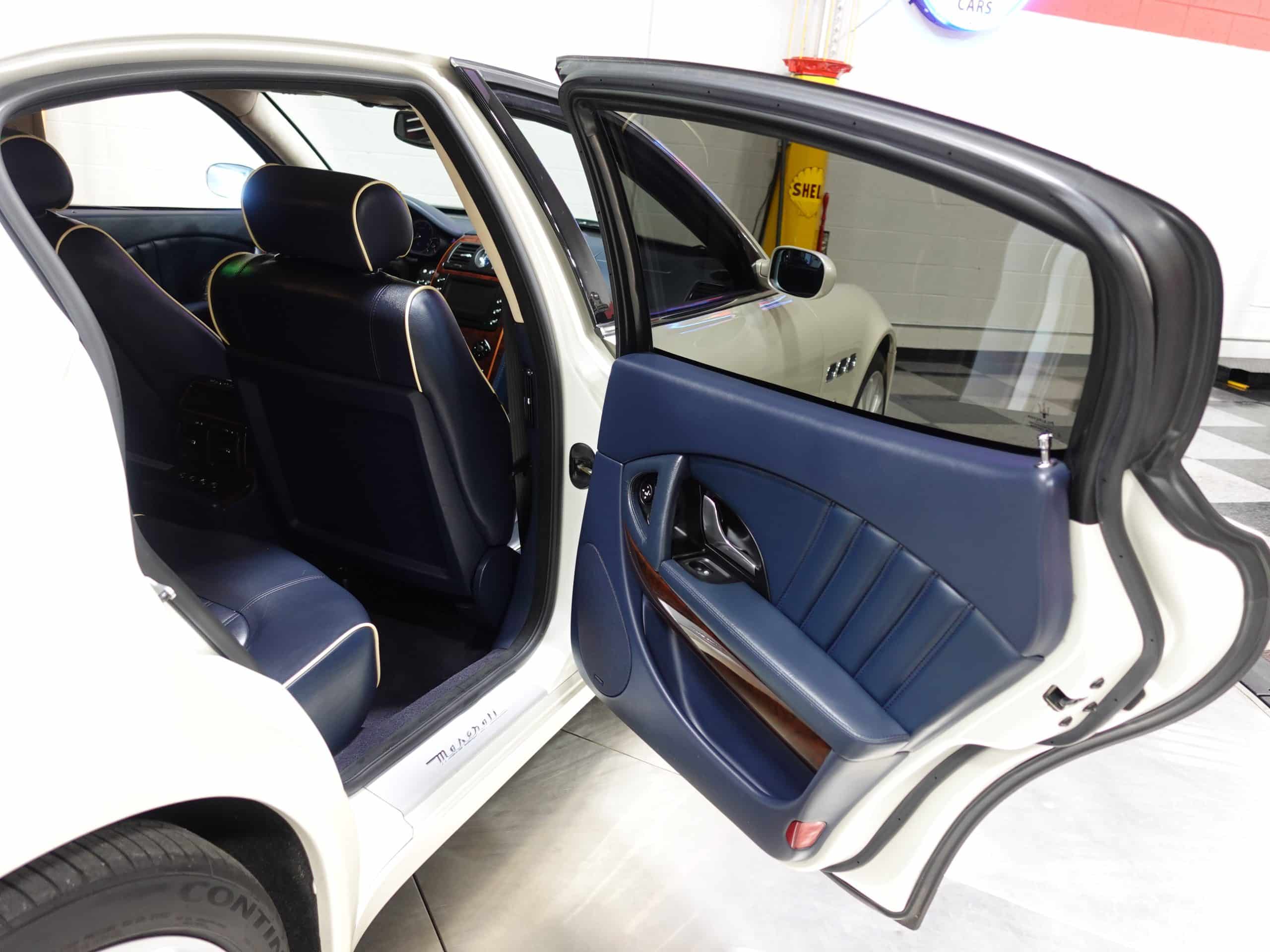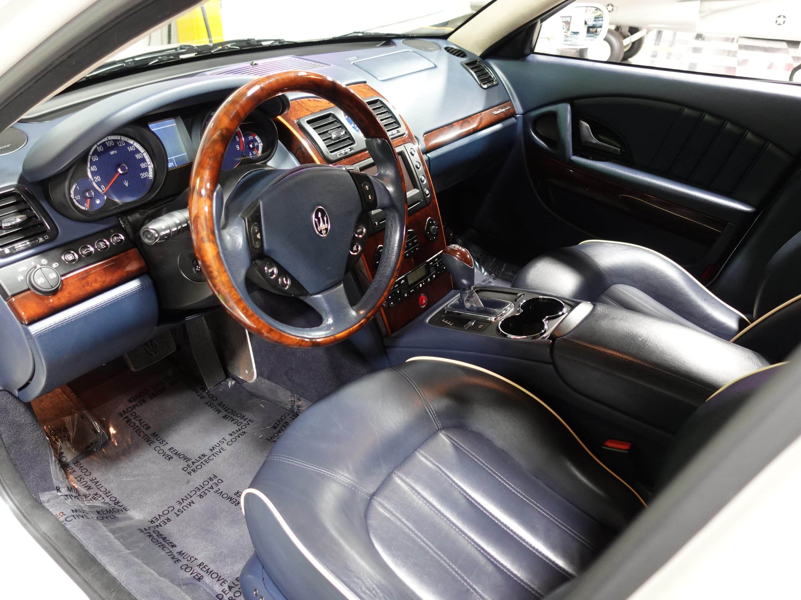 This is a 2008 Maserati Quattroporte Executive GT Sedan, which is now available from the MaxMotive Pittsburgh Showroom. Smooth power delivery comes courtesy of 2008’s newly developed 4.7L 4-valve V8 generating 439 horsepower. A ZF sourced electronic automatic gearbox features 6 speeds, sport mode, Ice (low grip) mode, and manual mode. The car shows off the unique Bianco Fuji Pearlescent exterior paint in combination with the Blu Navy leather interior. Special features include power seats front AND rear, navigation, electronic climate control front and rear, and a Bose digital sound system with automatic equalization that will also compensate for ambient noise reaching the cabin. The rear seat passengers can also regulate the climate in the rear of the cabin. Rich wood trim highlights the interior as well. 19-inch aluminum wheels are wrapped in staggered Continental Extreme Contact tires with massive 285/35ZR19s in the rear. Included is the Original Owner’s Package, the original tire inflator kit, and the original tool kit. A true Gran Turismo, this 2008 Maserati Quattroporte Executive GT Sedan represents a formidable combination of high-end luxury and sports car performance. Please be sure to see the detailed photos and videos at www.maxmotive.com.