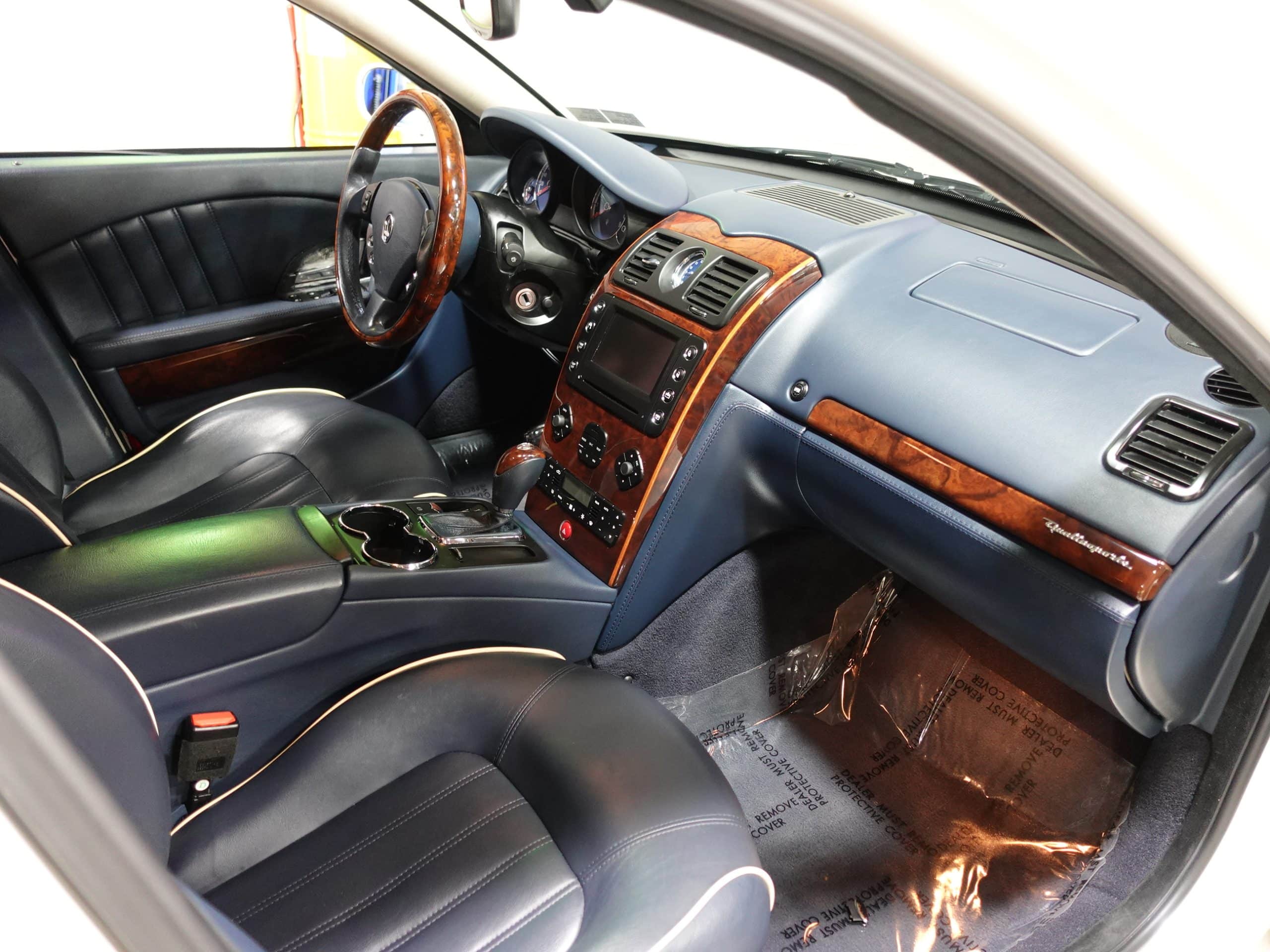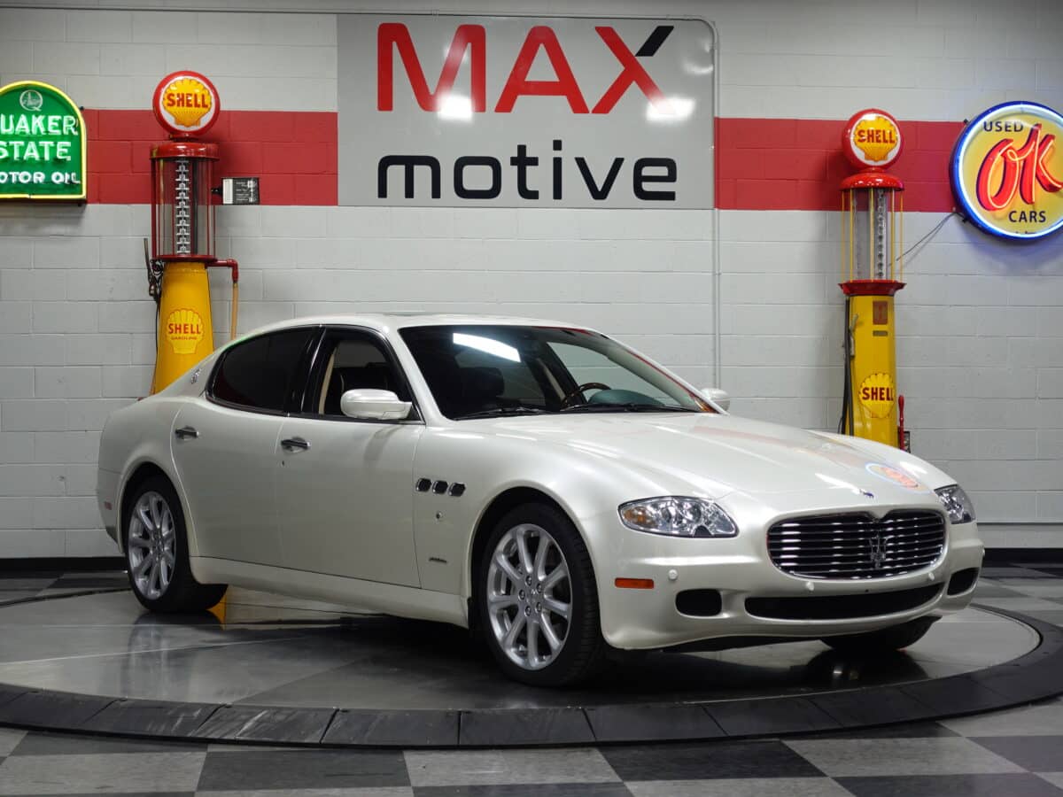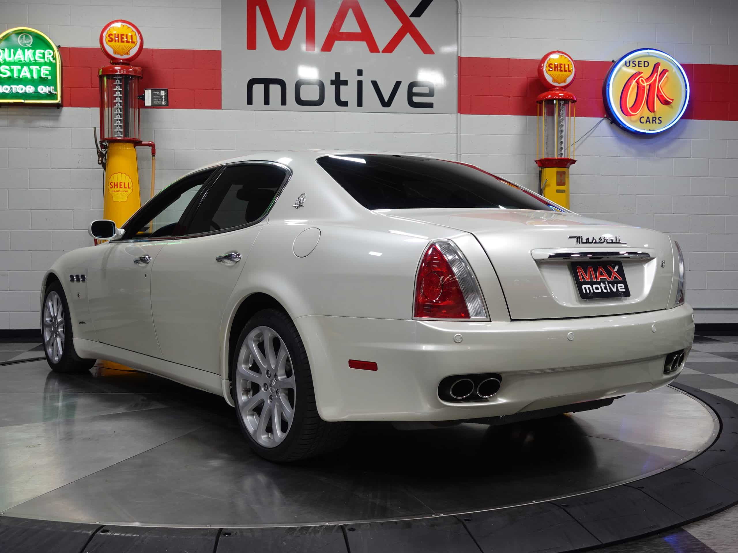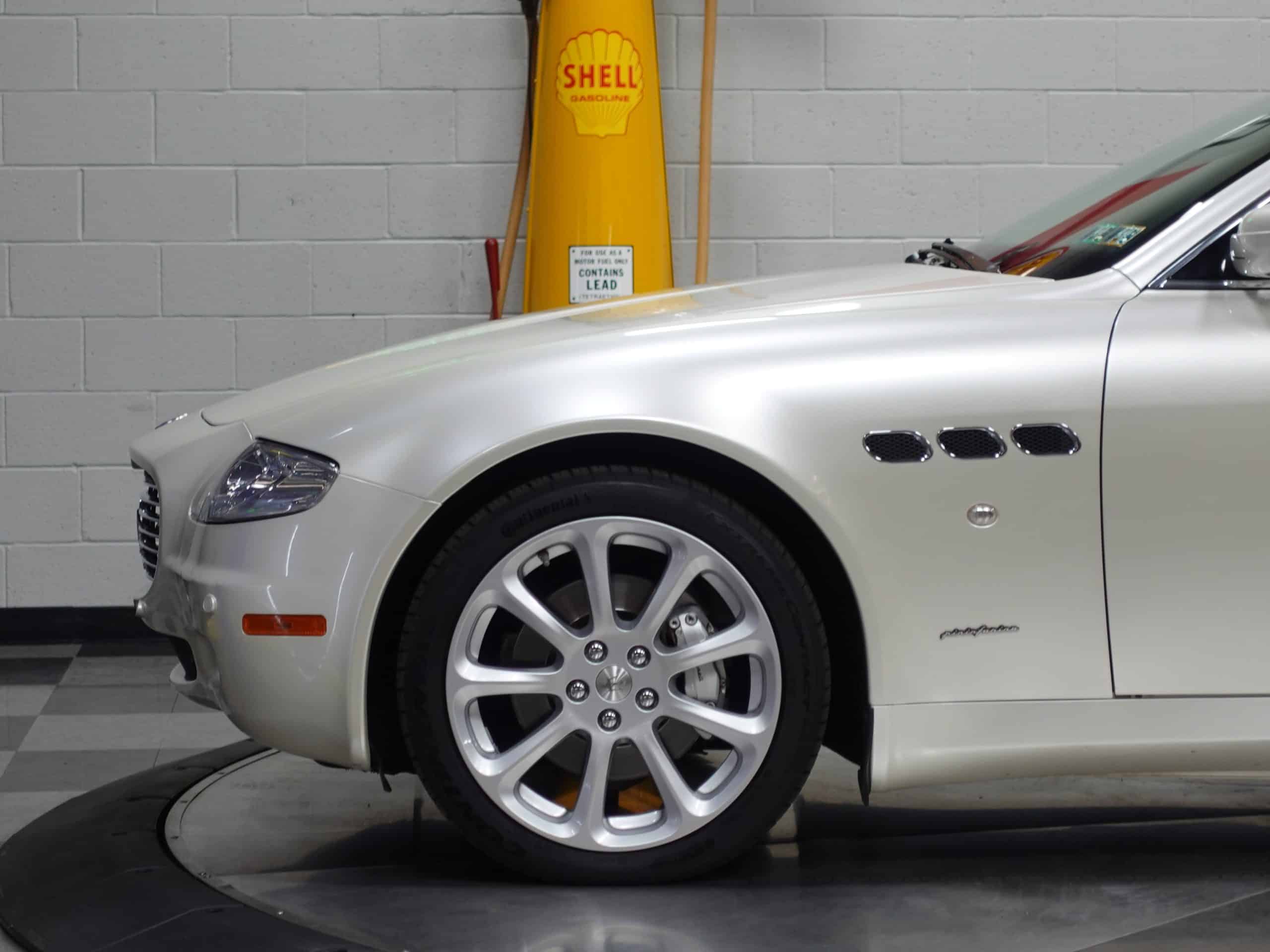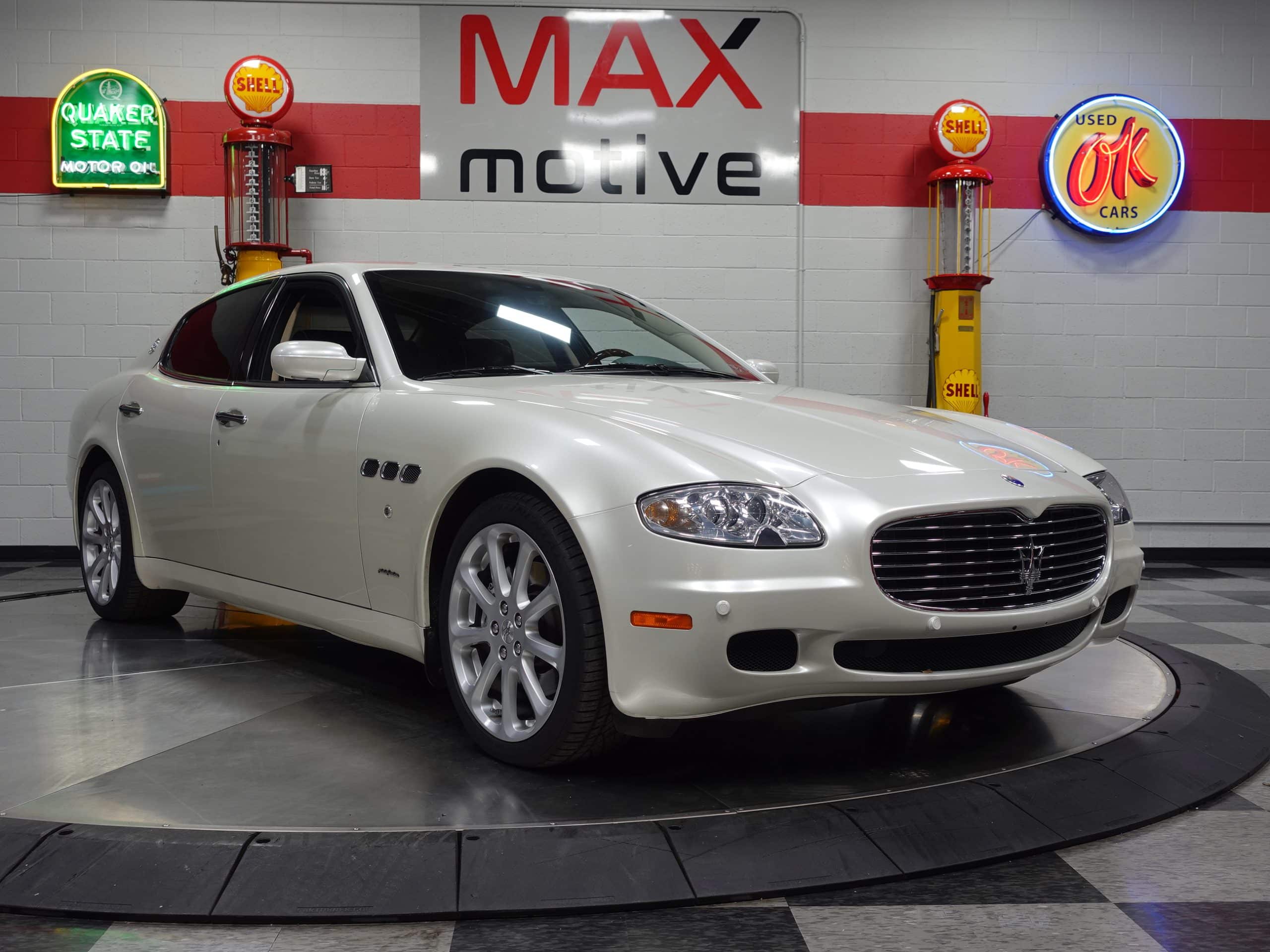 This is a 2008 Maserati Quattroporte Executive GT Sedan, which is now available from the MaxMotive Pittsburgh Showroom. Smooth power delivery comes courtesy of 2008’s newly developed 4.7L 4-valve V8 generating 439 horsepower. A ZF sourced electronic automatic gearbox features 6 speeds, sport mode, Ice (low grip) mode, and manual mode. The car shows off the unique Bianco Fuji Pearlescent exterior paint in combination with the Blu Navy leather interior. Special features include power seats front AND rear, navigation, electronic climate control front and rear, and a Bose digital sound system with automatic equalization that will also compensate for ambient noise reaching the cabin. The rear seat passengers can also regulate the climate in the rear of the cabin. Rich wood trim highlights the interior as well. 19-inch aluminum wheels are wrapped in staggered Continental Extreme Contact tires with massive 285/35ZR19s in the rear. Included is the Original Owner’s Package, the original tire inflator kit, and the original tool kit. A true Gran Turismo, this 2008 Maserati Quattroporte Executive GT Sedan represents a formidable combination of high-end luxury and sports car performance. Please be sure to see the detailed photos and videos at www.maxmotive.com.