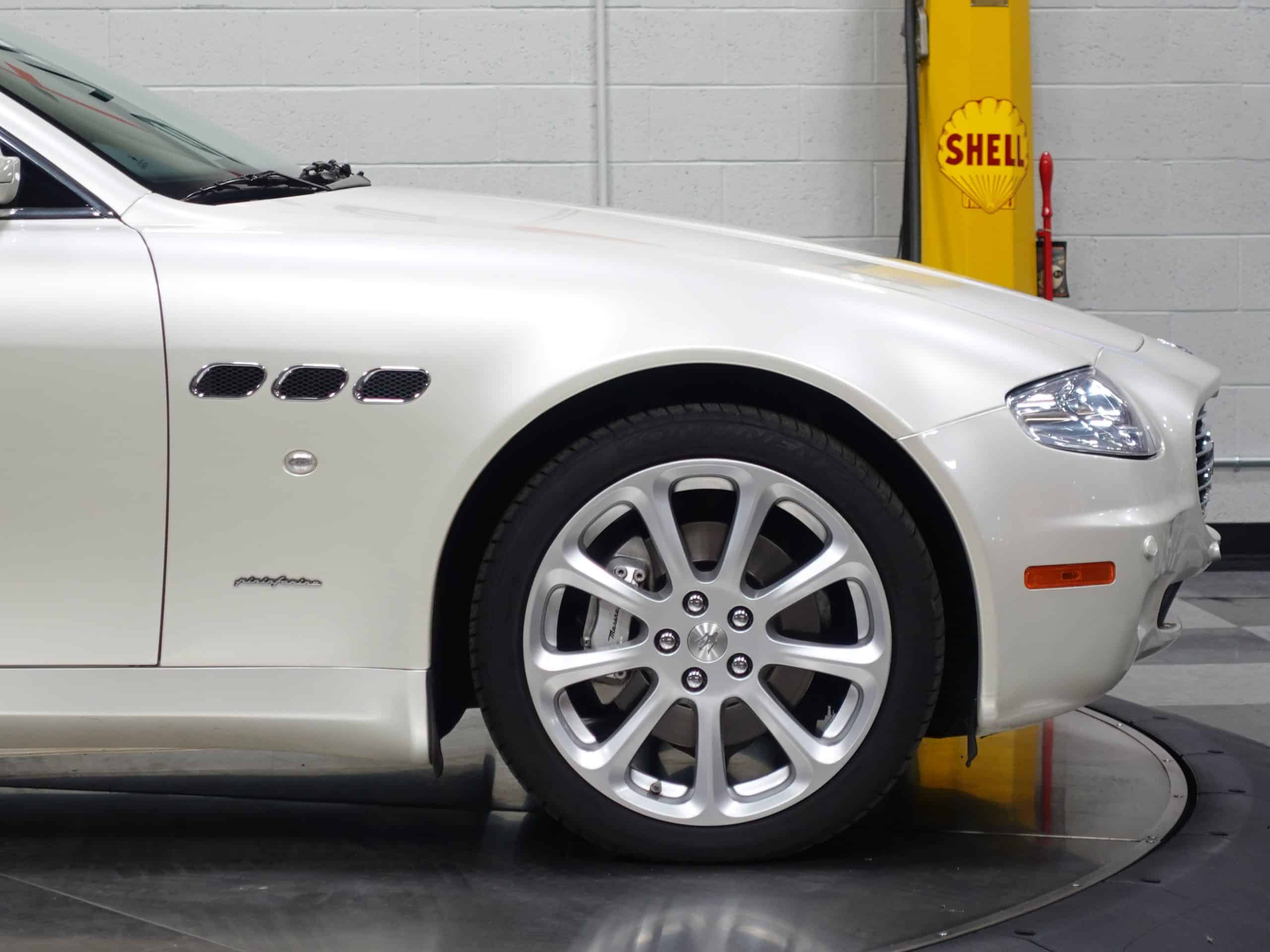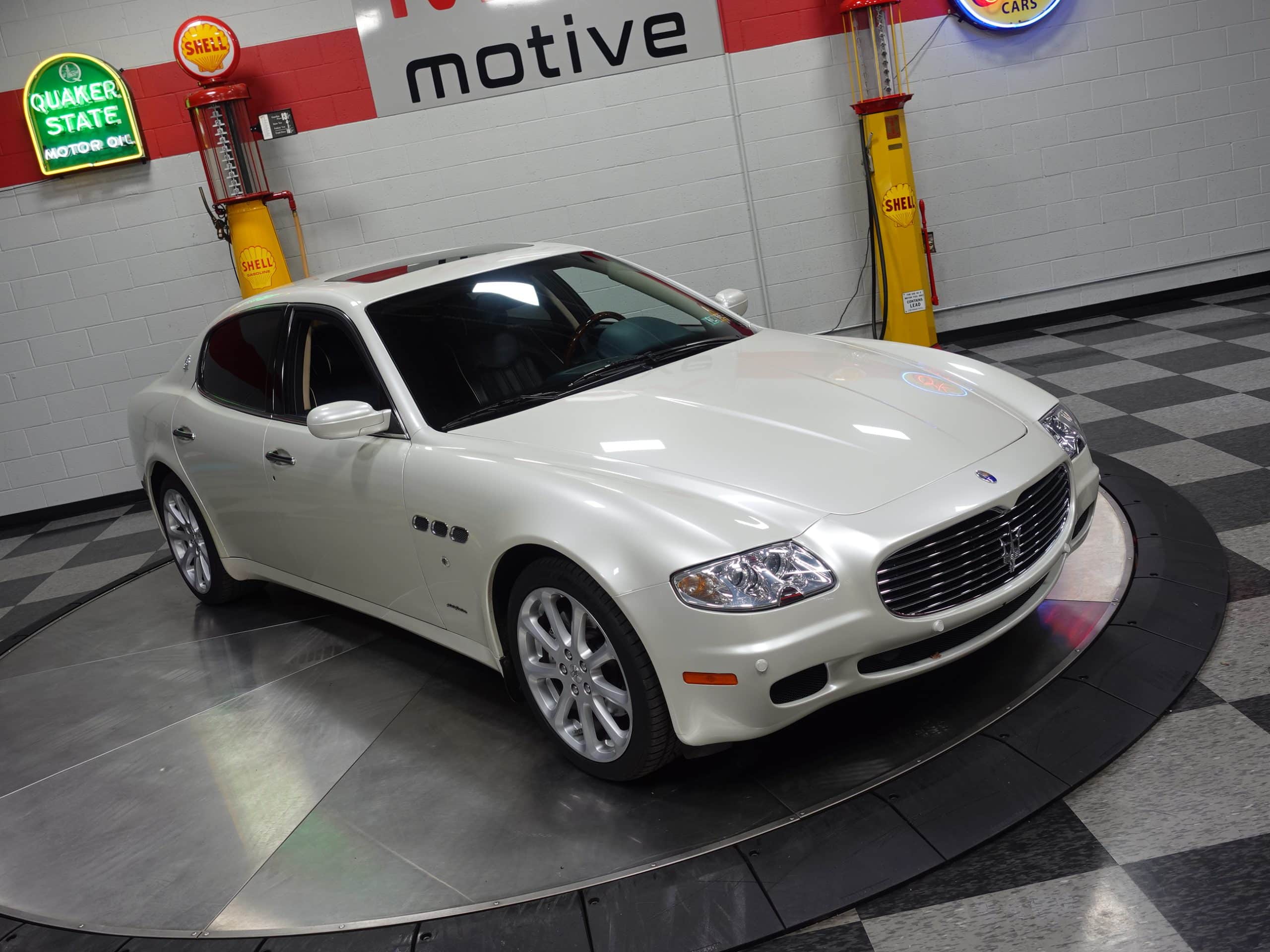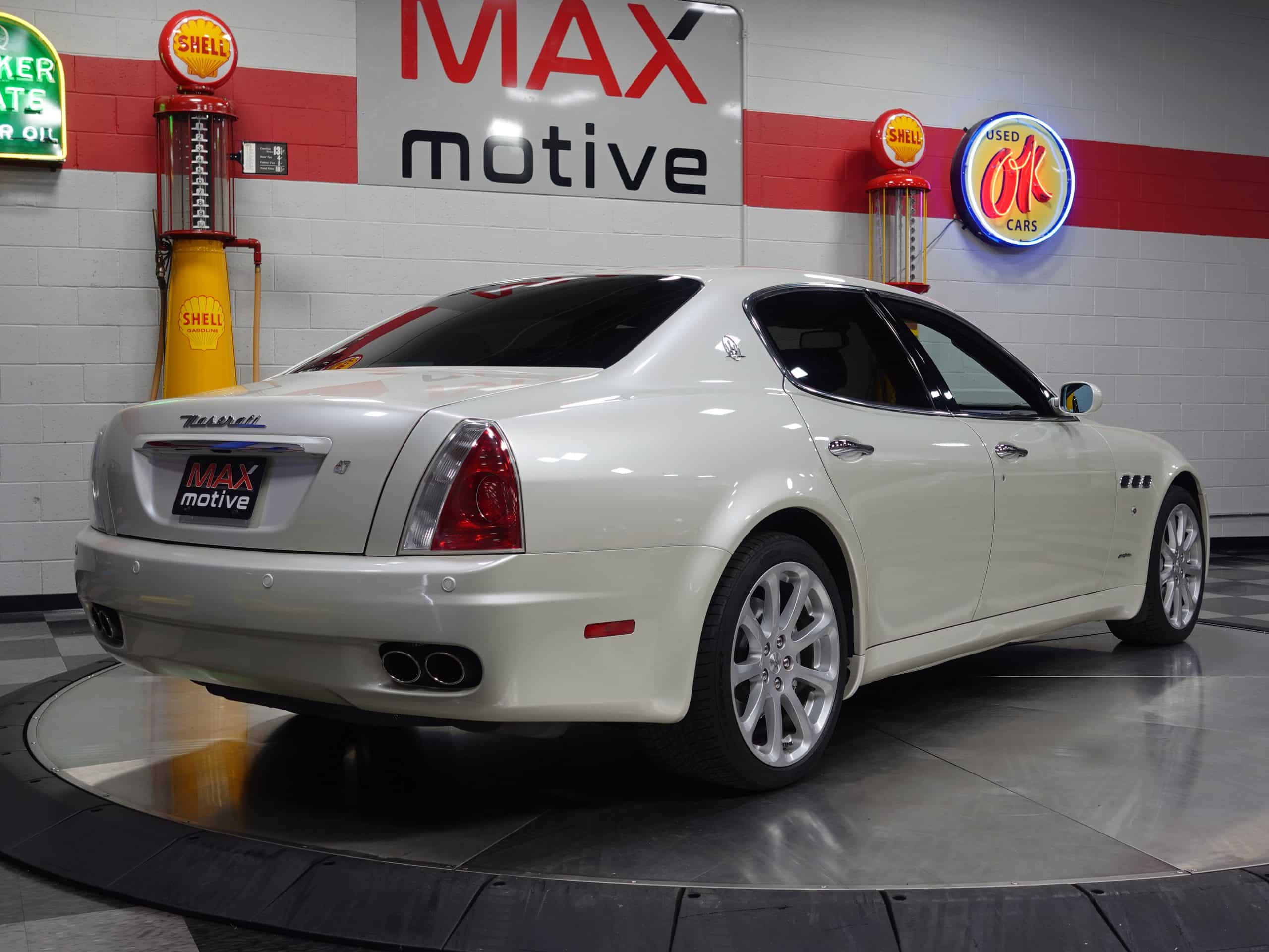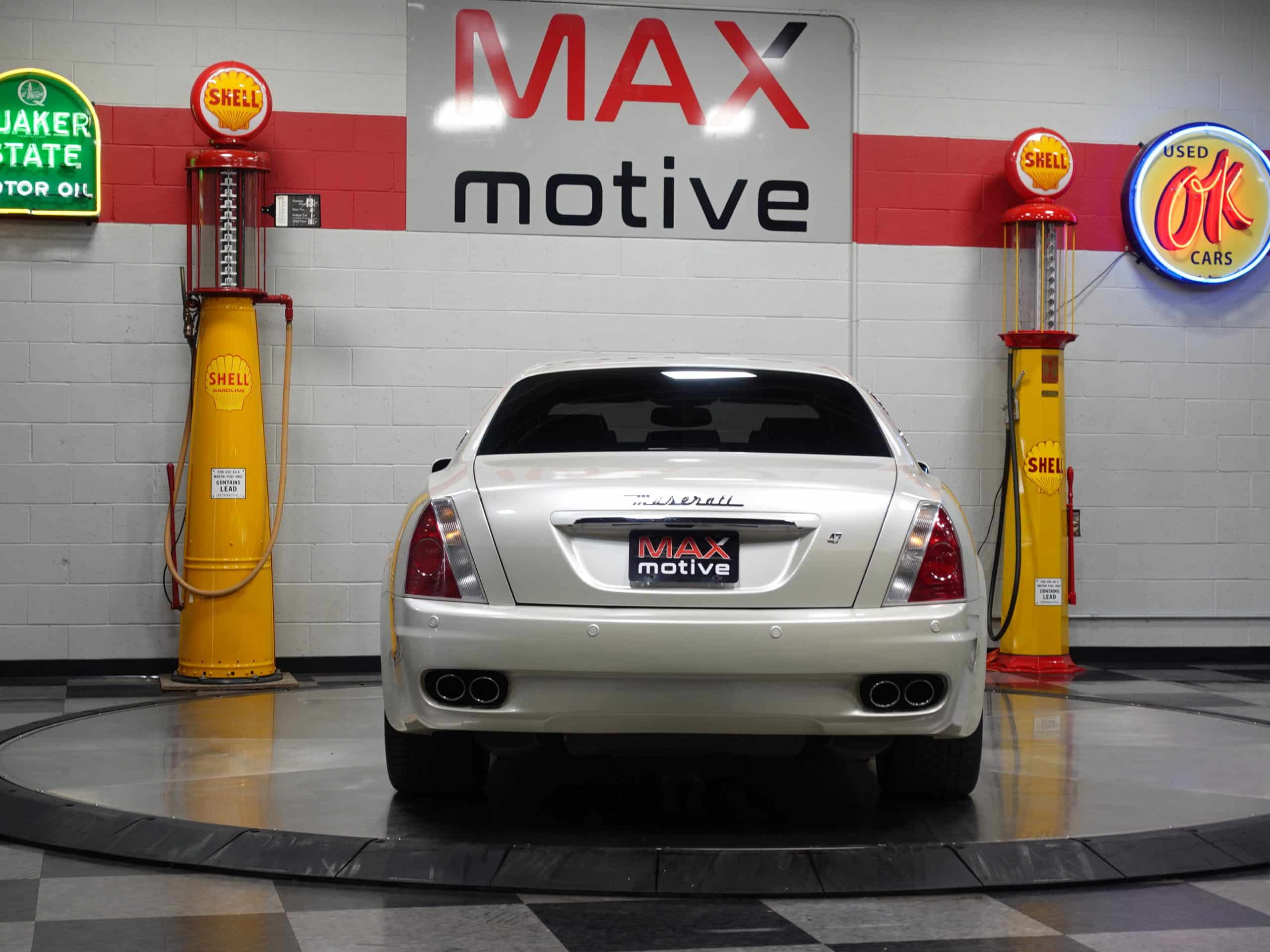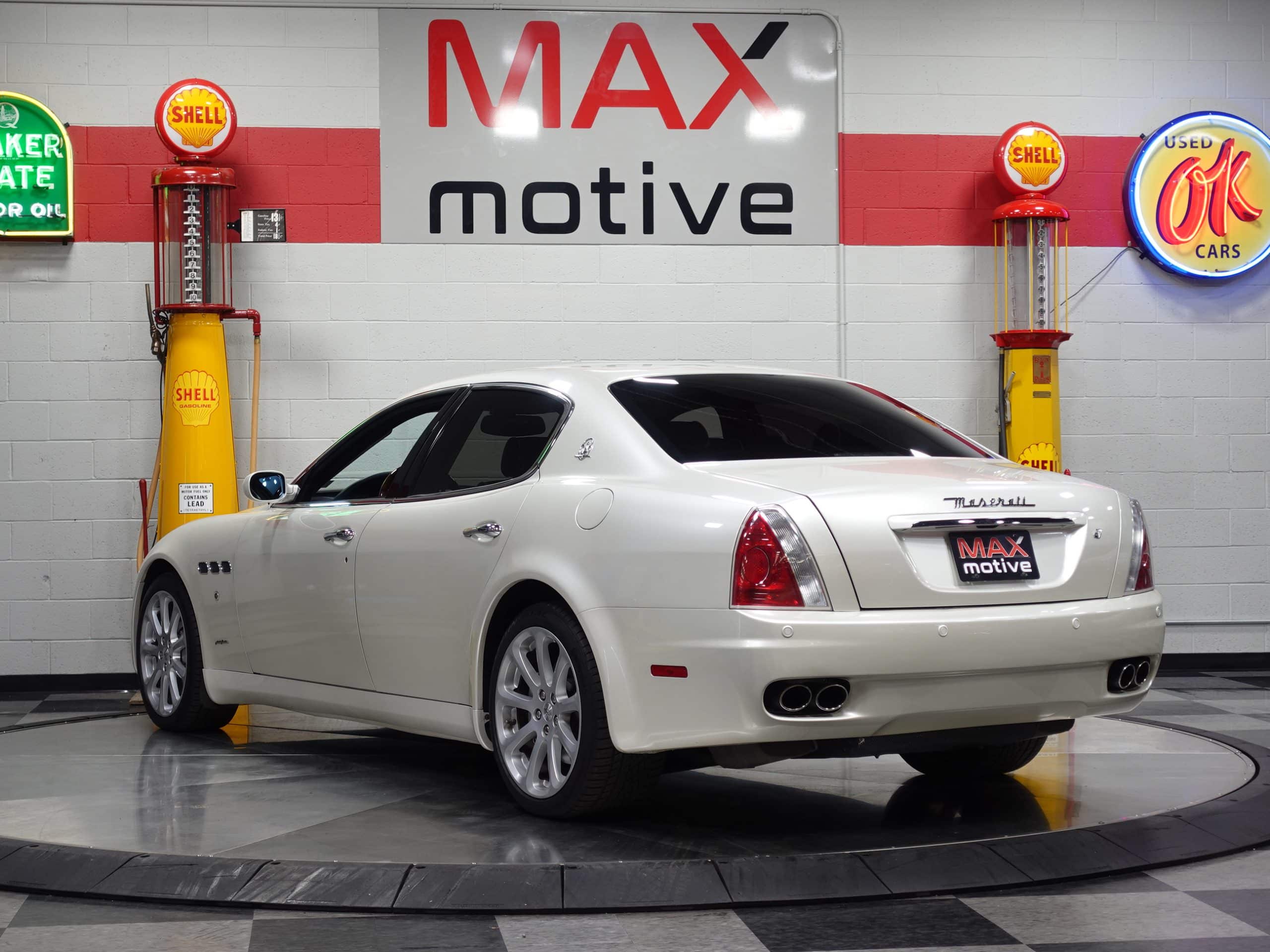 This is a 2008 Maserati Quattroporte Executive GT Sedan, which is now available from the MaxMotive Pittsburgh Showroom. Smooth power delivery comes courtesy of 2008’s newly developed 4.7L 4-valve V8 generating 439 horsepower. A ZF sourced electronic automatic gearbox features 6 speeds, sport mode, Ice (low grip) mode, and manual mode. The car shows off the unique Bianco Fuji Pearlescent exterior paint in combination with the Blu Navy leather interior. Special features include power seats front AND rear, navigation, electronic climate control front and rear, and a Bose digital sound system with automatic equalization that will also compensate for ambient noise reaching the cabin. The rear seat passengers can also regulate the climate in the rear of the cabin. Rich wood trim highlights the interior as well. 19-inch aluminum wheels are wrapped in staggered Continental Extreme Contact tires with massive 285/35ZR19s in the rear. Included is the Original Owner’s Package, the original tire inflator kit, and the original tool kit. A true Gran Turismo, this 2008 Maserati Quattroporte Executive GT Sedan represents a formidable combination of high-end luxury and sports car performance. Please be sure to see the detailed photos and videos at www.maxmotive.com.