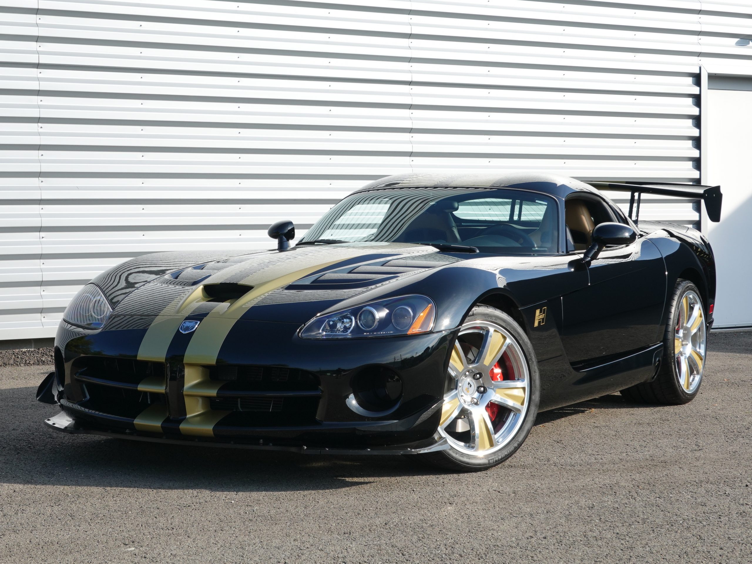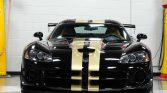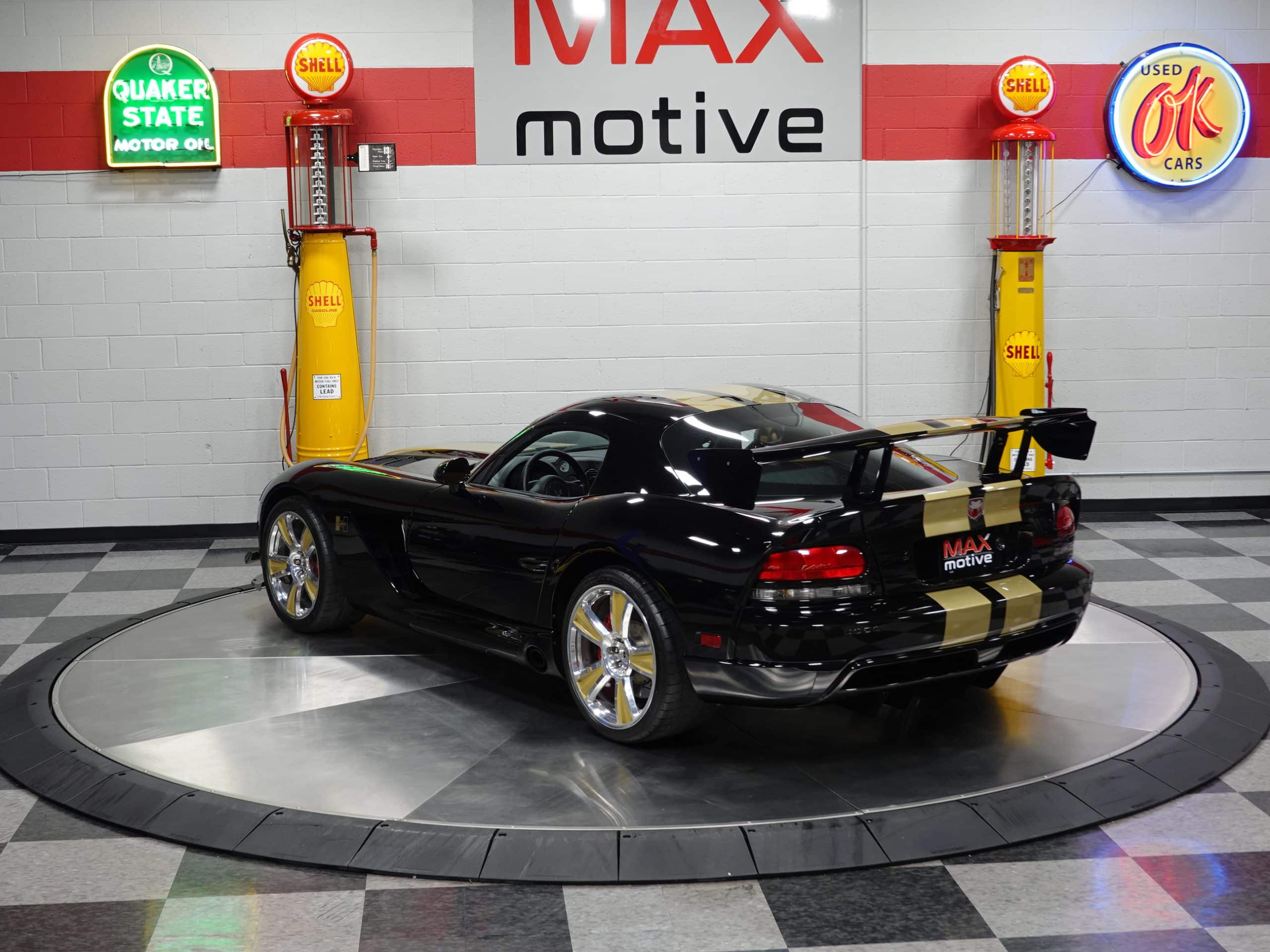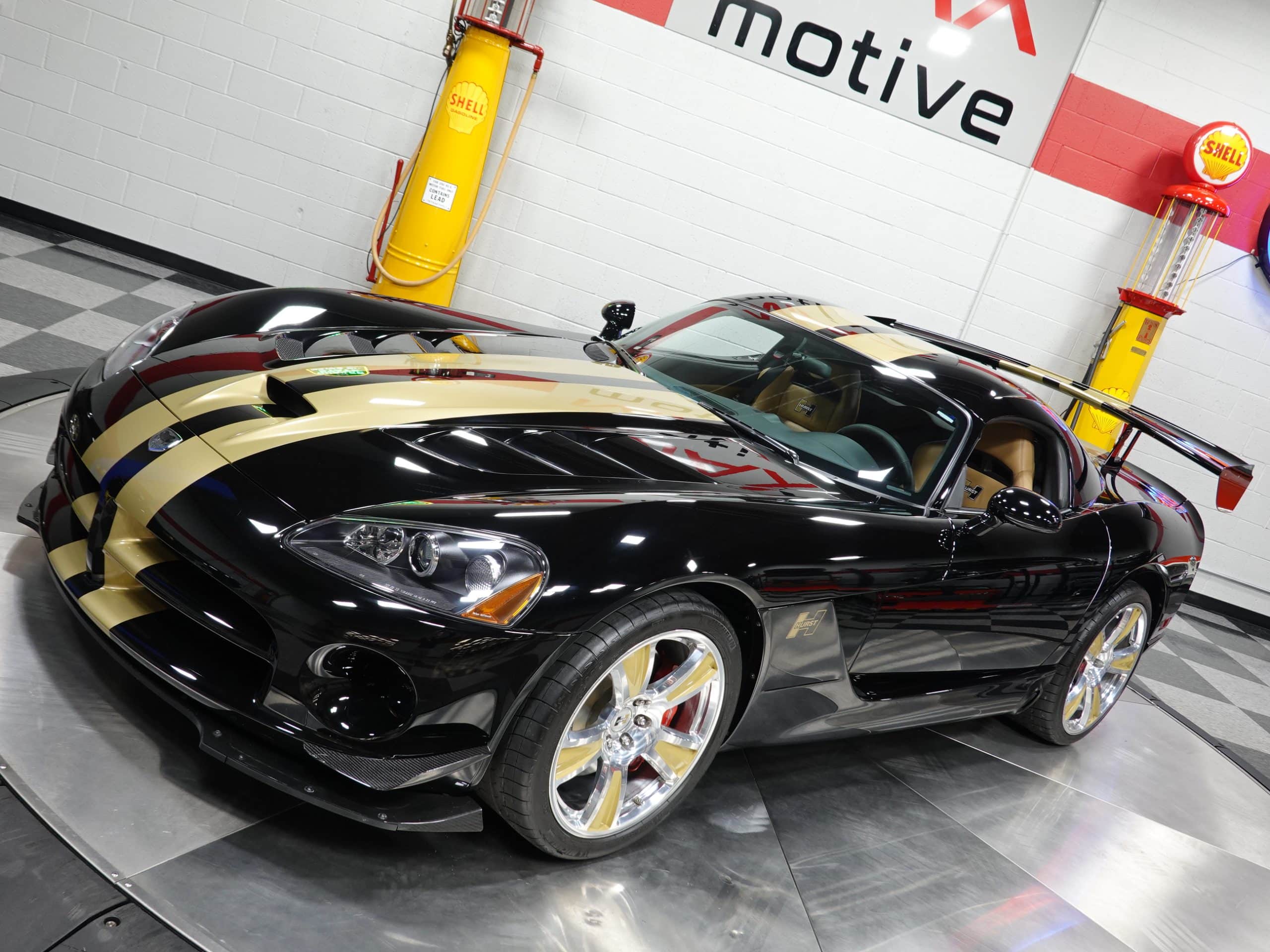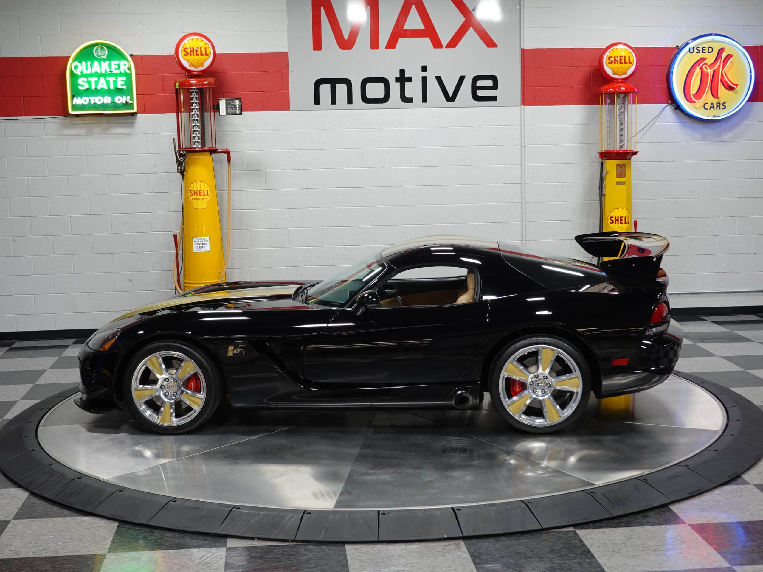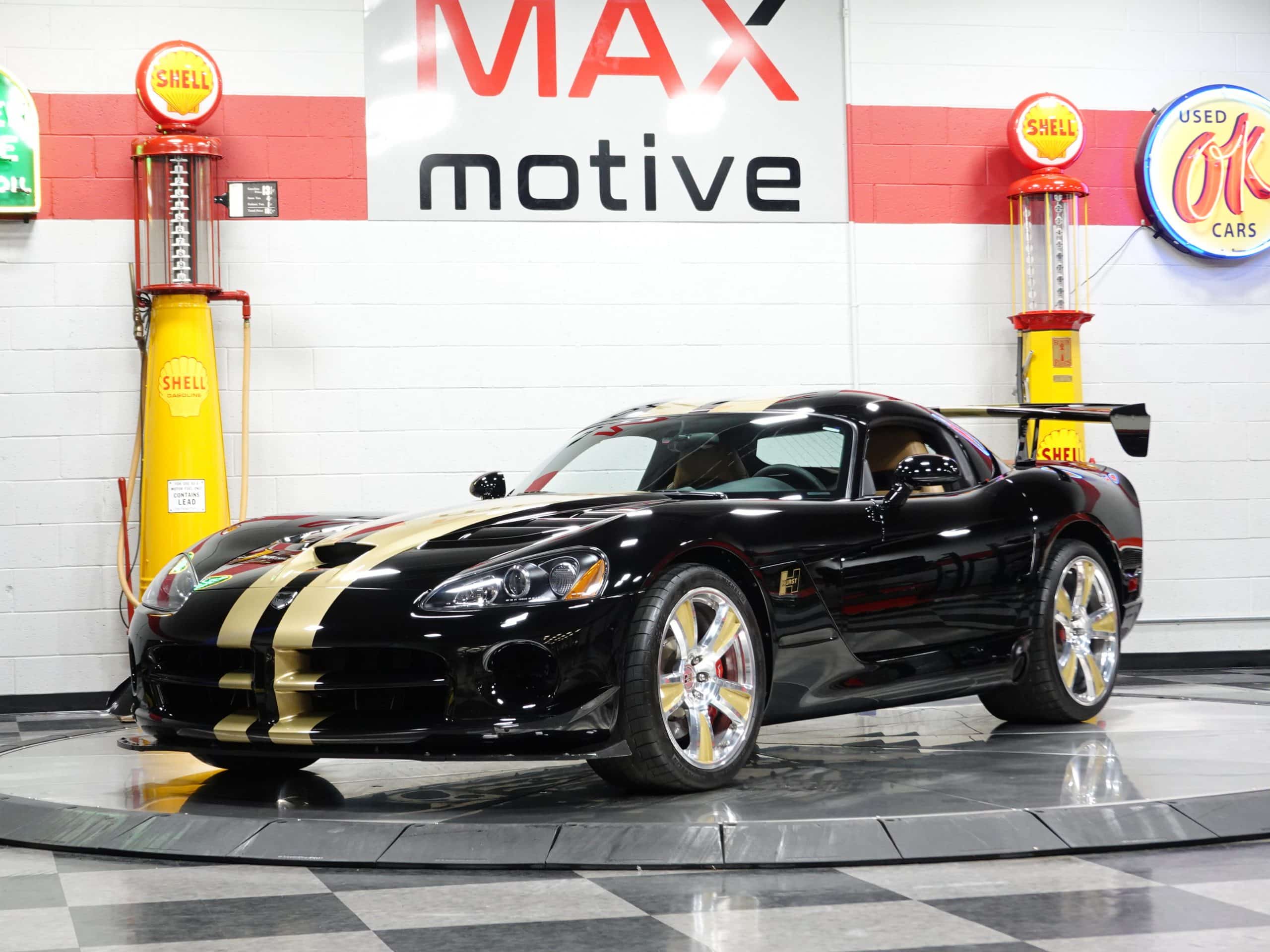 This certified one of one 50th Anniversary Hurst 2009 Dodge Viper SRT10 ACR is now available from MAXmotive as part of an exclusive Last Call Collector Bundle. This special collector package includes this Hurst Viper, a 2018 Challenger SRT Demon with Demon Crate, a Last Call (1 of 300) 2023 Dodge Charger King Daytona, Last Call 2023 Dodge Challenger R/T Scat Pack Widebody Shakedown, and a Last Call 2023 Dodge Challenger Black Ghost (1 of 300). The Viper is the last of just five 2009 Hurst Vipers produced and the only ACR Viper to receive the Hurst Package. The result is a stunning and formidable Viper Black coupe with Hurst gold LeMans stripes and matching gold-trimmed Hurst polished aluminum wheels. A proud part of the MAXmotive collection, this excellent example has had just one previous owner and was driven only 1460 miles. It comes with its original factory window sticker and a Certificate of Authenticity from Hurst Performance Vehicles, along with correspondence from Hurst in Irvine CA verifying the uniqueness of this special car. The now-legendary 8.4 litre aluminum V-10 engine pumps out a lusty 600 horsepower through a 6-speed Tremec gearbox. A special feature is the Hurst shifter, which facilitates the fastest and smoothest gear changes any driver can dish out. The ACR is built to go where it’s pointed. It generates more than 1000 pounds of downforce from its adjustable carbon fiber wing and carbon fiber front splitter at 150mph — according to Motor Trend, this is ten times the downforce of a non-ACR coupe. Even at 50 mph, there are significant aero advantages. The tires are up to the task as well. They are massive Michelin Pilot Sports with 295/30ZR19s in front and 335/25ZR20s (!) in the rear. Two-piece, lightweight, slotted brake rotors complete the ACR package along with a stiffened front stabilizer bar. More documentation includes the original bill of sale, factory assembly stickers, and service receipts. This ultra performance, highly collectible 2009 50th Anniversary Hurst Dodge Viper SRT10 ACR is a rare opportunity to own a one-of-a-kind Hurst vehicle that was, in fact, the last Hurst vehicle of any type produced in Irvine CA. Please see the detailed photos at www.maxmotive.com.