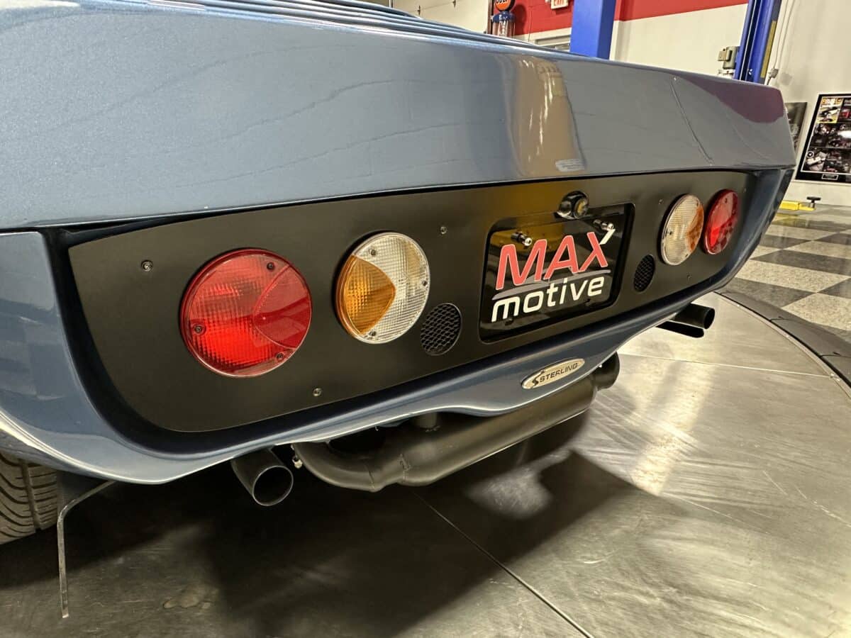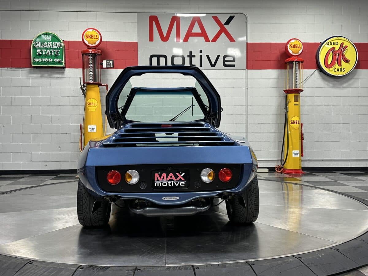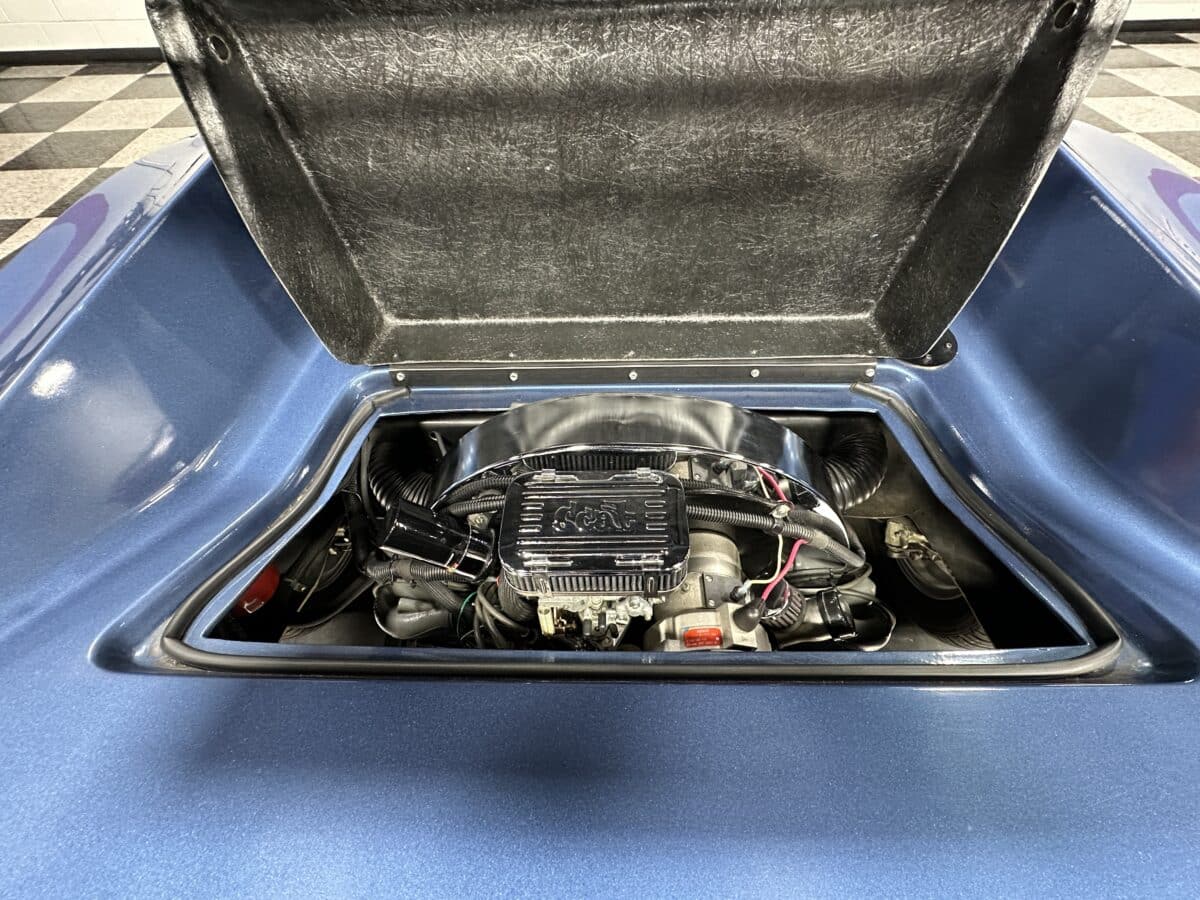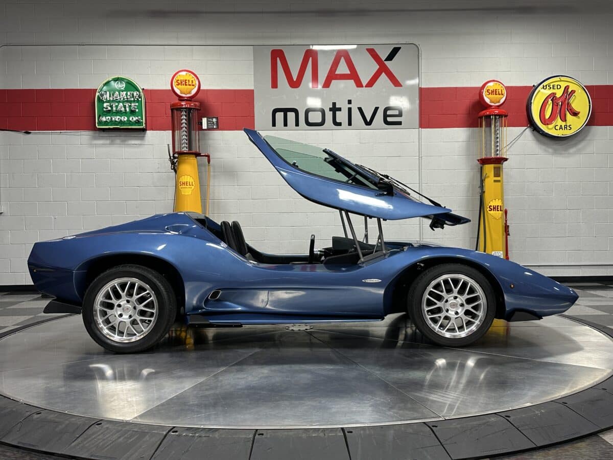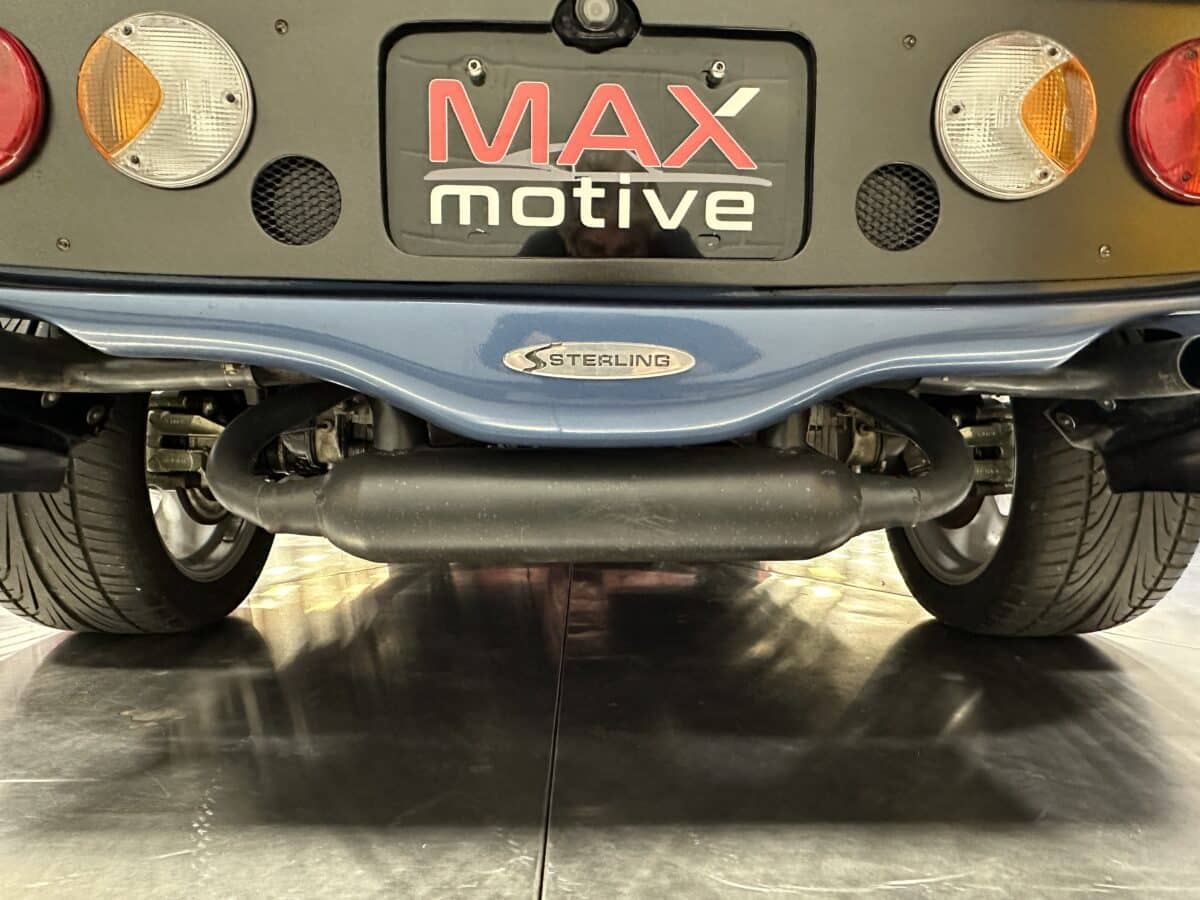 MaxMotive is pleased to offer this sporty Sterling RX Targa, a personal vehicle of Sterling Sports Cars’ CEO. Power comes from the venerable 1600cc VW flat 4 mated to a four-speed manual transmission with a Scat t-handle shifter. The foundation is based on the venerable VW pan chassis, along with more modern suspension technology and four wheel disc brakes. The suspension system includes dual A-arms in front and a four-link setup in the rear among other upgrades. This example was featured in Kit Car Builder and Hot VW magazines plus much of Sterling’s own promotional and advertising literature. The sleek body is formed with a high quality hand-laid resin that circumvents the characteristic scent of lower quality resins, and then coated with PPG Atomic Blue Metallic exterior paint. Open the hydraulic cockpit door to see the black leather bucket seats, flat bottom Grant steering wheel, a stone gray pebble grain dash with a complete gauge package including tachometer, a back-up camera monitor, and an iPod dedicated sound system. Everything’s tied together with a new 18-circuit wiring harness. A specialty car where fun is unabashedly the main objective, this Sterling RX Targa is complete and ready for the road, the track, or the next car cruise. Please be sure to see the photos and details at maxmotive.com