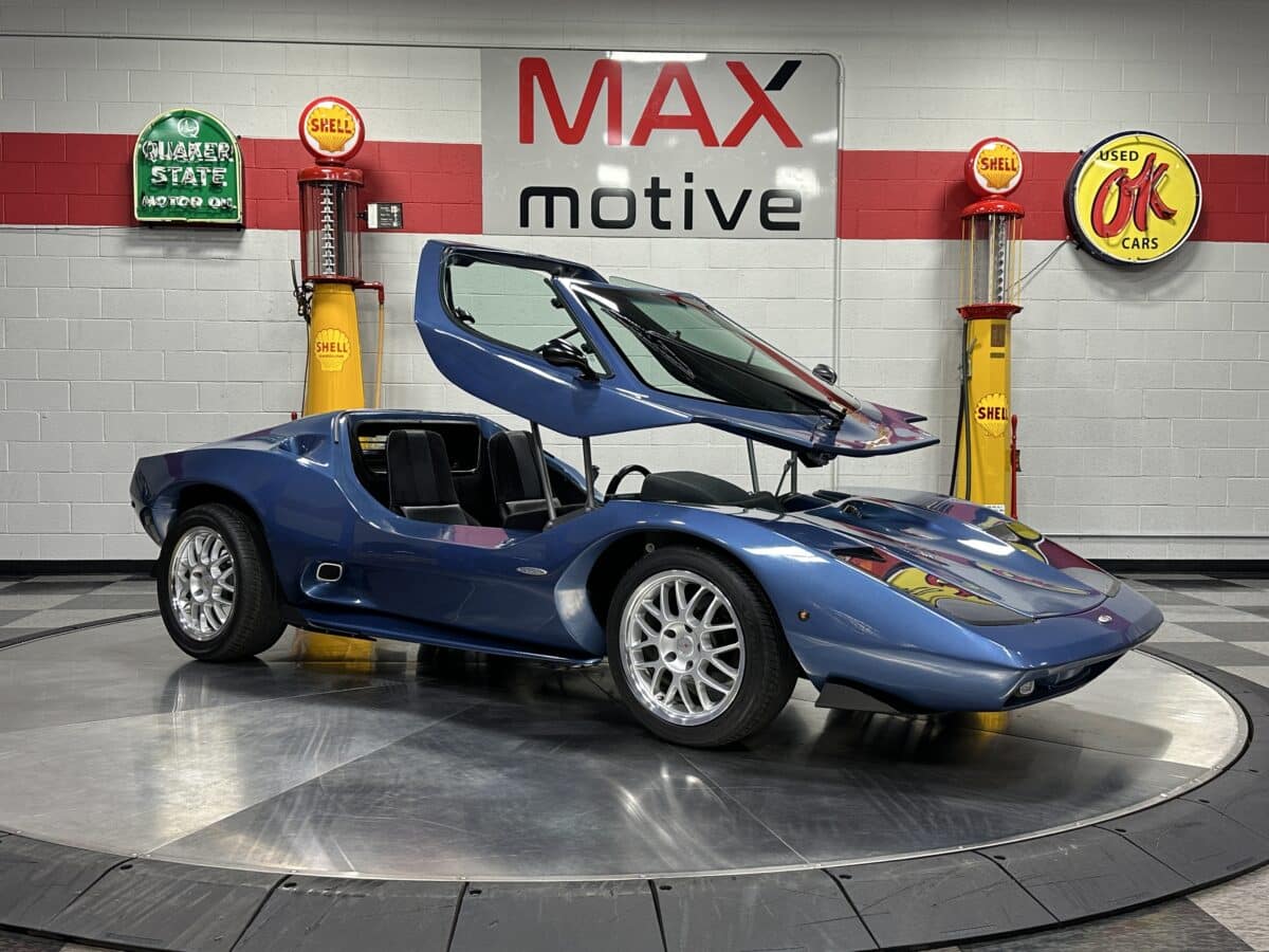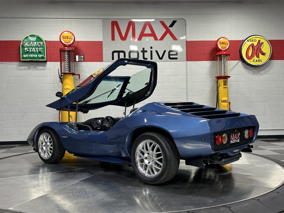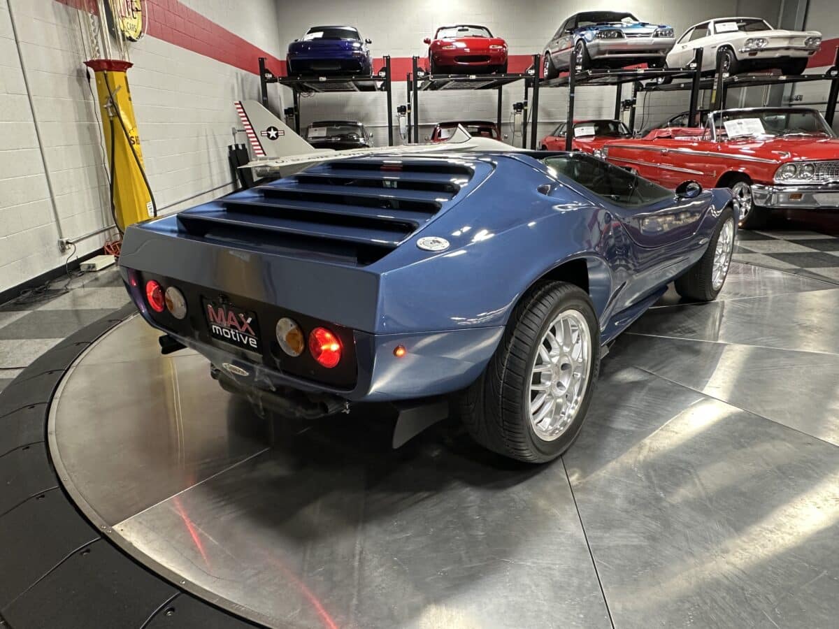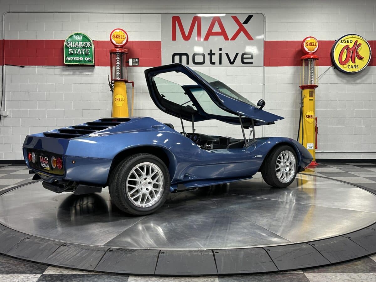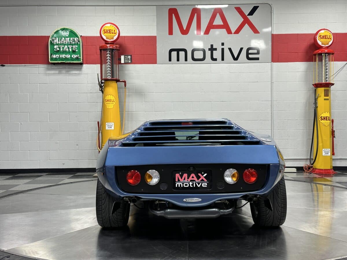 MaxMotive is pleased to offer this sporty Sterling RX Targa, a personal vehicle of Sterling Sports Cars’ CEO. Power comes from the venerable 1600cc VW flat 4 mated to a four-speed manual transmission with a Scat t-handle shifter. The foundation is based on the venerable VW pan chassis, along with more modern suspension technology and four wheel disc brakes. The suspension system includes dual A-arms in front and a four-link setup in the rear among other upgrades. This example was featured in Kit Car Builder and Hot VW magazines plus much of Sterling’s own promotional and advertising literature. The sleek body is formed with a high quality hand-laid resin that circumvents the characteristic scent of lower quality resins, and then coated with PPG Atomic Blue Metallic exterior paint. Open the hydraulic cockpit door to see the black leather bucket seats, flat bottom Grant steering wheel, a stone gray pebble grain dash with a complete gauge package including tachometer, a back-up camera monitor, and an iPod dedicated sound system. Everything’s tied together with a new 18-circuit wiring harness. A specialty car where fun is unabashedly the main objective, this Sterling RX Targa is complete and ready for the road, the track, or the next car cruise. Please be sure to see the photos and details at maxmotive.com