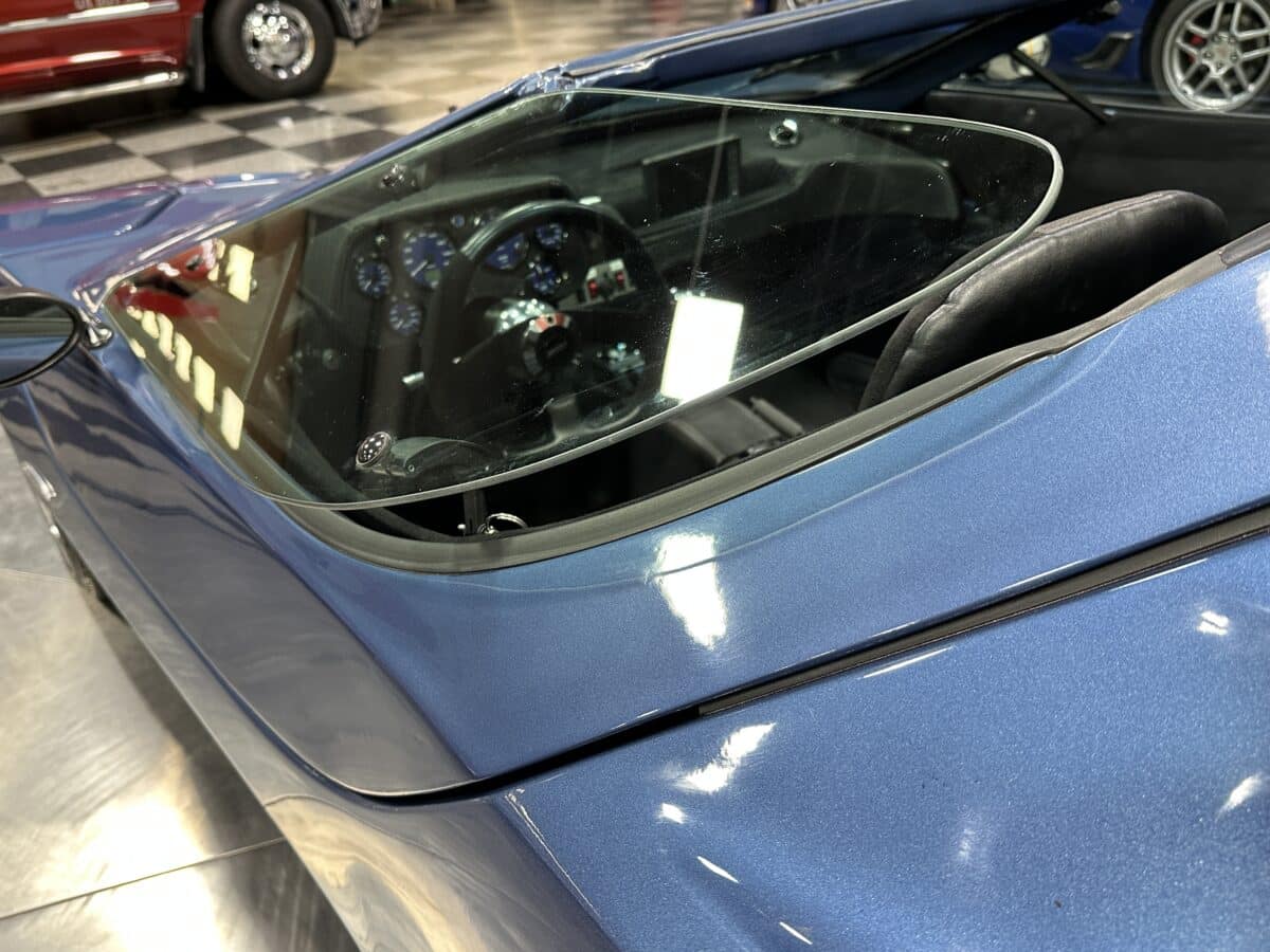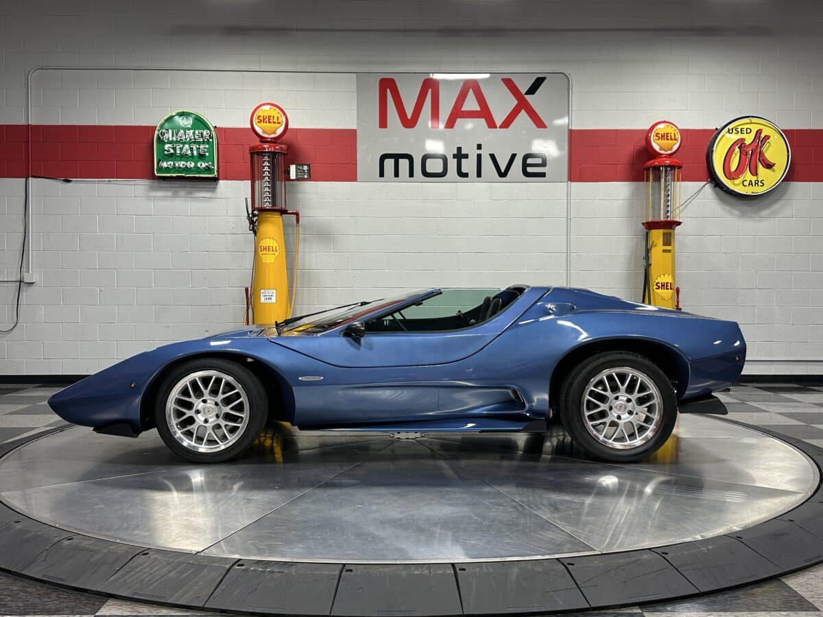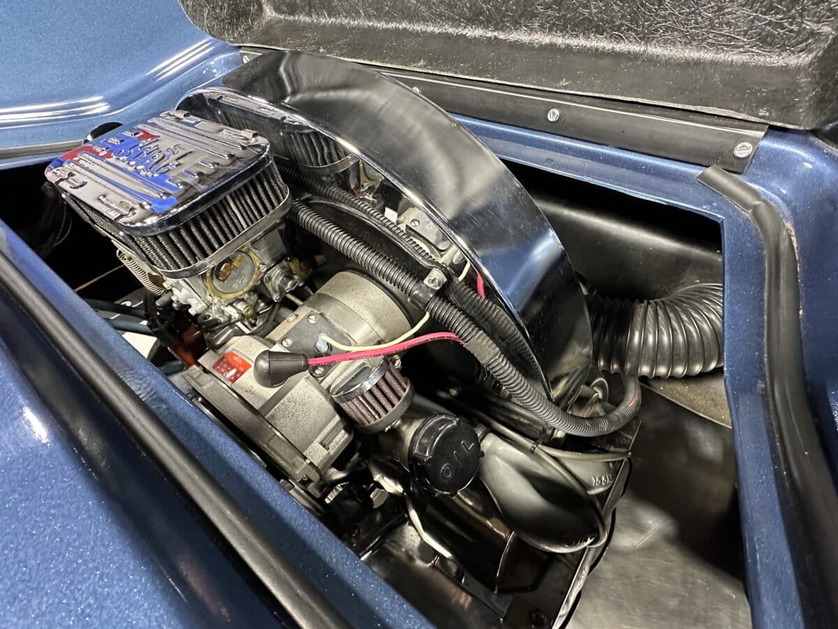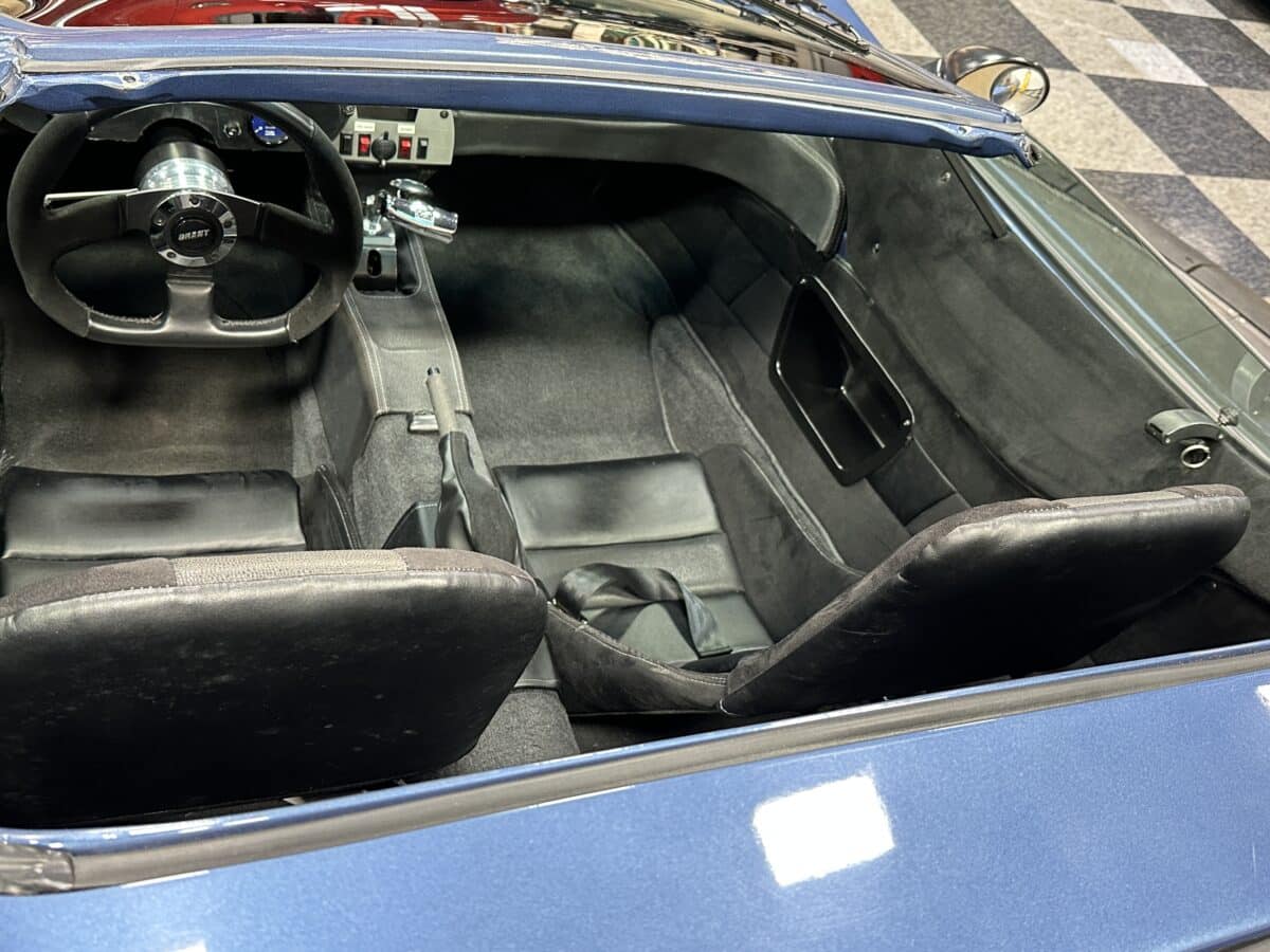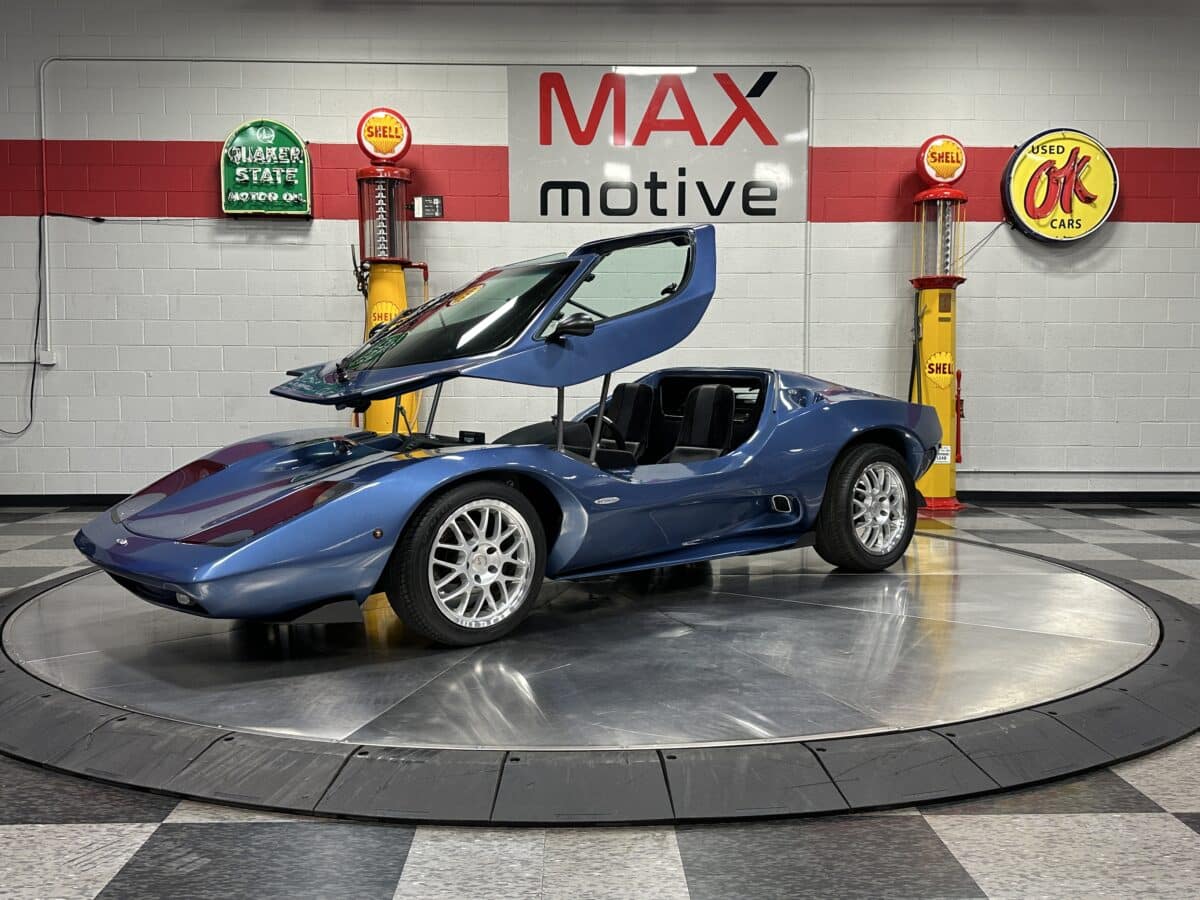 MaxMotive is pleased to offer this sporty Sterling RX Targa, a personal vehicle of Sterling Sports Cars’ CEO. Power comes from the venerable 1600cc VW flat 4 mated to a four-speed manual transmission with a Scat t-handle shifter. The foundation is based on the venerable VW pan chassis, along with more modern suspension technology and four wheel disc brakes. The suspension system includes dual A-arms in front and a four-link setup in the rear among other upgrades. This example was featured in Kit Car Builder and Hot VW magazines plus much of Sterling’s own promotional and advertising literature. The sleek body is formed with a high quality hand-laid resin that circumvents the characteristic scent of lower quality resins, and then coated with PPG Atomic Blue Metallic exterior paint. Open the hydraulic cockpit door to see the black leather bucket seats, flat bottom Grant steering wheel, a stone gray pebble grain dash with a complete gauge package including tachometer, a back-up camera monitor, and an iPod dedicated sound system. Everything’s tied together with a new 18-circuit wiring harness. A specialty car where fun is unabashedly the main objective, this Sterling RX Targa is complete and ready for the road, the track, or the next car cruise. Please be sure to see the photos and details at maxmotive.com