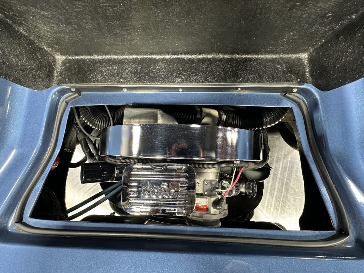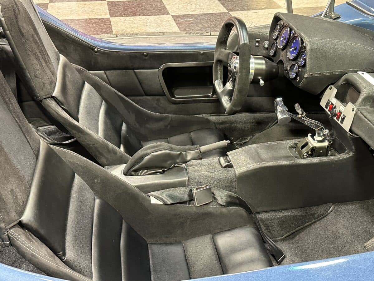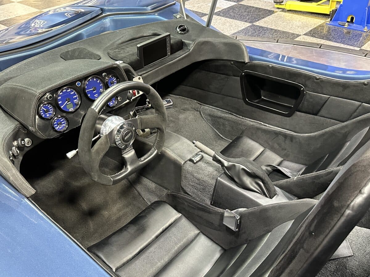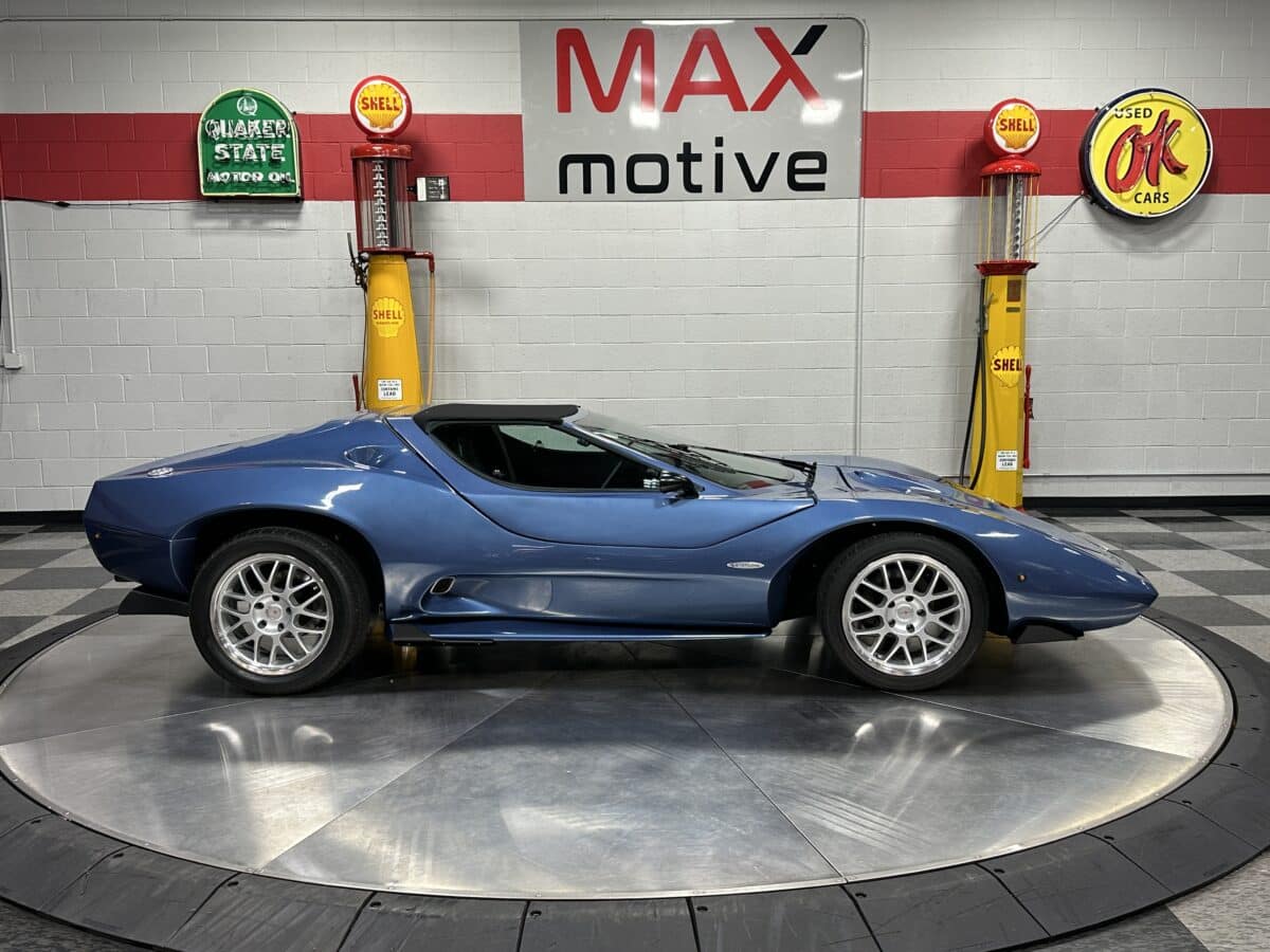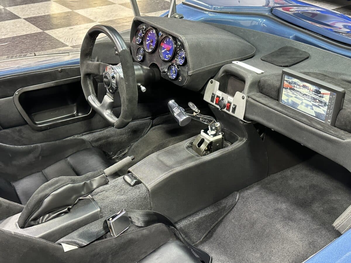 MaxMotive is pleased to offer this sporty Sterling RX Targa, a personal vehicle of Sterling Sports Cars’ CEO. Power comes from the venerable 1600cc VW flat 4 mated to a four-speed manual transmission with a Scat t-handle shifter. The foundation is based on the venerable VW pan chassis, along with more modern suspension technology and four wheel disc brakes. The suspension system includes dual A-arms in front and a four-link setup in the rear among other upgrades. This example was featured in Kit Car Builder and Hot VW magazines plus much of Sterling’s own promotional and advertising literature. The sleek body is formed with a high quality hand-laid resin that circumvents the characteristic scent of lower quality resins, and then coated with PPG Atomic Blue Metallic exterior paint. Open the hydraulic cockpit door to see the black leather bucket seats, flat bottom Grant steering wheel, a stone gray pebble grain dash with a complete gauge package including tachometer, a back-up camera monitor, and an iPod dedicated sound system. Everything’s tied together with a new 18-circuit wiring harness. A specialty car where fun is unabashedly the main objective, this Sterling RX Targa is complete and ready for the road, the track, or the next car cruise. Please be sure to see the photos and details at maxmotive.com