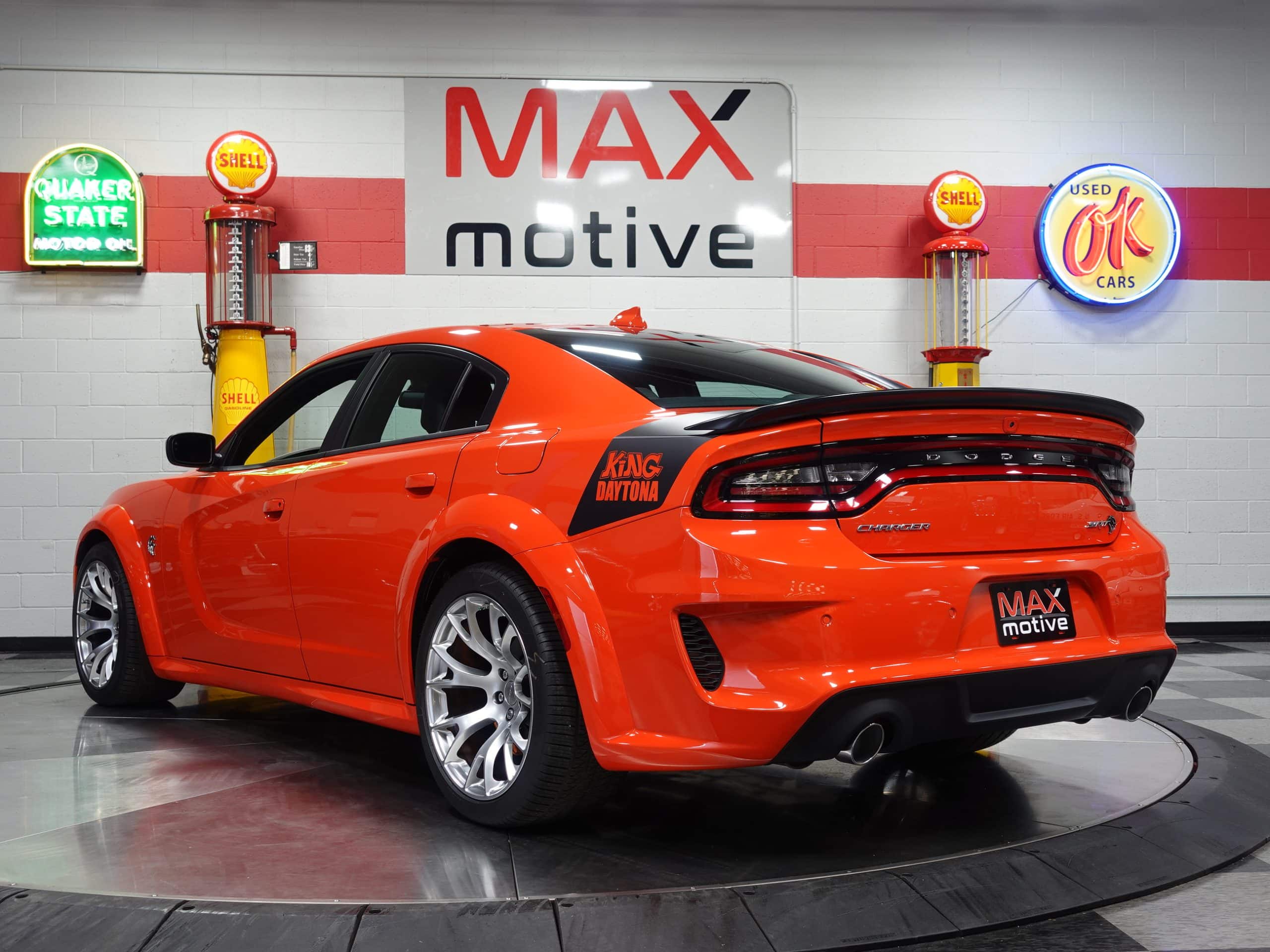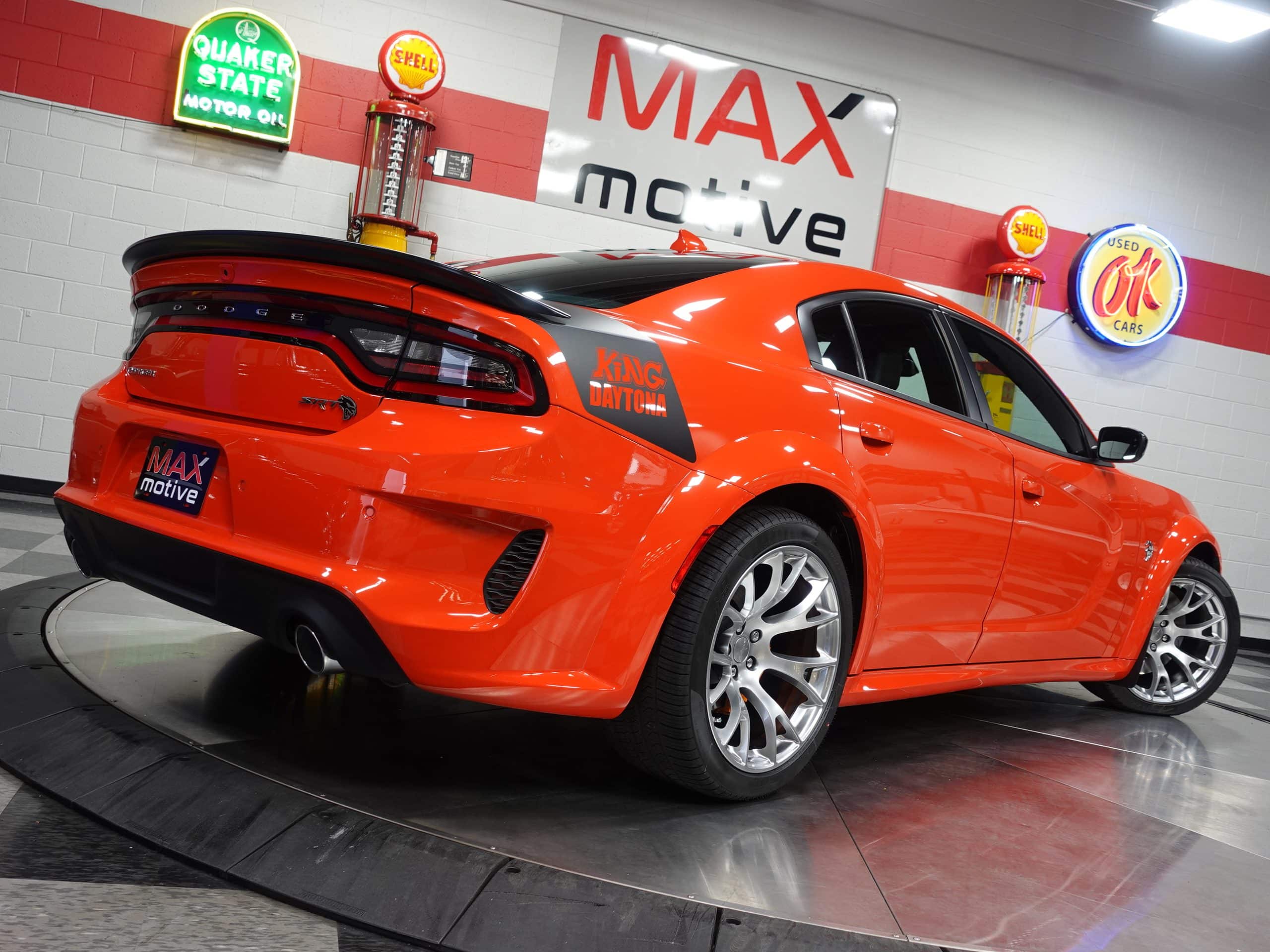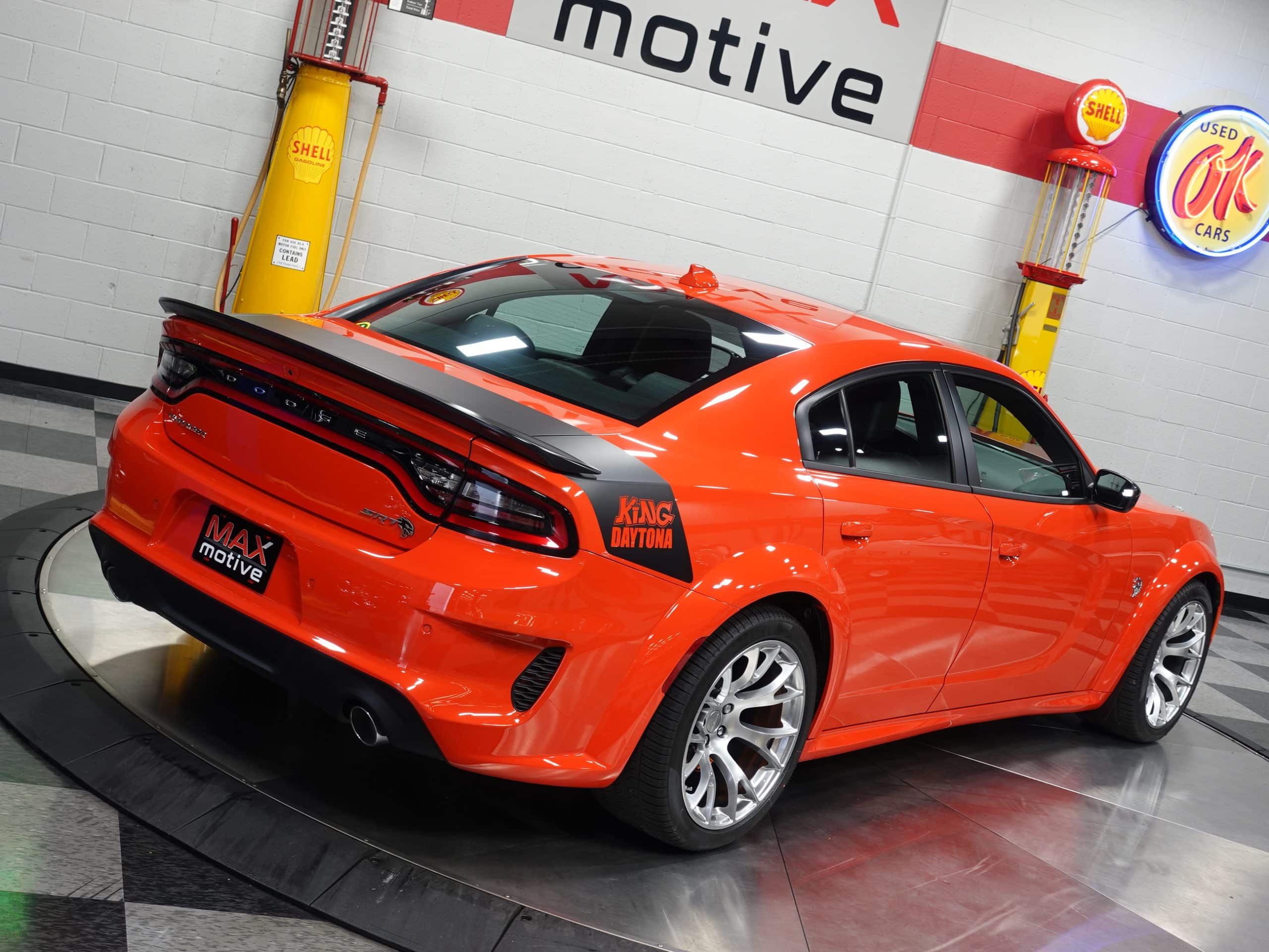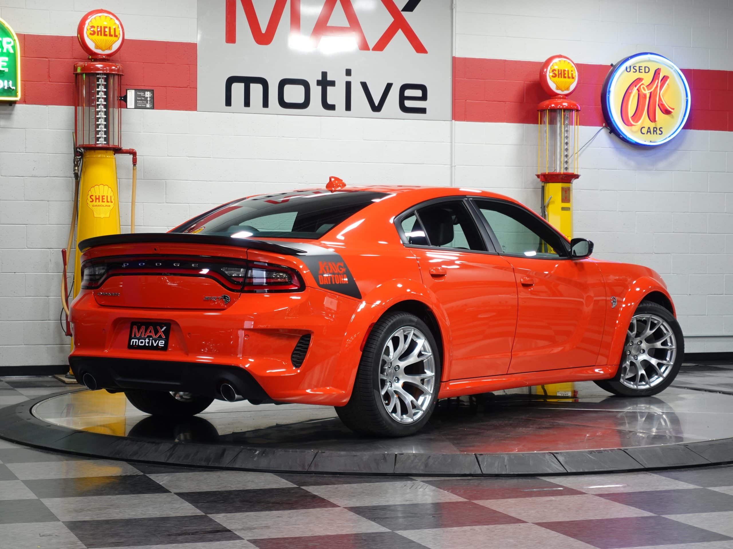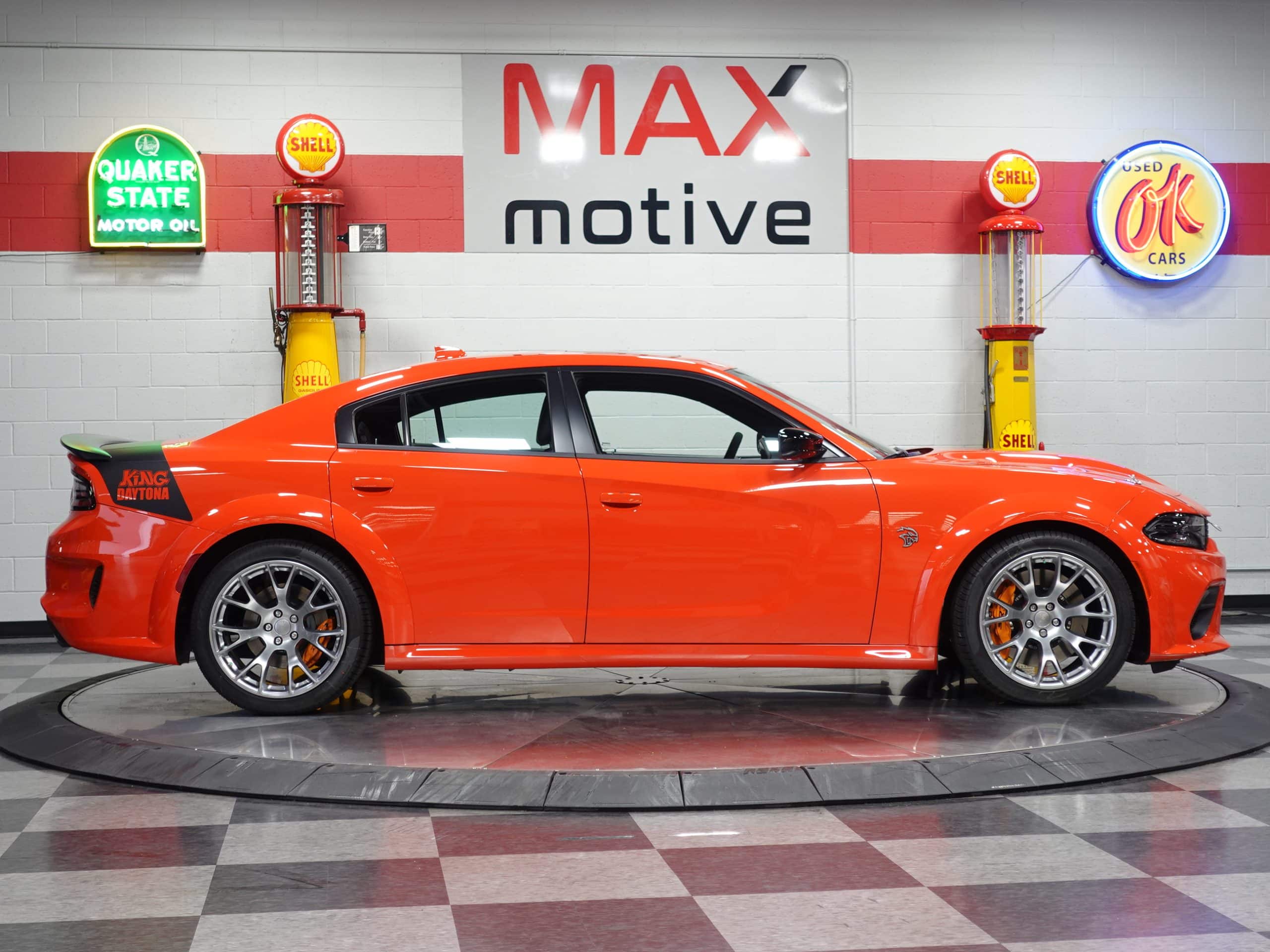 The first supercharged car of the long-anticipated Last Call Editions, this 2023 Dodge Charger King Daytona Special Edition is now available from the MaxMotive Pittsburgh Showroom. The King Daytona is an SRT Hellcat Redeye Widebody with special content, not the least of which is 10 extra horsepower, bringing the total to a brutal 807! Just 300 King Daytonas were built; this one comes with the original window sticker, build sheets, and Factory Shipping Order. The 6.2L Supercharged HO V8 engine works in conjunction with the 8-speed automatic HP90 transmission, after-run chiller, Line Lock Launch Control, Launch Assist, and SRT Configurable Drive Modes to provide adrenaline-rush performance with amazingly smooth, luxurious driveability. The King Daytona is distinguished by its Go Mango exterior paint, King Daytona trunk stripe, orange Brembo brake calipers, front and rear SRT spoilers, and 20”x11” Warp-Speed Satin Carbon Wheels. Inside, it’s appointed with plush Nappa/Alcantara seats with logos, suede door trim, suede headliner, orange interior accent stitch, real carbon fiber interior accents, and an SRT Alcantara Steering Wheel. This example also features the Navigation Group, the Harman/Kardon Audio Group (900 watts and 19 speakers) and a Power Sunroof. The King Daytona pays homage to Big Willie Robinson, a legendary racer and multicultural leader who wheeled a drag race modified Charger Daytona on the streets of Los Angeles during the glory days of muscle. For the Last Call series, Dodge pulled out all the stops to create what is perhaps the ultimate Dodge Charger, and with only 300 produced it is an exclusive automobile offering extreme performance, comfort, and style. The 2023 Dodge Charger King Daytona Special Edition. Please see the detailed photos and videos at www.maxmotive.com.