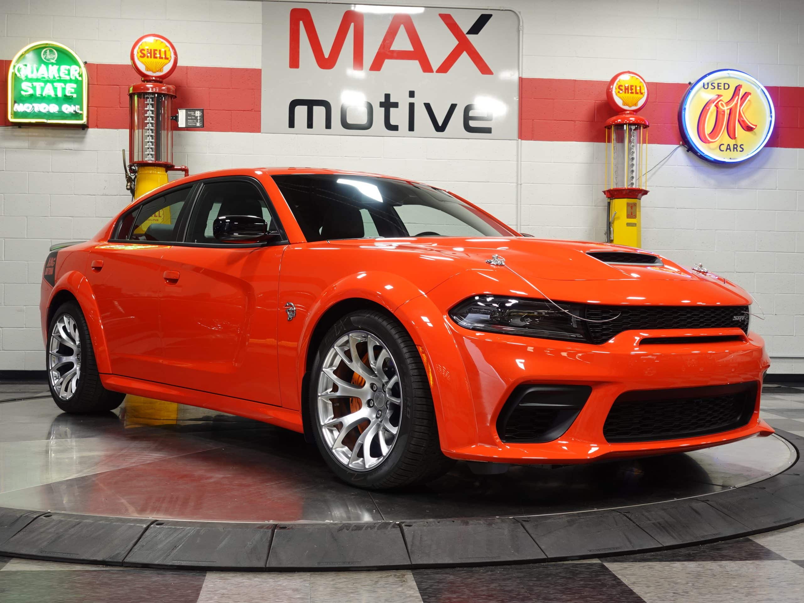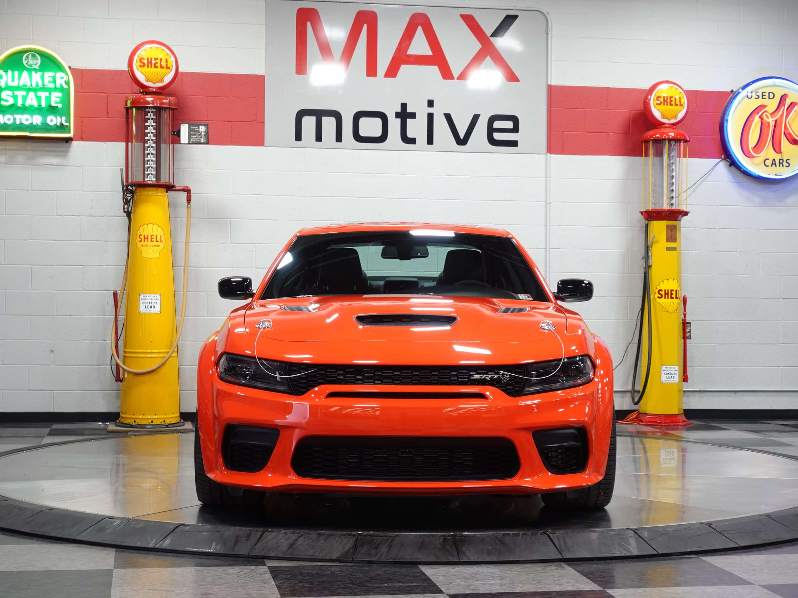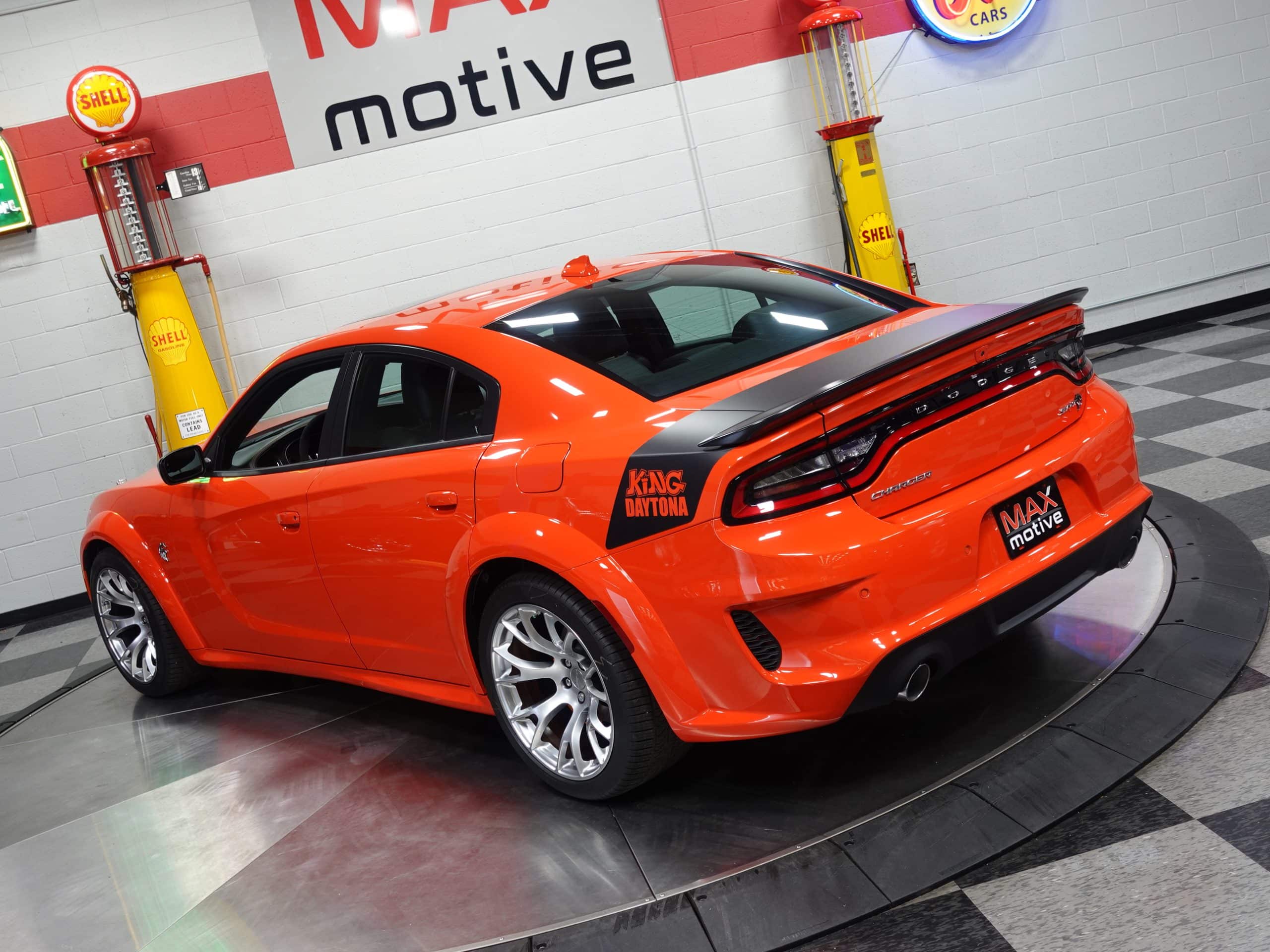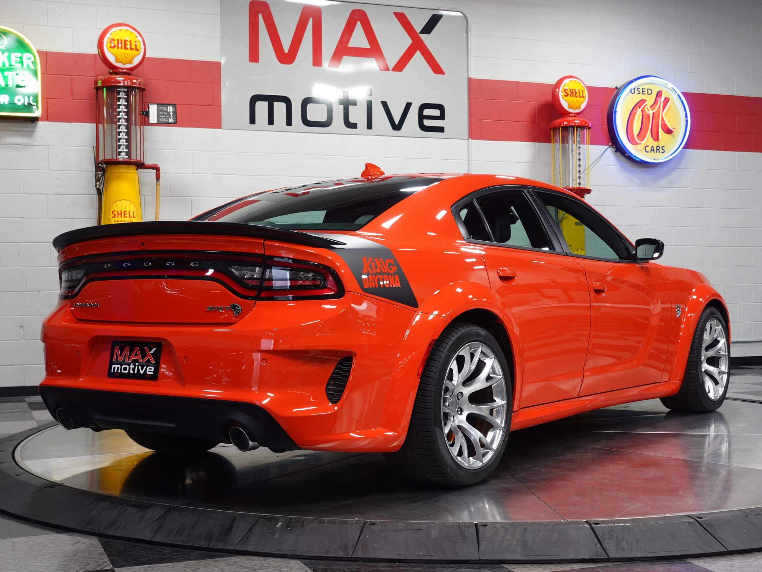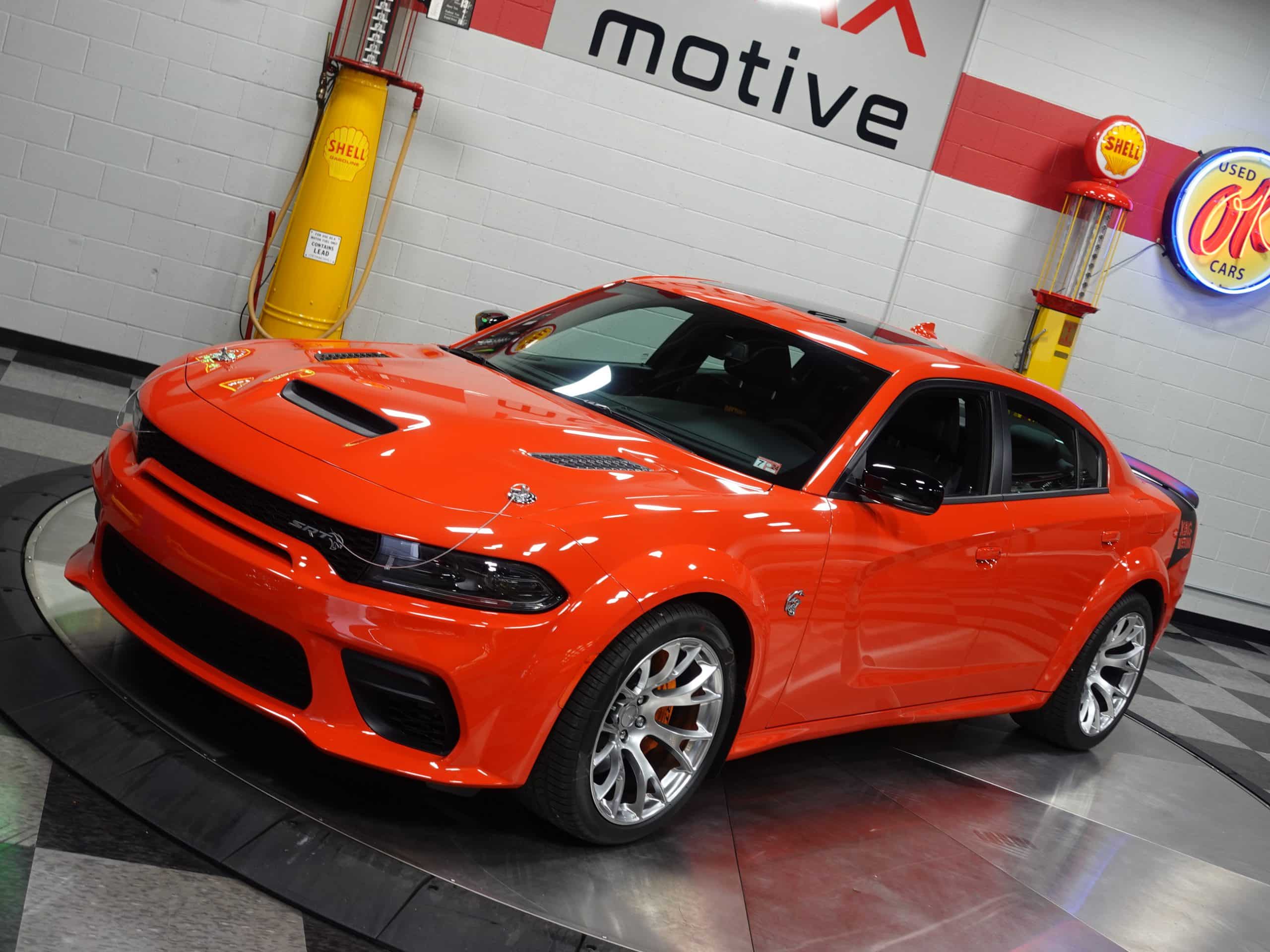 The first supercharged car of the long-anticipated Last Call Editions, this 2023 Dodge Charger King Daytona Special Edition is now available from the MaxMotive Pittsburgh Showroom. The King Daytona is an SRT Hellcat Redeye Widebody with special content, not the least of which is 10 extra horsepower, bringing the total to a brutal 807! Just 300 King Daytonas were built; this one comes with the original window sticker, build sheets, and Factory Shipping Order. The 6.2L Supercharged HO V8 engine works in conjunction with the 8-speed automatic HP90 transmission, after-run chiller, Line Lock Launch Control, Launch Assist, and SRT Configurable Drive Modes to provide adrenaline-rush performance with amazingly smooth, luxurious driveability. The King Daytona is distinguished by its Go Mango exterior paint, King Daytona trunk stripe, orange Brembo brake calipers, front and rear SRT spoilers, and 20”x11” Warp-Speed Satin Carbon Wheels. Inside, it’s appointed with plush Nappa/Alcantara seats with logos, suede door trim, suede headliner, orange interior accent stitch, real carbon fiber interior accents, and an SRT Alcantara Steering Wheel. This example also features the Navigation Group, the Harman/Kardon Audio Group (900 watts and 19 speakers) and a Power Sunroof. The King Daytona pays homage to Big Willie Robinson, a legendary racer and multicultural leader who wheeled a drag race modified Charger Daytona on the streets of Los Angeles during the glory days of muscle. For the Last Call series, Dodge pulled out all the stops to create what is perhaps the ultimate Dodge Charger, and with only 300 produced it is an exclusive automobile offering extreme performance, comfort, and style. The 2023 Dodge Charger King Daytona Special Edition. Please see the detailed photos and videos at www.maxmotive.com.