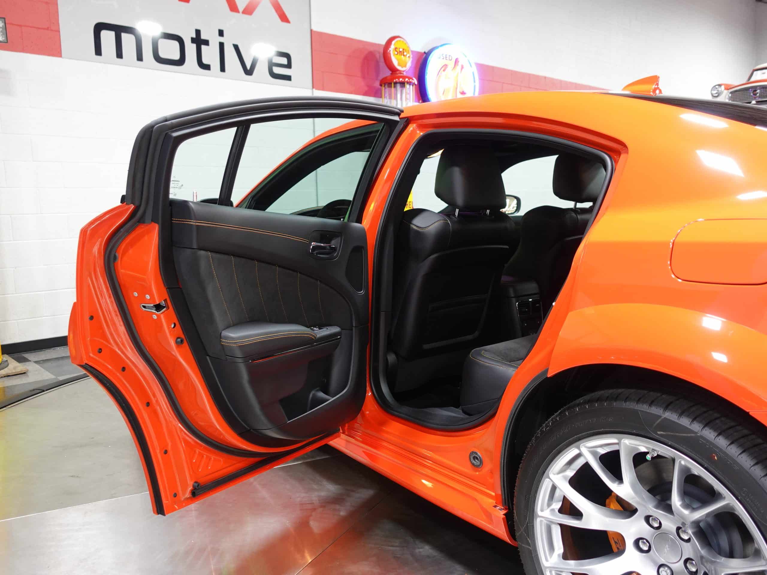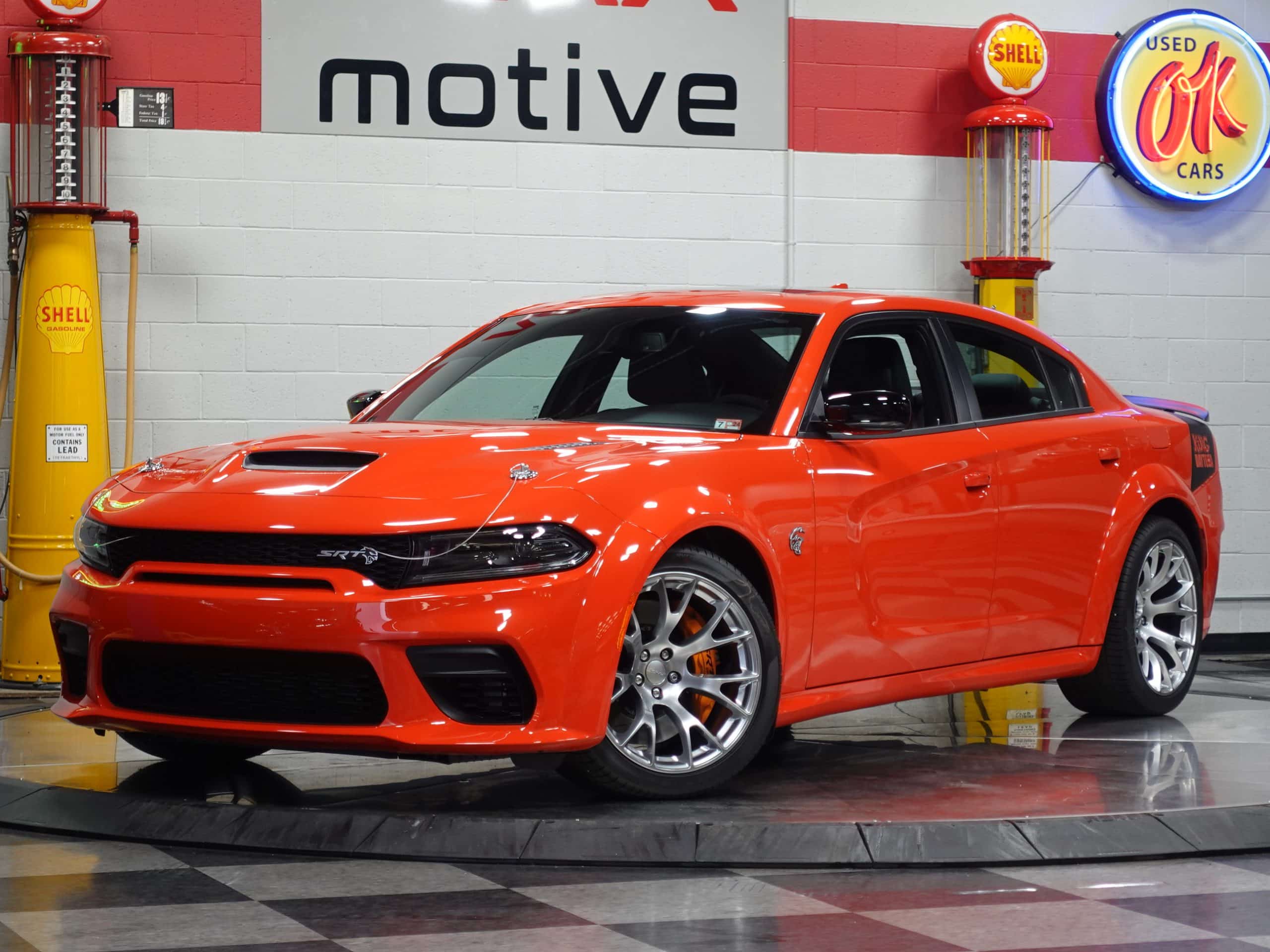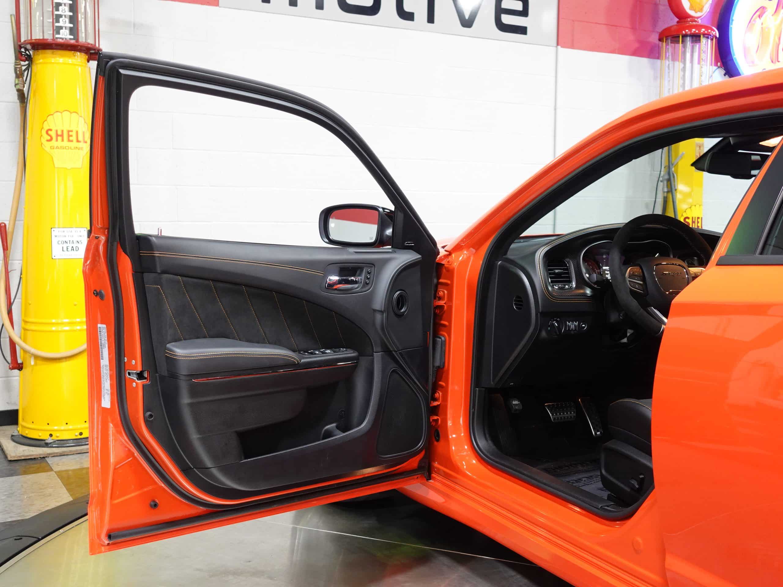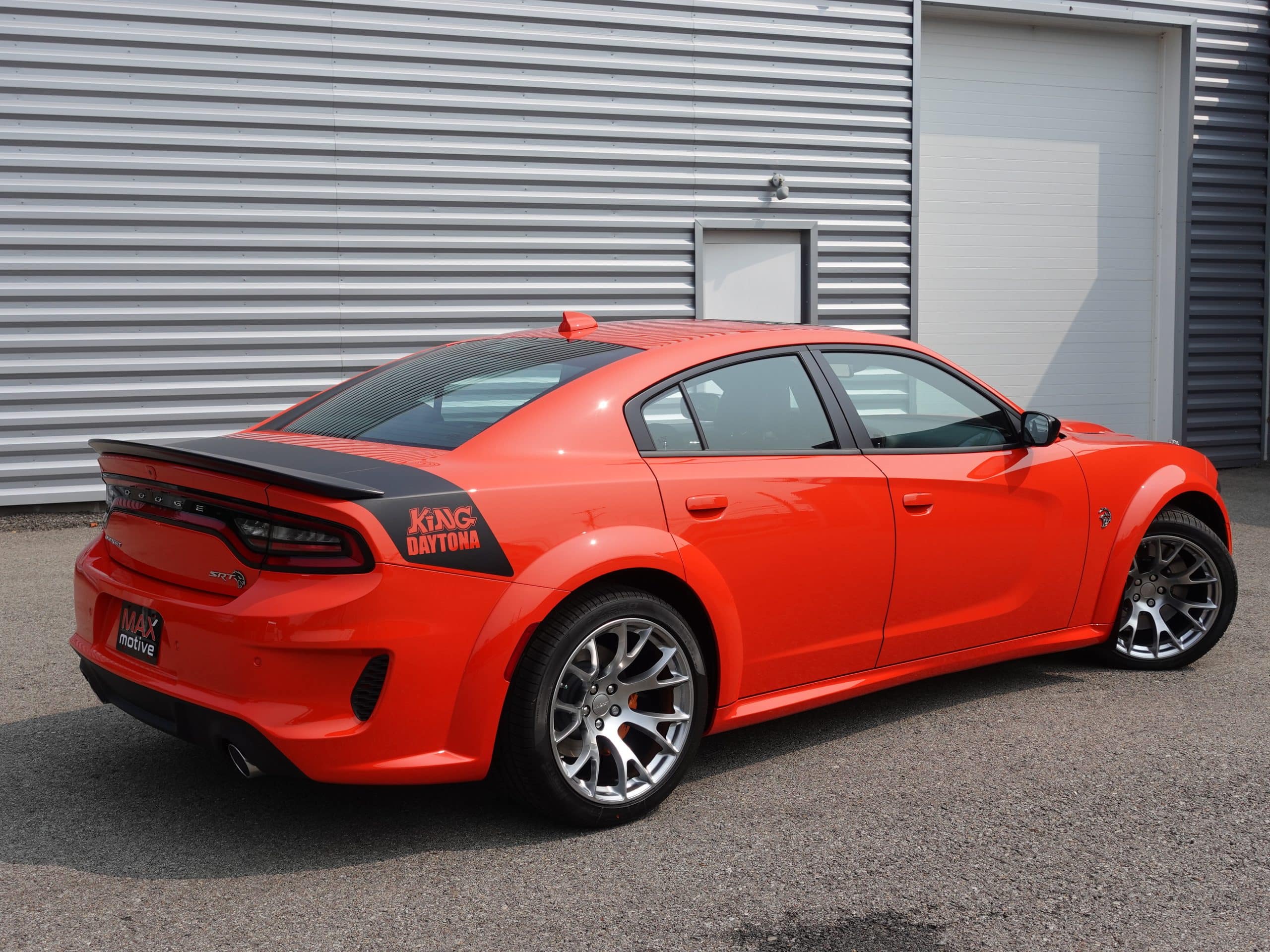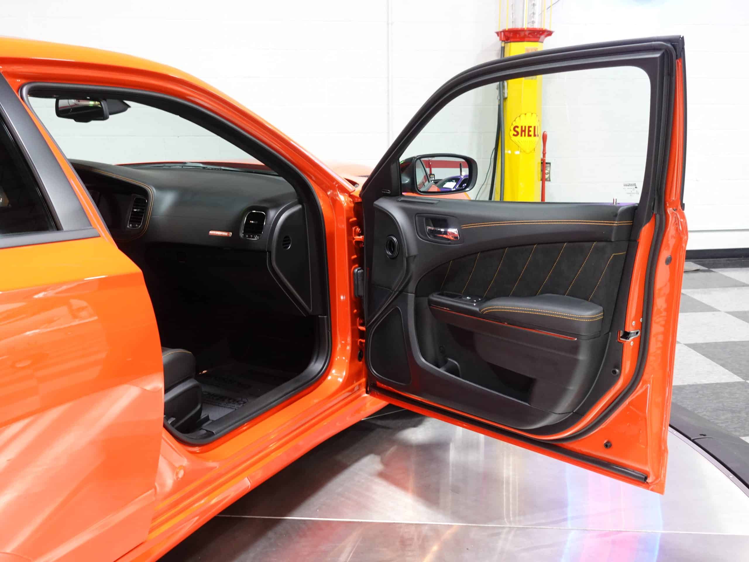 The first supercharged car of the long-anticipated Last Call Editions, this 2023 Dodge Charger King Daytona Special Edition is now available from the MaxMotive Pittsburgh Showroom. The King Daytona is an SRT Hellcat Redeye Widebody with special content, not the least of which is 10 extra horsepower, bringing the total to a brutal 807! Just 300 King Daytonas were built; this one comes with the original window sticker, build sheets, and Factory Shipping Order. The 6.2L Supercharged HO V8 engine works in conjunction with the 8-speed automatic HP90 transmission, after-run chiller, Line Lock Launch Control, Launch Assist, and SRT Configurable Drive Modes to provide adrenaline-rush performance with amazingly smooth, luxurious driveability. The King Daytona is distinguished by its Go Mango exterior paint, King Daytona trunk stripe, orange Brembo brake calipers, front and rear SRT spoilers, and 20”x11” Warp-Speed Satin Carbon Wheels. Inside, it’s appointed with plush Nappa/Alcantara seats with logos, suede door trim, suede headliner, orange interior accent stitch, real carbon fiber interior accents, and an SRT Alcantara Steering Wheel. This example also features the Navigation Group, the Harman/Kardon Audio Group (900 watts and 19 speakers) and a Power Sunroof. The King Daytona pays homage to Big Willie Robinson, a legendary racer and multicultural leader who wheeled a drag race modified Charger Daytona on the streets of Los Angeles during the glory days of muscle. For the Last Call series, Dodge pulled out all the stops to create what is perhaps the ultimate Dodge Charger, and with only 300 produced it is an exclusive automobile offering extreme performance, comfort, and style. The 2023 Dodge Charger King Daytona Special Edition. Please see the detailed photos and videos at www.maxmotive.com.