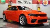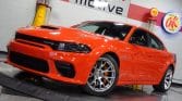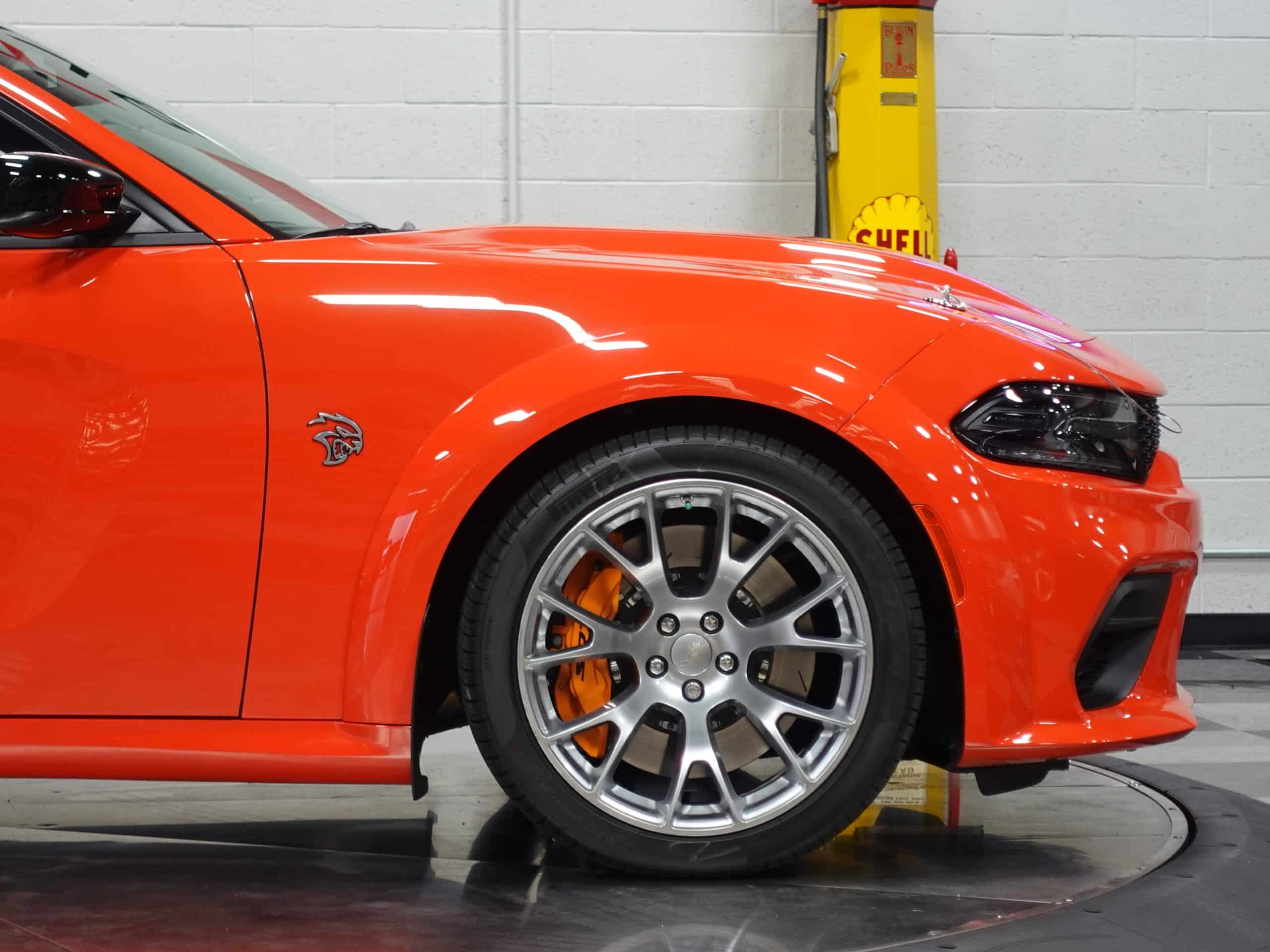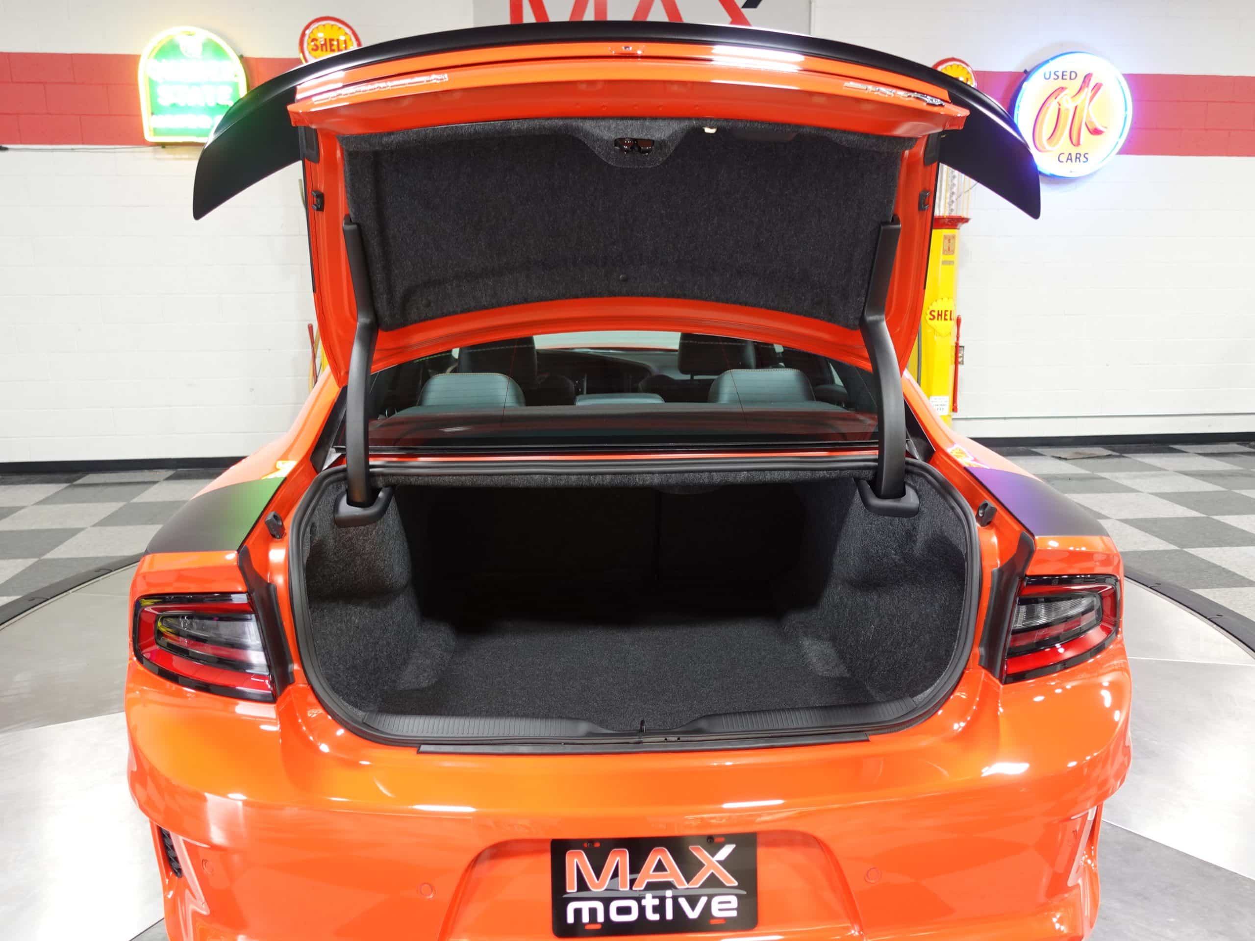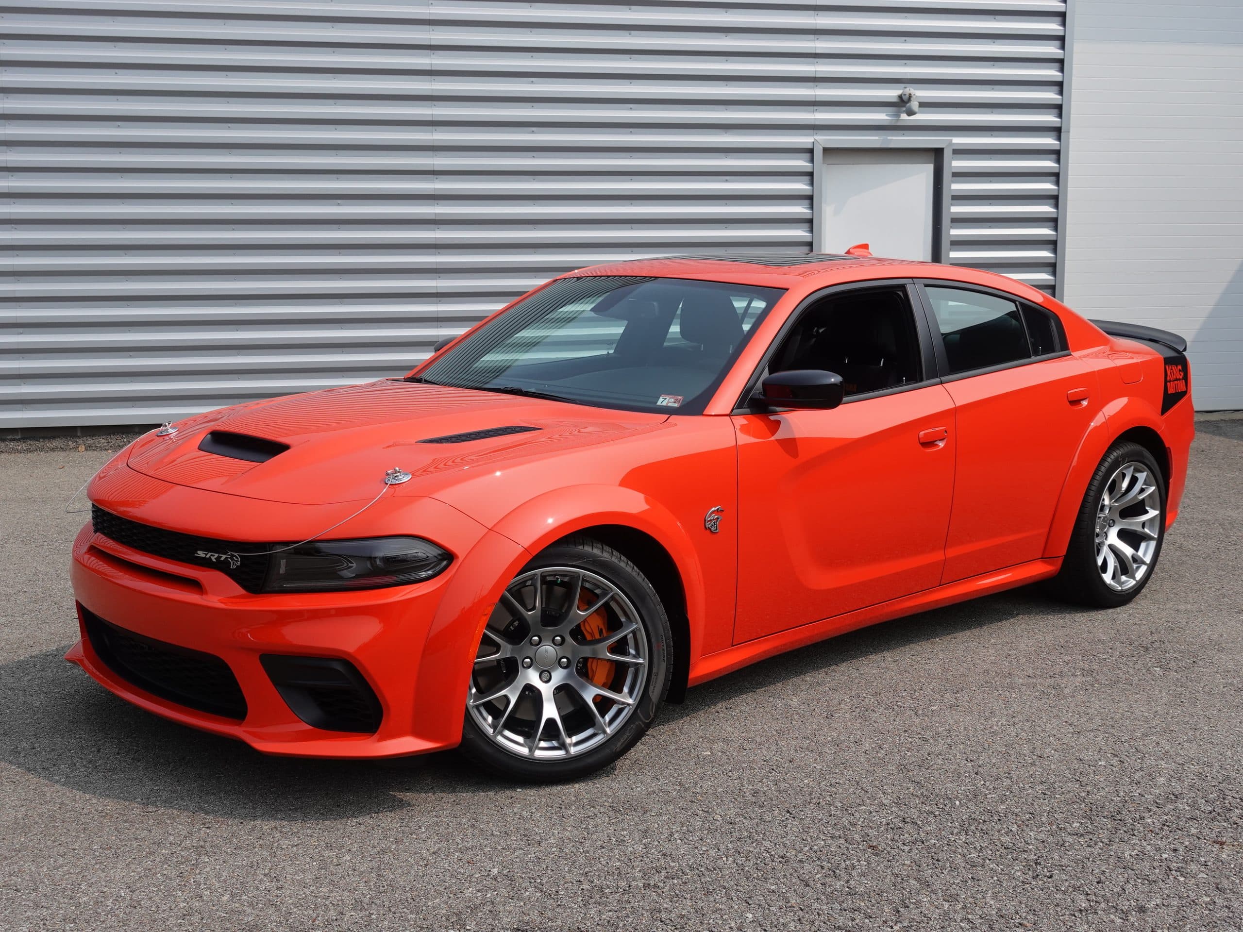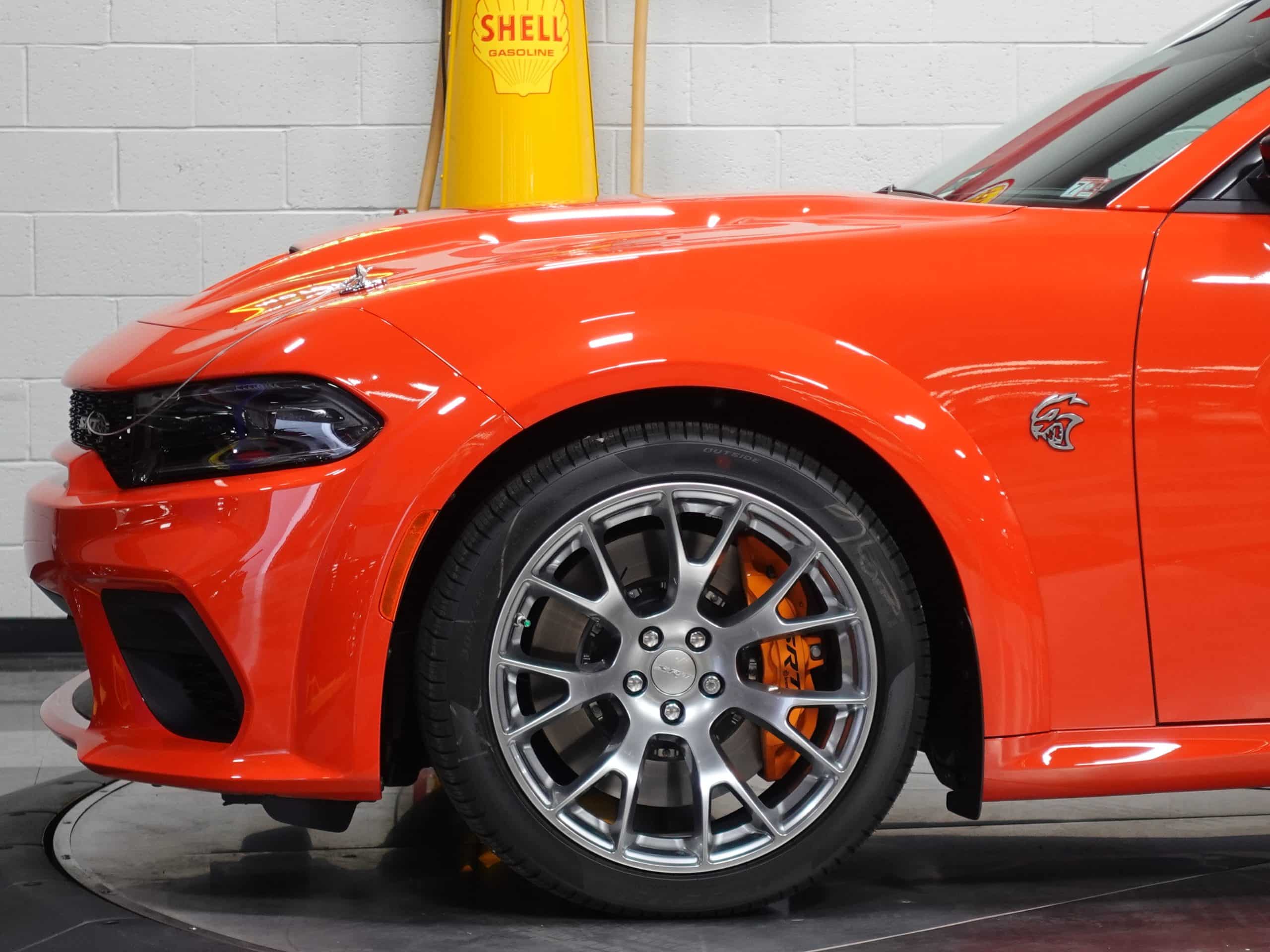 The first supercharged car of the long-anticipated Last Call Editions, this 2023 Dodge Charger King Daytona Special Edition is now available from the MaxMotive Pittsburgh Showroom. The King Daytona is an SRT Hellcat Redeye Widebody with special content, not the least of which is 10 extra horsepower, bringing the total to a brutal 807! Just 300 King Daytonas were built; this one comes with the original window sticker, build sheets, and Factory Shipping Order. The 6.2L Supercharged HO V8 engine works in conjunction with the 8-speed automatic HP90 transmission, after-run chiller, Line Lock Launch Control, Launch Assist, and SRT Configurable Drive Modes to provide adrenaline-rush performance with amazingly smooth, luxurious driveability. The King Daytona is distinguished by its Go Mango exterior paint, King Daytona trunk stripe, orange Brembo brake calipers, front and rear SRT spoilers, and 20”x11” Warp-Speed Satin Carbon Wheels. Inside, it’s appointed with plush Nappa/Alcantara seats with logos, suede door trim, suede headliner, orange interior accent stitch, real carbon fiber interior accents, and an SRT Alcantara Steering Wheel. This example also features the Navigation Group, the Harman/Kardon Audio Group (900 watts and 19 speakers) and a Power Sunroof. The King Daytona pays homage to Big Willie Robinson, a legendary racer and multicultural leader who wheeled a drag race modified Charger Daytona on the streets of Los Angeles during the glory days of muscle. For the Last Call series, Dodge pulled out all the stops to create what is perhaps the ultimate Dodge Charger, and with only 300 produced it is an exclusive automobile offering extreme performance, comfort, and style. The 2023 Dodge Charger King Daytona Special Edition. Please see the detailed photos and videos at www.maxmotive.com.