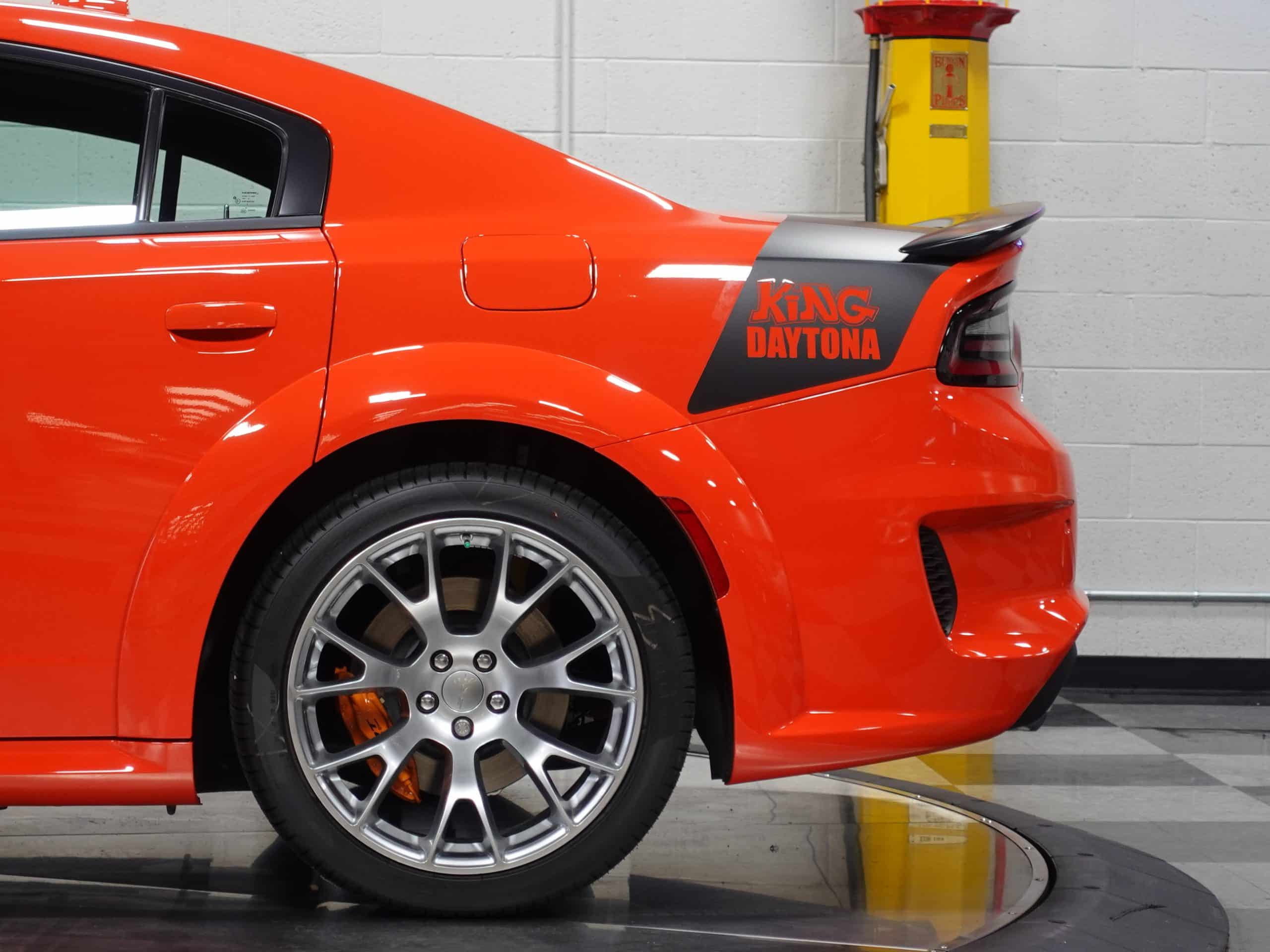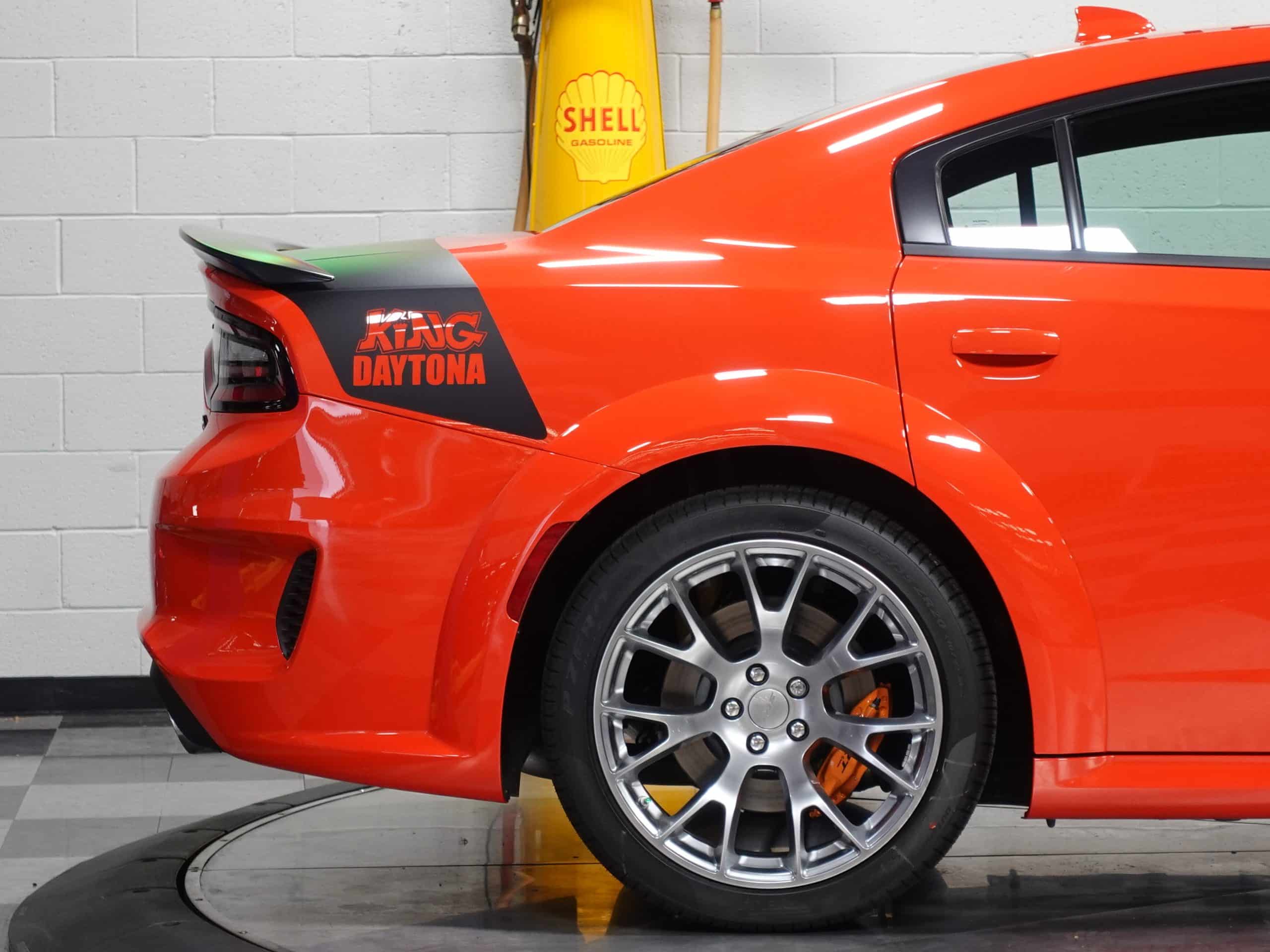 The first supercharged car of the long-anticipated Last Call Editions, this 2023 Dodge Charger King Daytona Special Edition is now available from the MaxMotive Pittsburgh Showroom. The King Daytona is an SRT Hellcat Redeye Widebody with special content, not the least of which is 10 extra horsepower, bringing the total to a brutal 807! Just 300 King Daytonas were built; this one comes with the original window sticker, build sheets, and Factory Shipping Order. The 6.2L Supercharged HO V8 engine works in conjunction with the 8-speed automatic HP90 transmission, after-run chiller, Line Lock Launch Control, Launch Assist, and SRT Configurable Drive Modes to provide adrenaline-rush performance with amazingly smooth, luxurious driveability. The King Daytona is distinguished by its Go Mango exterior paint, King Daytona trunk stripe, orange Brembo brake calipers, front and rear SRT spoilers, and 20”x11” Warp-Speed Satin Carbon Wheels. Inside, it’s appointed with plush Nappa/Alcantara seats with logos, suede door trim, suede headliner, orange interior accent stitch, real carbon fiber interior accents, and an SRT Alcantara Steering Wheel. This example also features the Navigation Group, the Harman/Kardon Audio Group (900 watts and 19 speakers) and a Power Sunroof. The King Daytona pays homage to Big Willie Robinson, a legendary racer and multicultural leader who wheeled a drag race modified Charger Daytona on the streets of Los Angeles during the glory days of muscle. For the Last Call series, Dodge pulled out all the stops to create what is perhaps the ultimate Dodge Charger, and with only 300 produced…